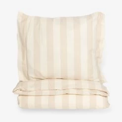 Gestreifter Bettbezug und Kopfkissenbezug aus Bio-Baumwolle. Der Bettbezug hat eine Öffnung an der Unterseite, die mit versteckten Druckknöpfen geschlossen wird. Denke daran, weitere Kissenbezüge hinzuzufügen, wenn du mit mehreren Kissen schläfst.