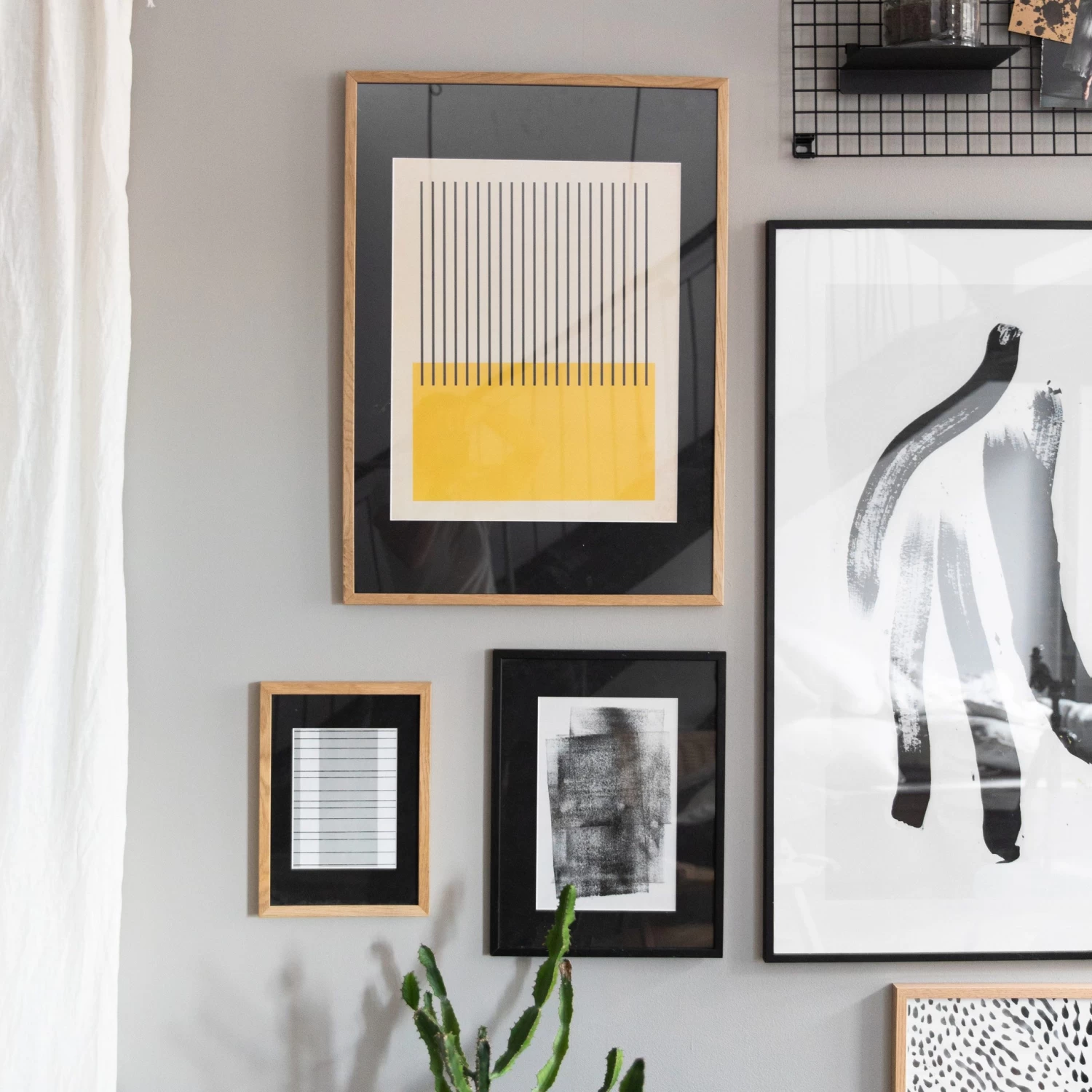 An der Rückseite des Rahmens ist ein Metallbügel angebracht, mit dem du den Rahmen leicht an der Wand befestigen kannst. Schrauben sind nicht enthalten. Verschiedene Wandmaterialien erfordern verschiedene Arten von Befestigungselementen. Verwende die separat erhältlichen Elemente, die zu den Wänden in deinem Zuhause passen. Das Passepartout ist auch separat erhältlich.