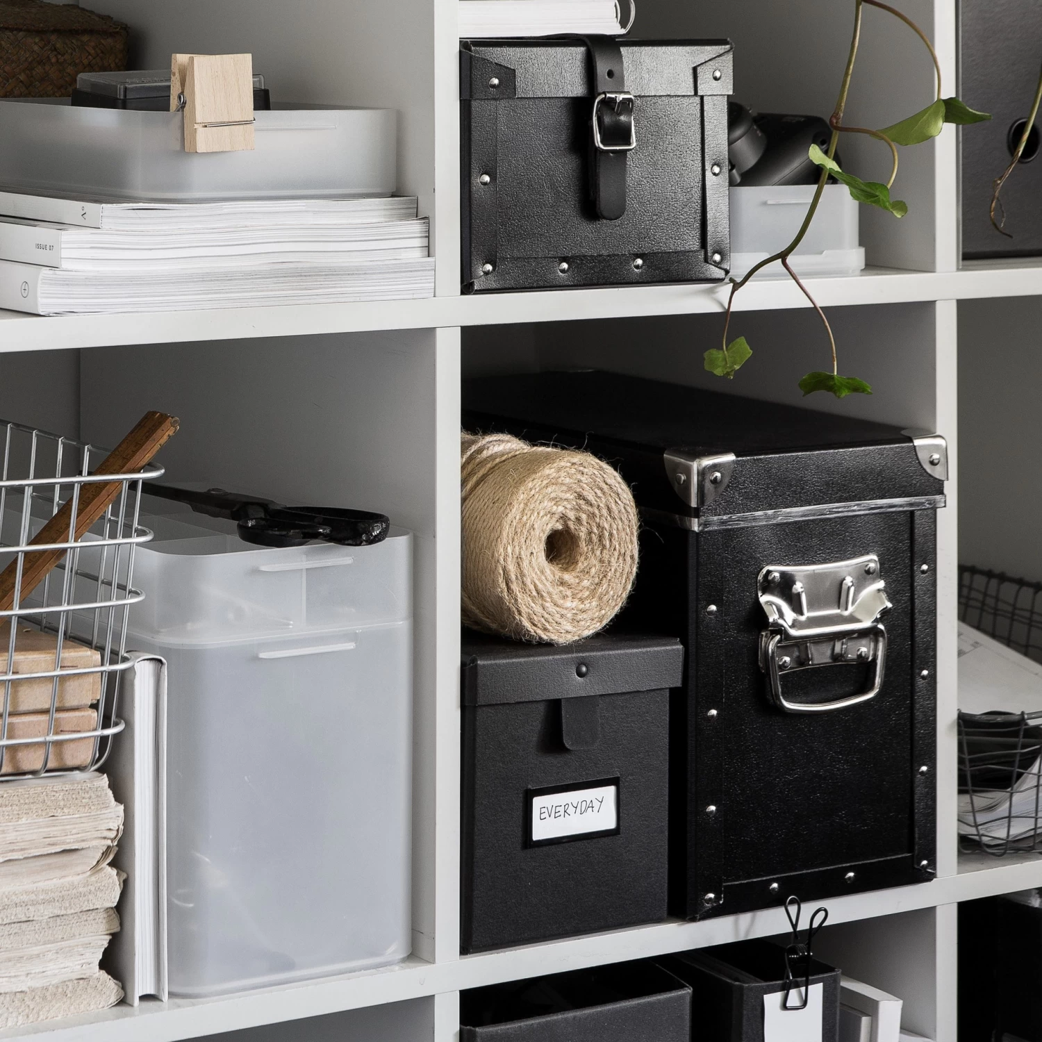 Die schmale Box ist aus Recyclingpappe in Europa hergestellt und an den Kanten von Hand genietet. Außerdem hat sie eine große Lasche aus Leder, wodurch du sie einfach aus dem Regal oder Schrank ziehen kannst. Erhältlich in verschiedenen Größen und Farben.