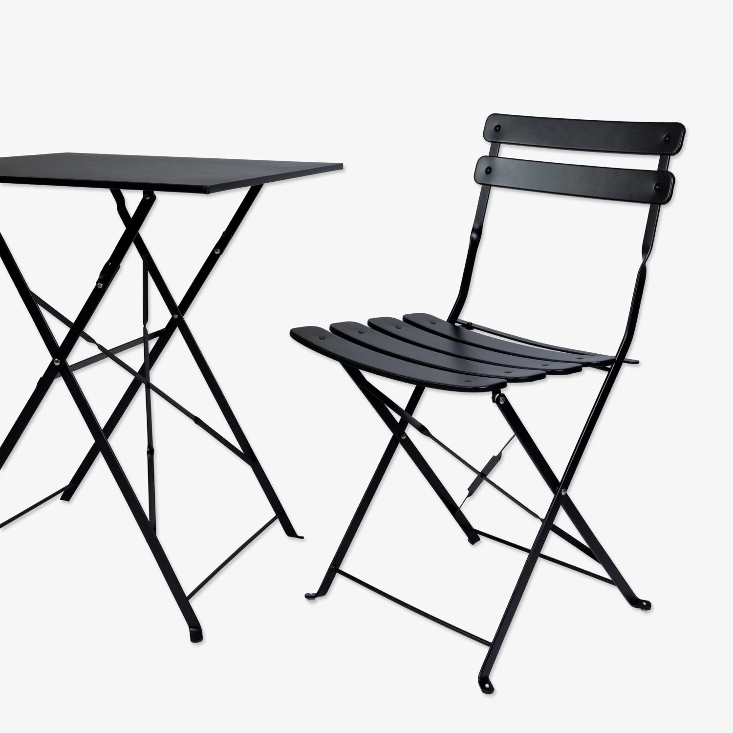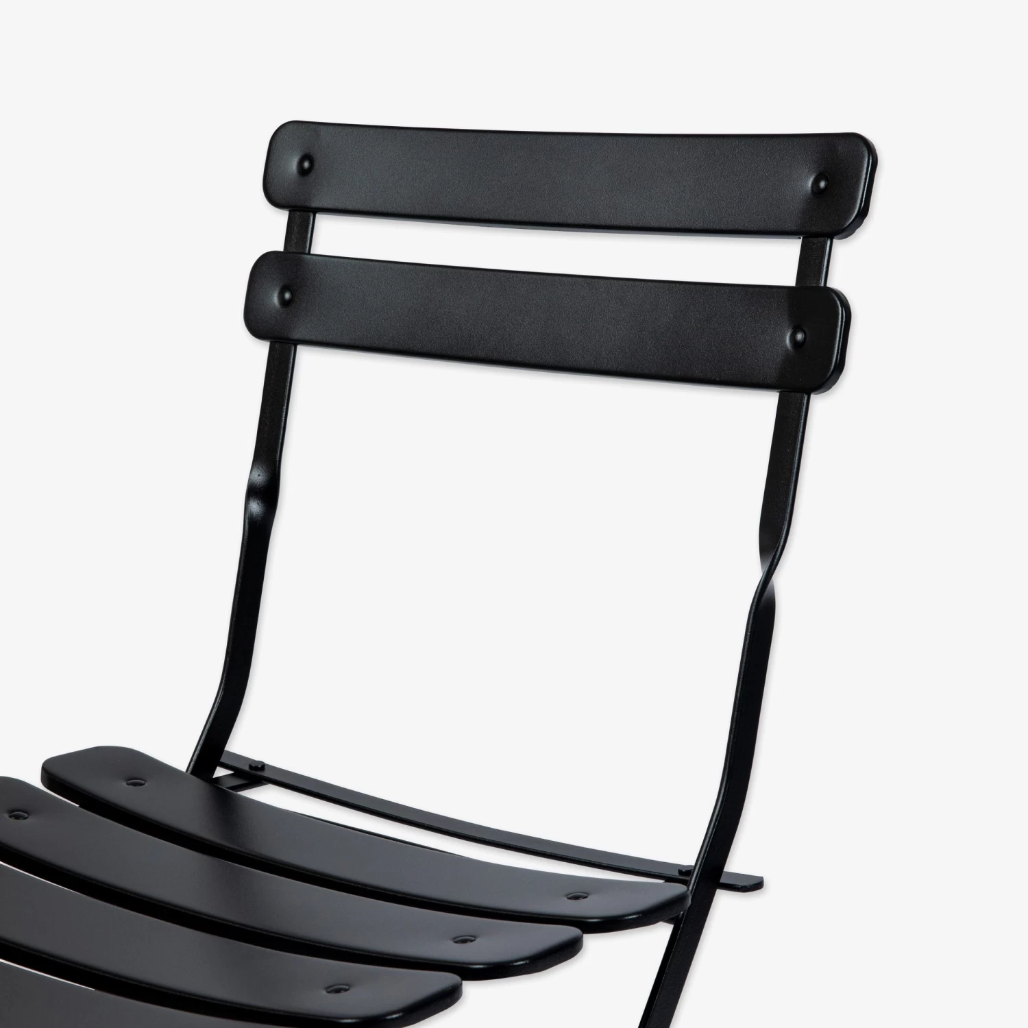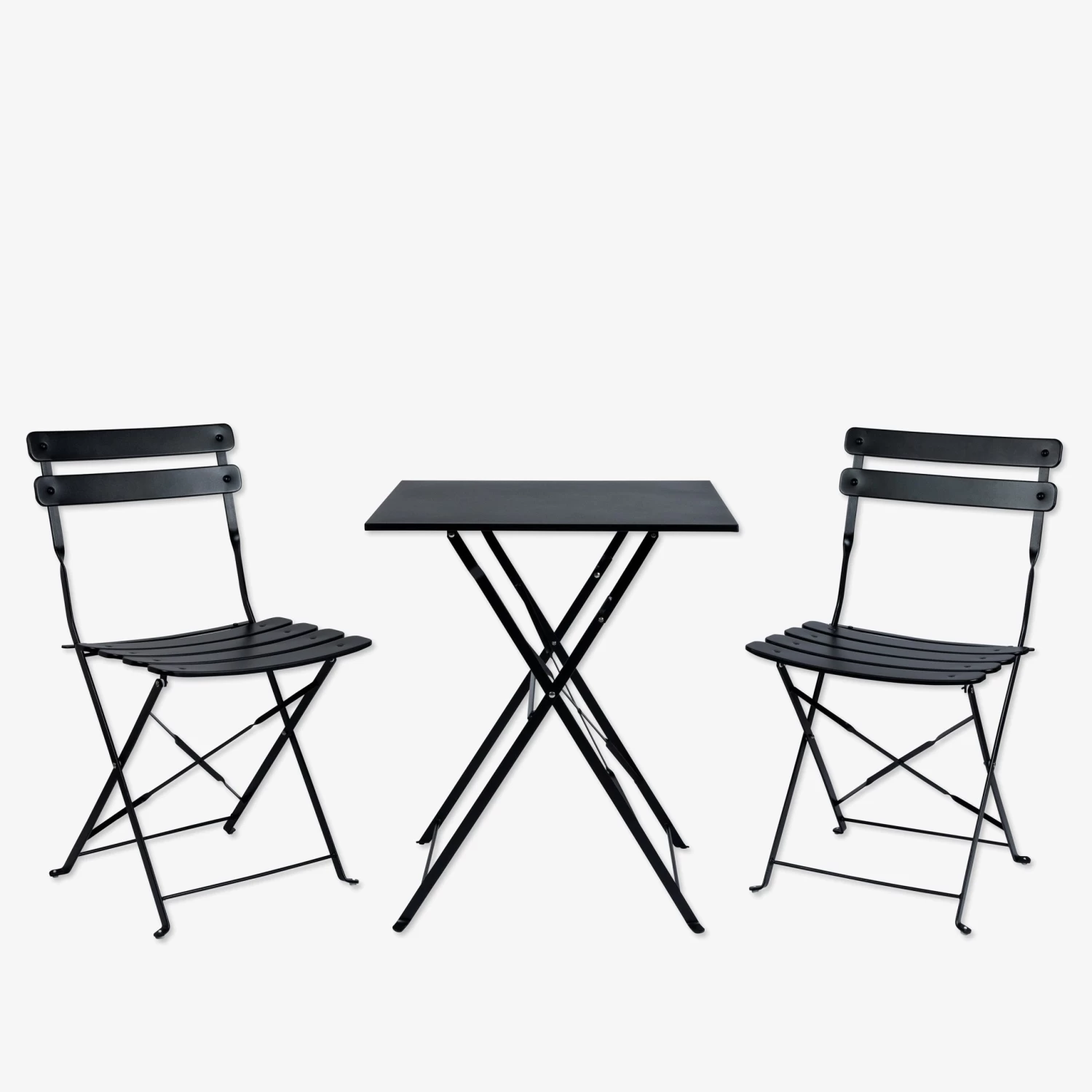 | Klassisches zusammenklappbares Café-Set mit zwei Stühlen und einem Tisch aus schwarz lackiertem Metall. Perfekt für Balkon oder Terrasse! Kombiniere es mit einem Balkontisch, um mehr Stauraum zu schaffen, und einem schicken Teppich, einer Lichterkette und großen Blumentöpfen, um eine schöne kleine Oase zu schaffen. Maße Tisch: 60 x 60 cm H 70 cm.Maße Stuhl: 42 x 50 cm.Gewicht: 15,4 kg |