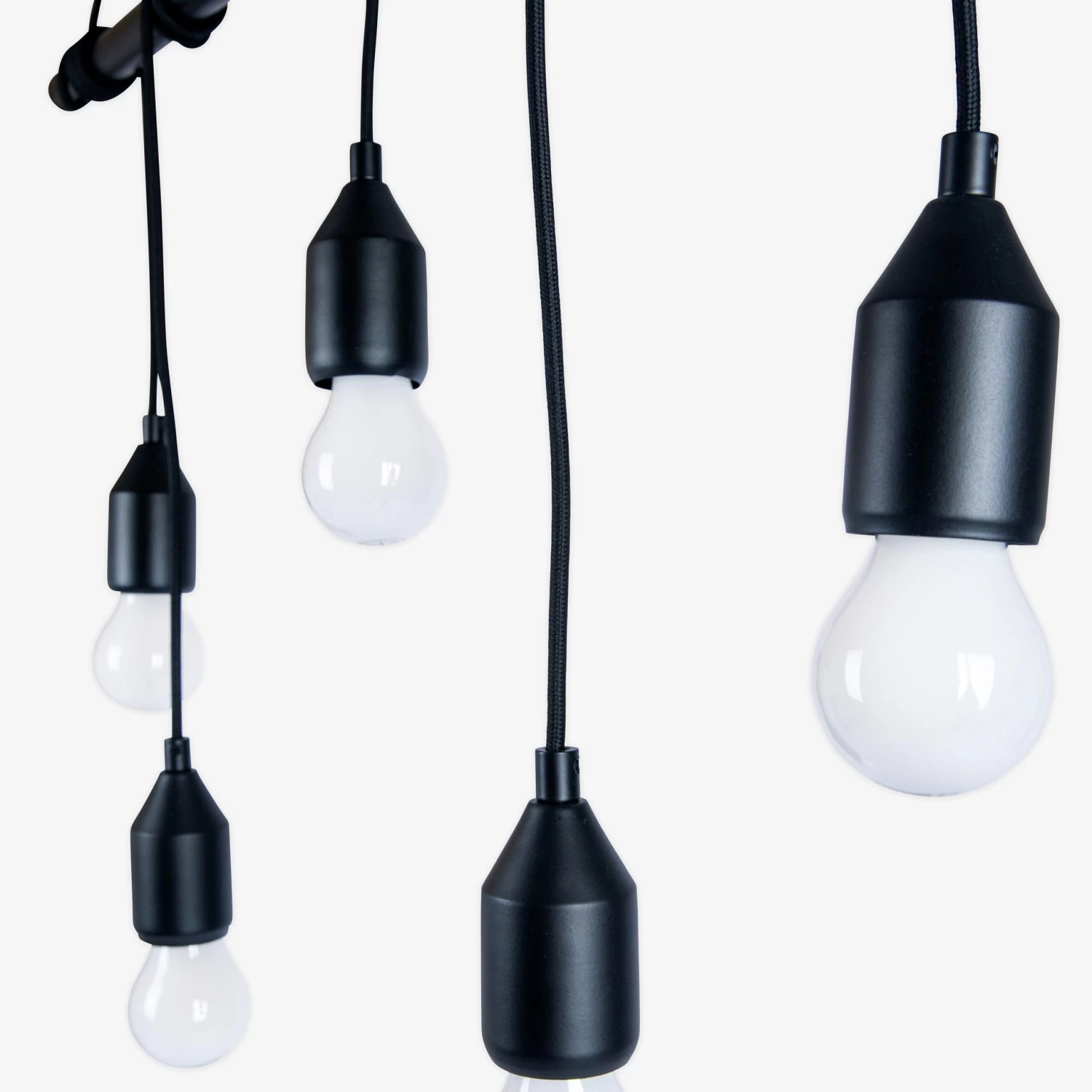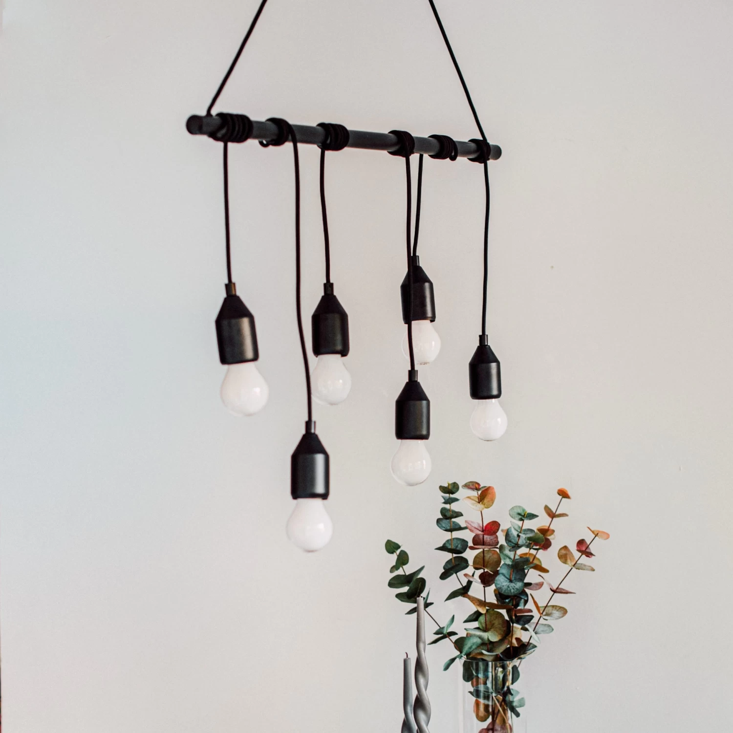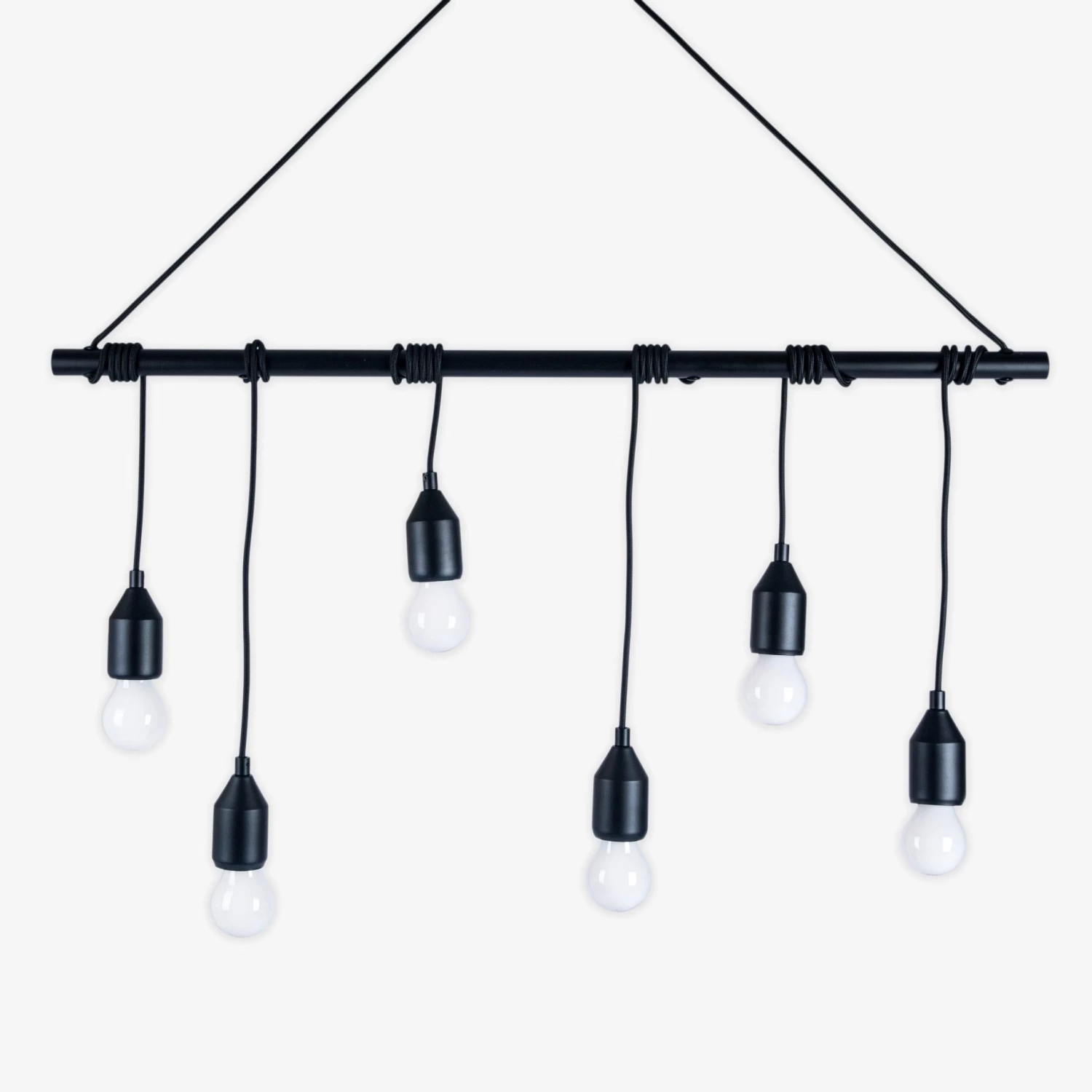 Einzigartige Lampe mit mehreren Lichtquellen, die sich hervorragend über einem Esstisch macht. Die sechs Lichter können nach Belieben in verschiedenen Höhen variiert werden. Maße: 90 x 12 x 90 cm.