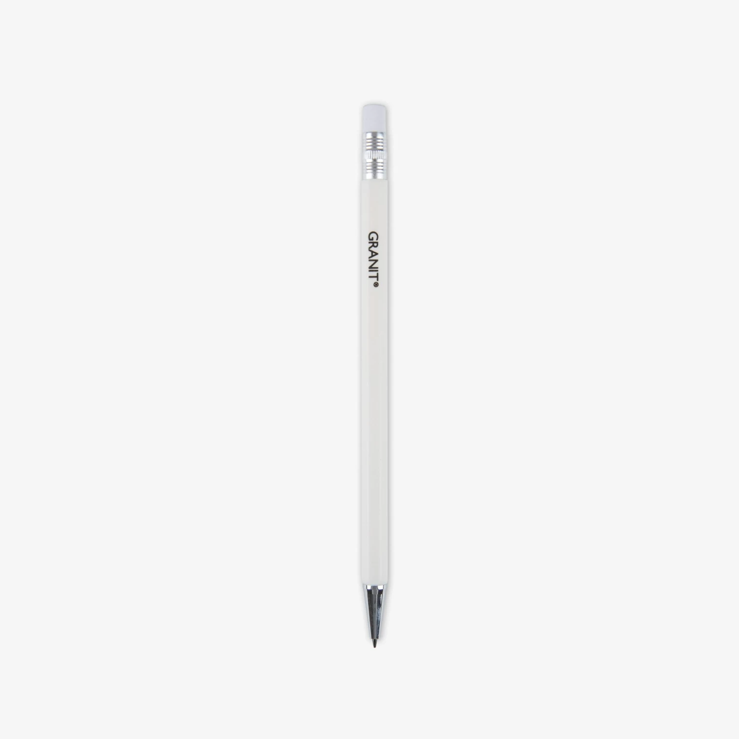 Schwarzer Druckbleistift, der wie ein klassischer Bleistift aussieht, mit weißem Radiergummi am oberen Ende. Der Stift verwendet 0,7-Millimeter-Bleistiftminen. Komplett mit Nachfüllpackung mit 0,7 mm Stiften (Art.-Nr. 400493).