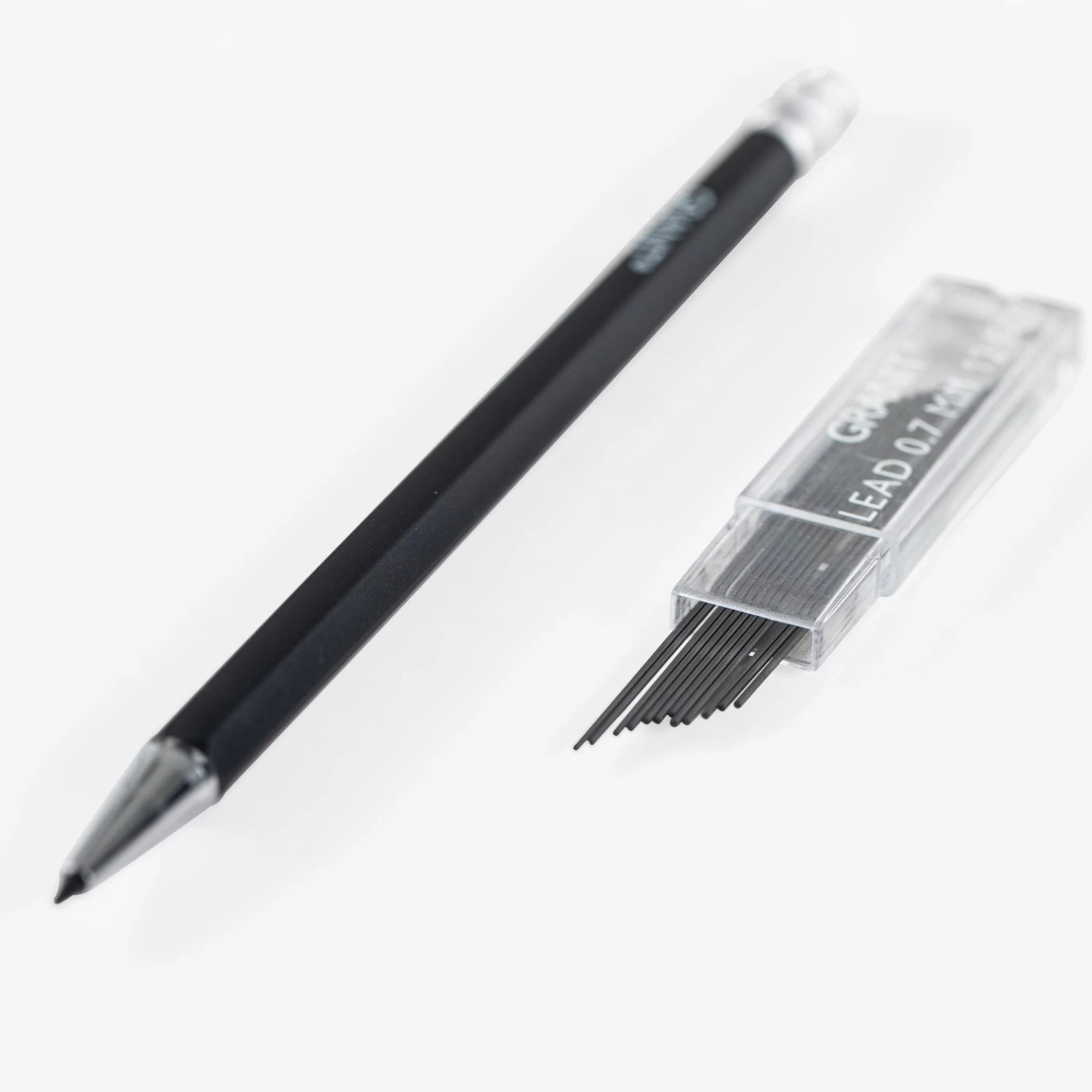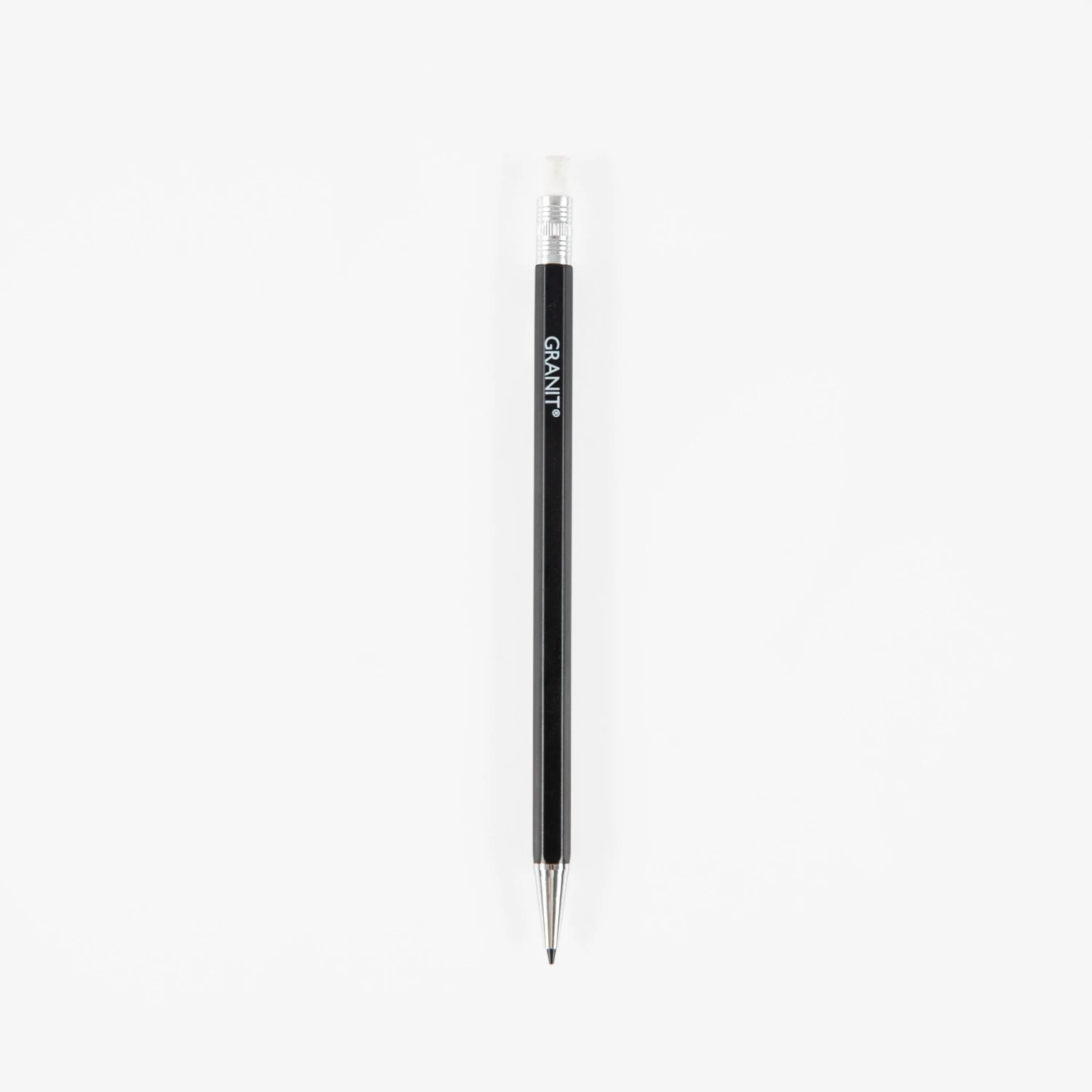 Schwarzer Druckbleistift, der wie ein klassischer Bleistift aussieht, mit weißem Radiergummi am oberen Ende. Der Stift verwendet 0,7-Millimeter-Bleistiftminen. Komplett mit Nachfüllpackung mit 0,7 mm Minen. Der Stift ist aus recyceltem ABS-Kunststoff hergestellt und kann wiederverwertet werden.