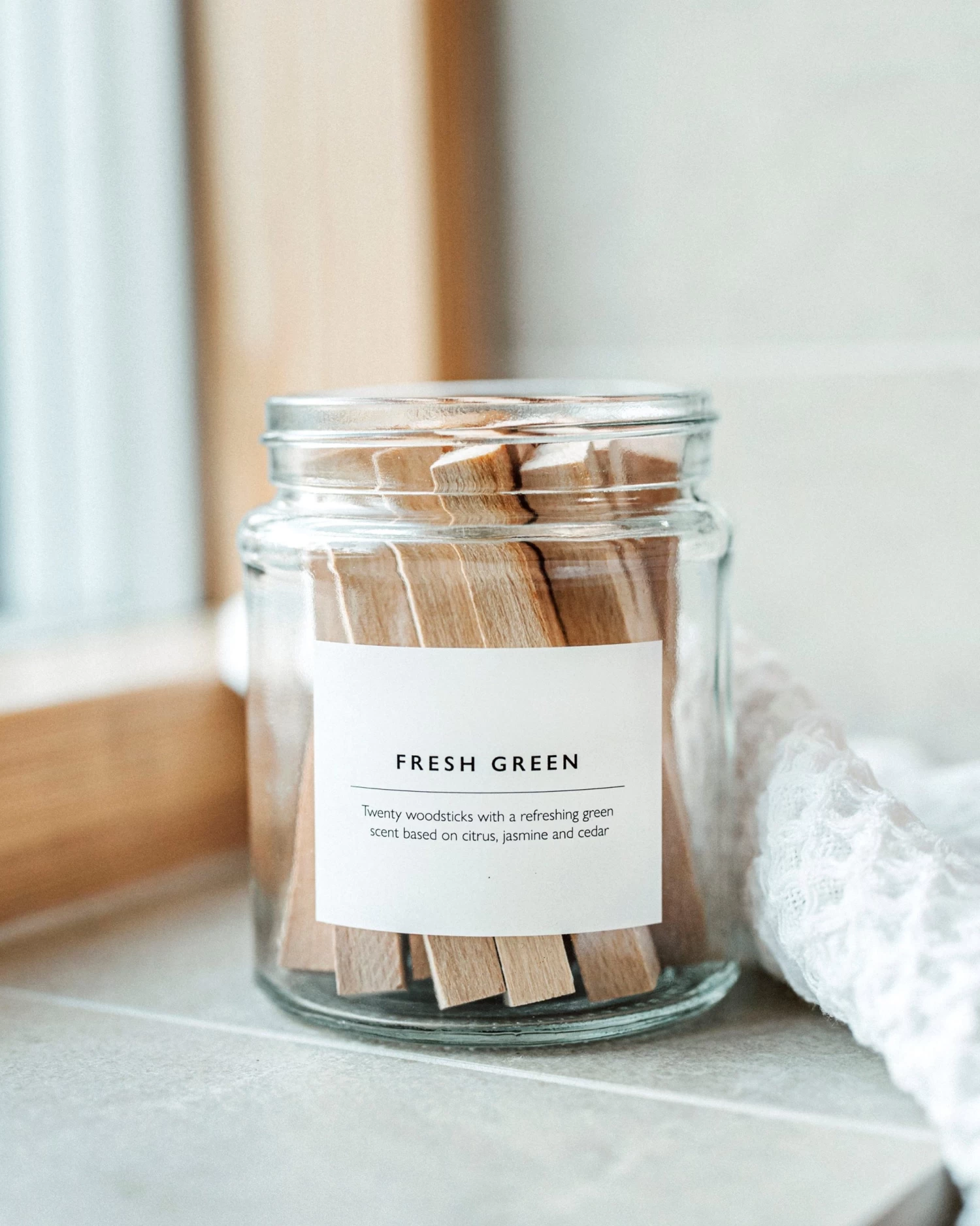 Diffuser in Form eines Glasbehälters mit 20 rechteckigen Duftstäbchen, die einen angenehmen Duft im Raum verbreiten. Der Duft hält sich in dem geöffneten Behälter etwa 6–8 Wochen. Dieser Duft heißt Fresh Green, mit einer Kopfnote, die nach Zitrusfrüchten und grünen Blättern duftet, einer Herznote aus Jasmin und Galbanum und einer Basisnote aus Zedernholz und Moos.