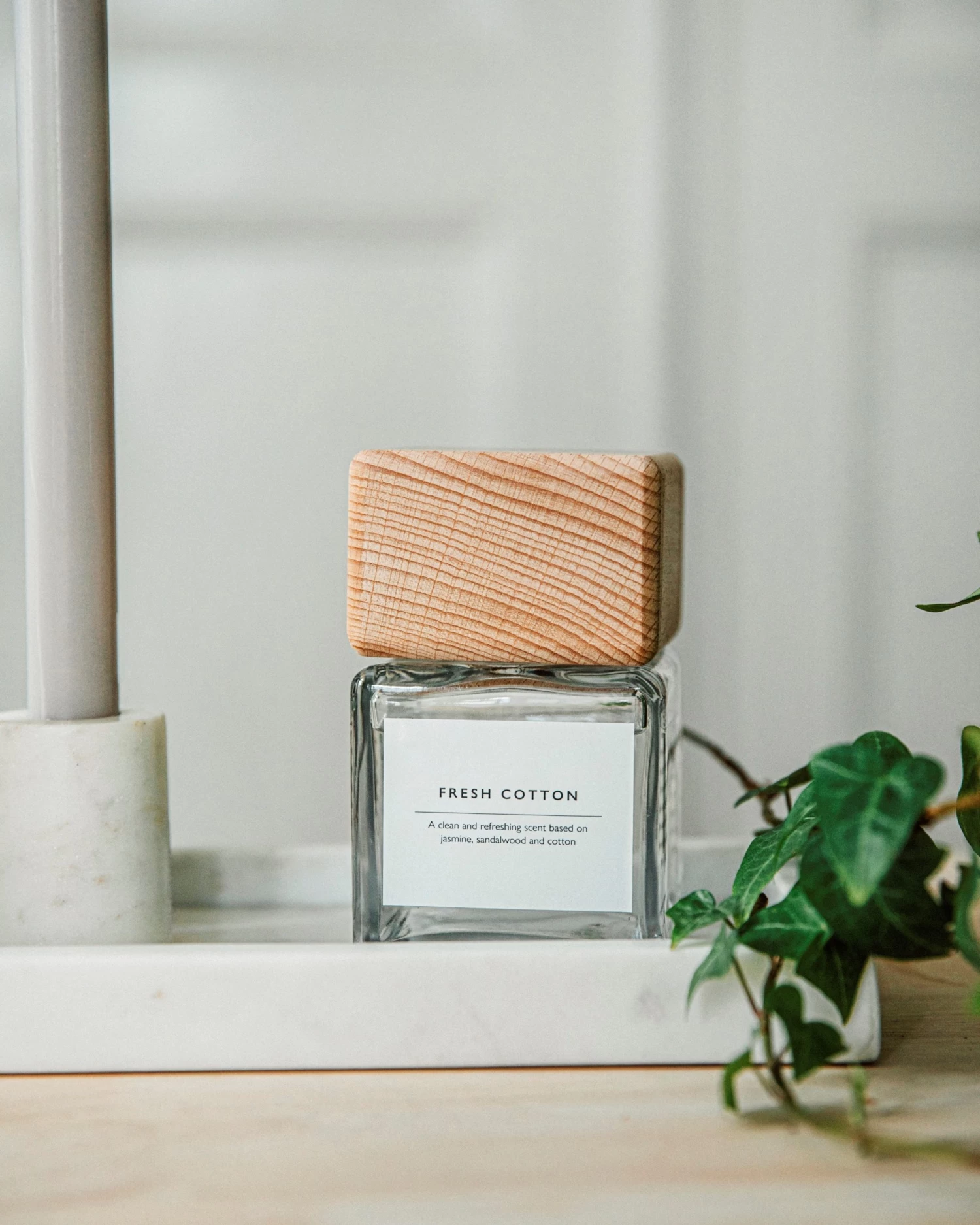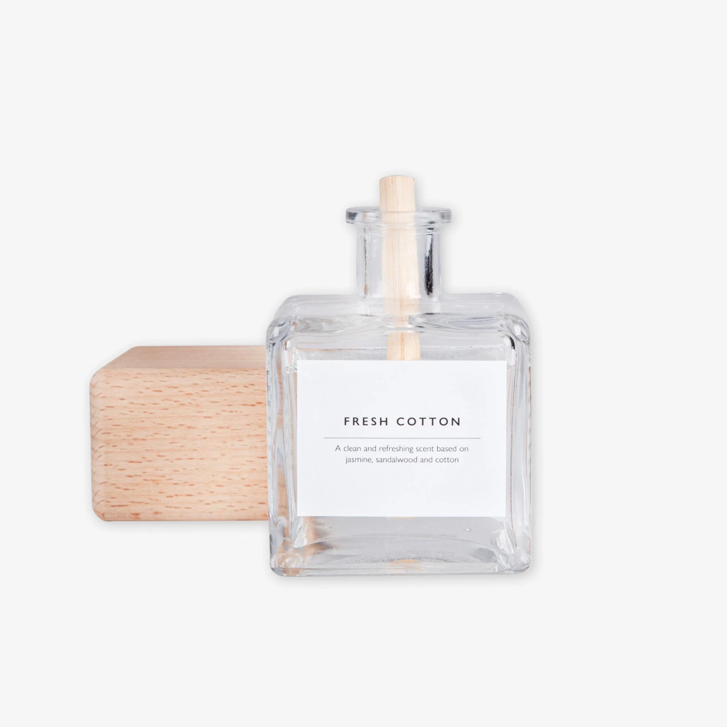 Ein stabiler Diffusor mit einem großen Duftstab, 200 ml Fresh Cotton Duftöl und einem dekorativen Holzdeckel aus FCS-zertifiziertem Buchenholz. Fresh Cotton verströmt einen frischen Duft von Zitrusfrüchten und Blumen mit einer Basis aus Vanille und Holz. Der Duft hält sich in dem geöffneten Behälter etwa 6-8 Wochen.Inhaltsstoffe: (3,7-Dimethyloctan-3-ol; 2-Benzyliden-Octanal; 1-(2,3,8,8-Tetramethyl-1,2,3,4,5,6,7,8-octahydronaphthalin-2-yl)ethanon; 2E-3,7-Dimethylocta-2,6-dien-1-ol). Kann eine allergische Reaktion hervorrufen.