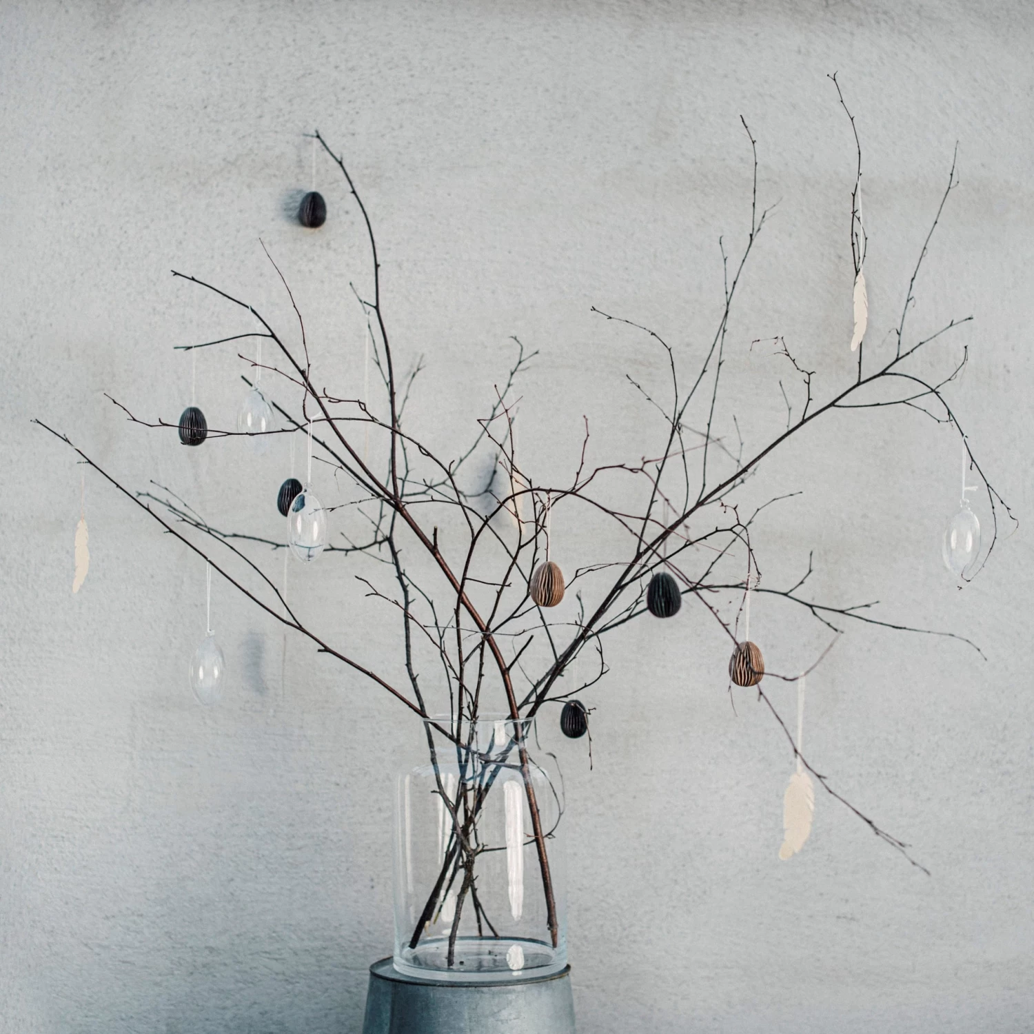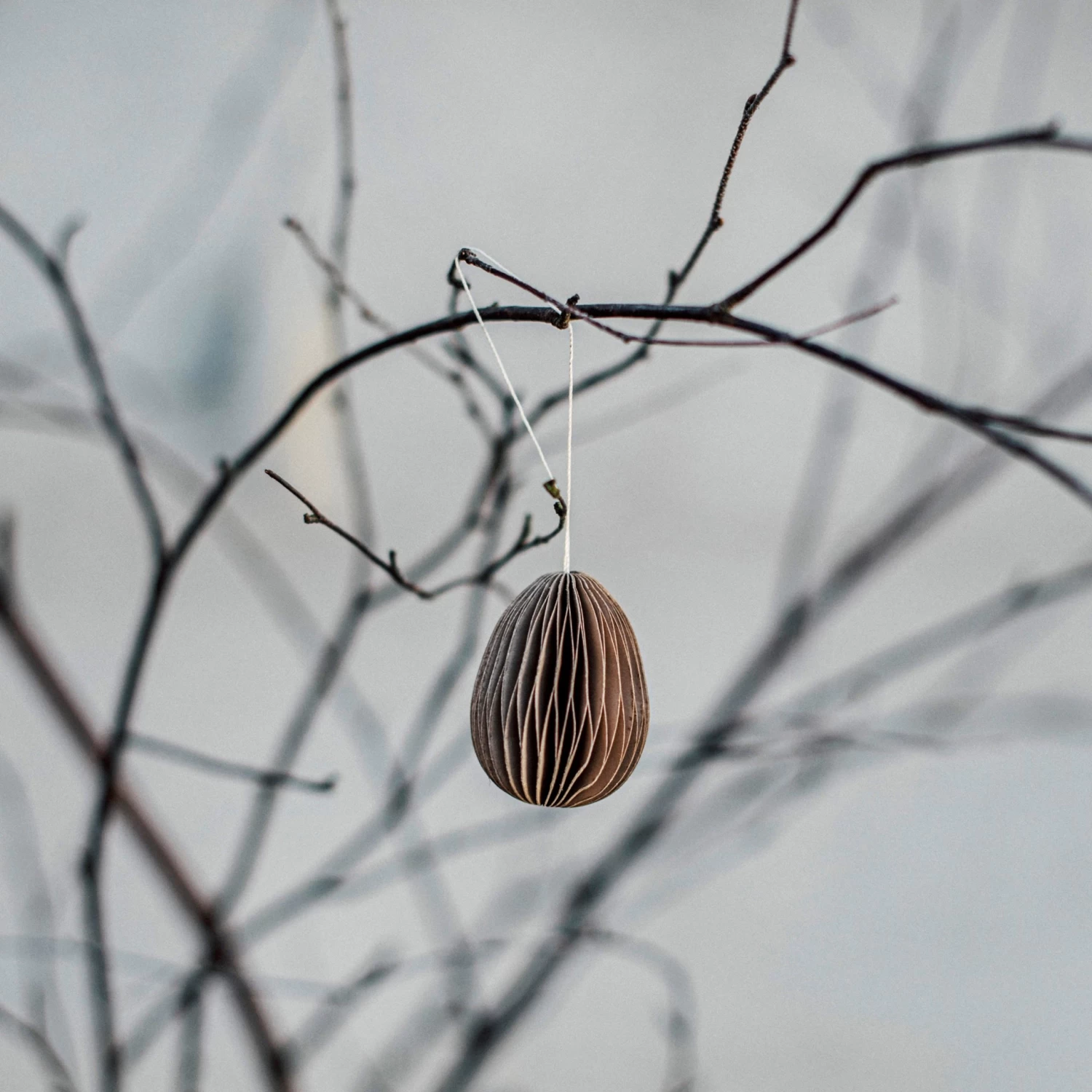 Stilrena påskägg i återvunnet papper till dekoration av påskris. Förpackningen innehåller 6 ägg för upphängning i sobra naturliga färger. Äggen är 3×4 cm.