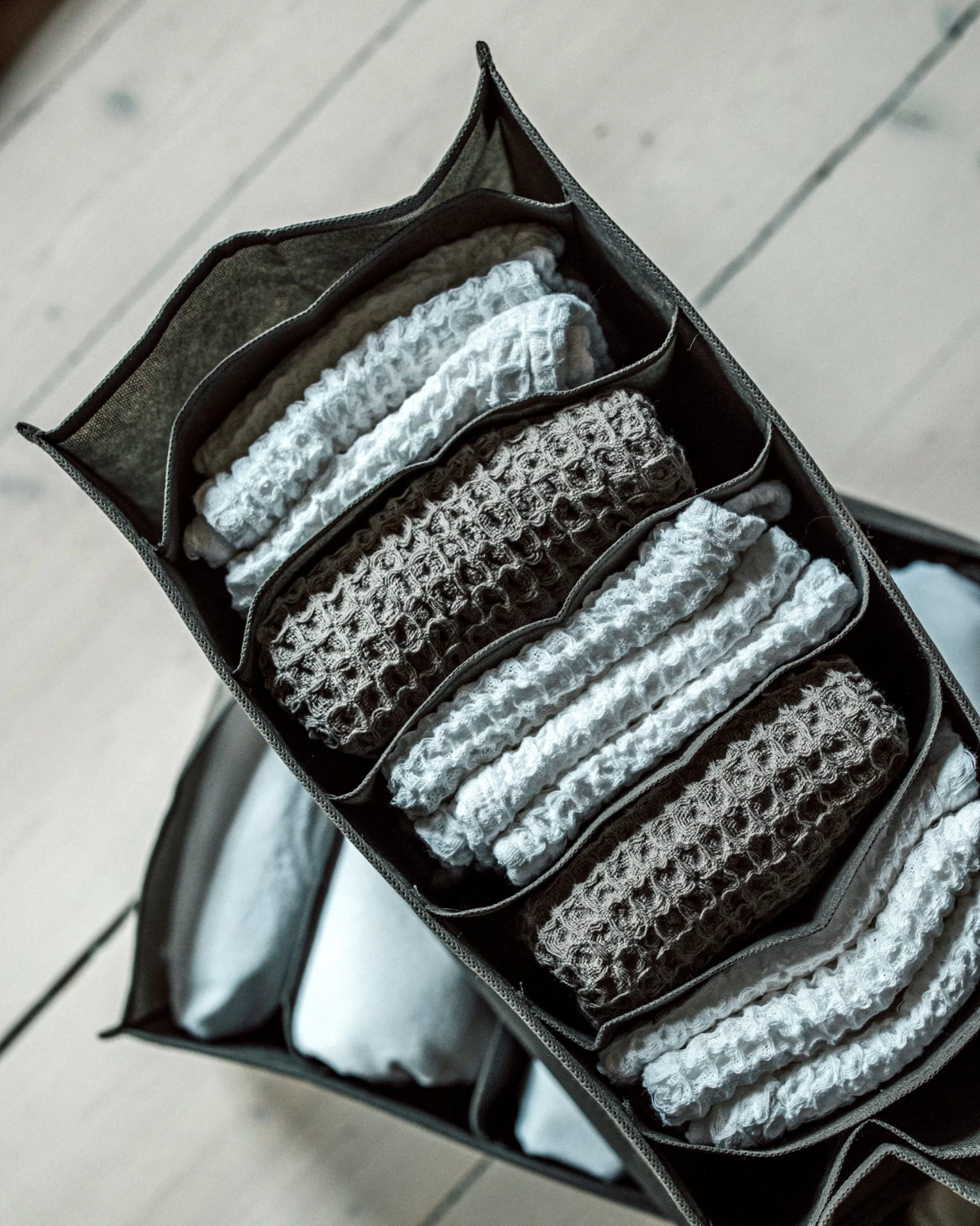 Smarte faltbare Aufbewahrungsbox mit 8 verschiedenen Fächern aus 100 % recyceltem PET. In den Fächern kannst du zum Beispiel kleine Handtücher oder andere Dinge aufbewahren, die du ordentlich verstauen möchtest. Auch in einer größeren Größe erhältlich.