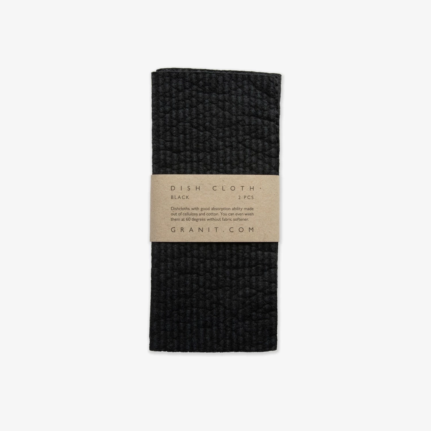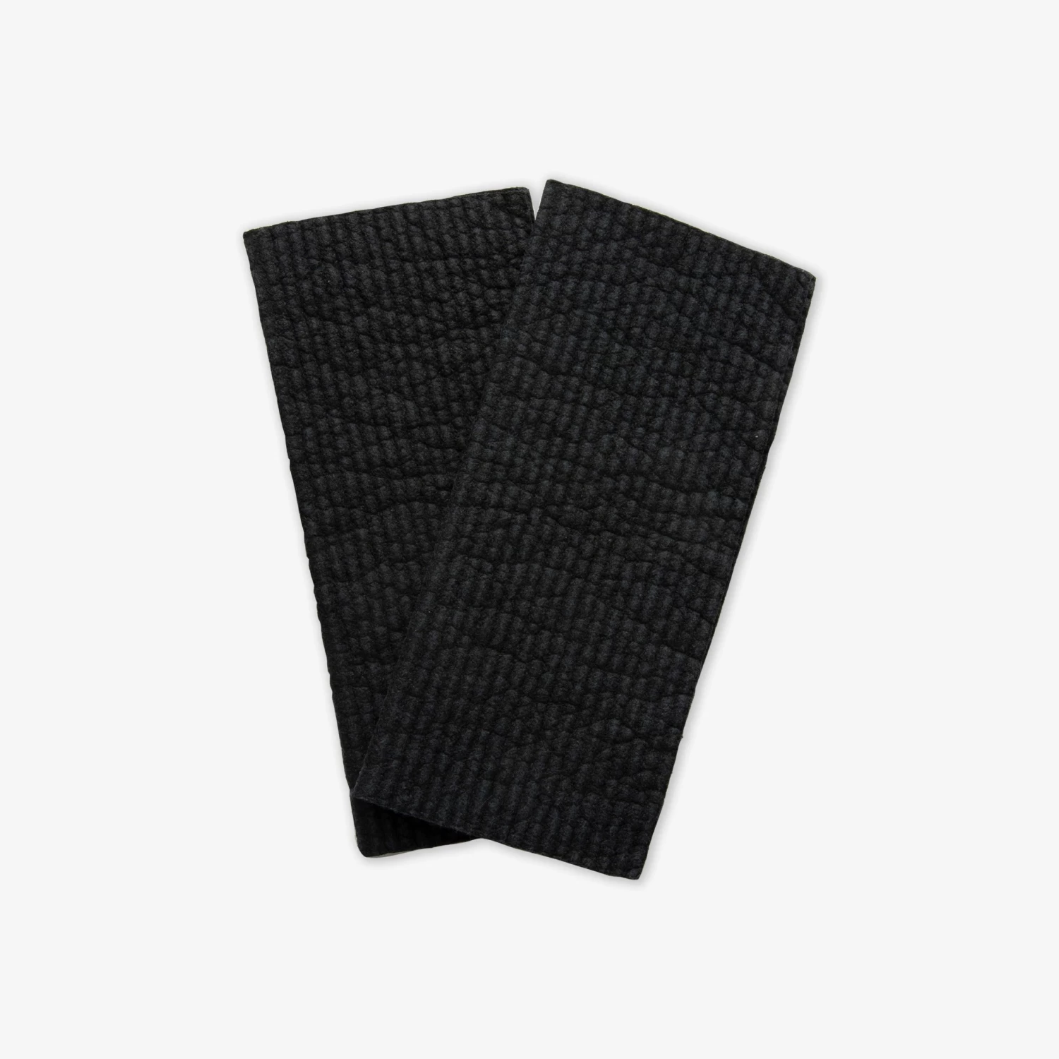 Ein 2er-Pack schwarze Geschirrtücher. Die Geschirrtücher sind biologisch abbaubar und bestehen aus 70 % Zellulose und 30 % Baumwolle.