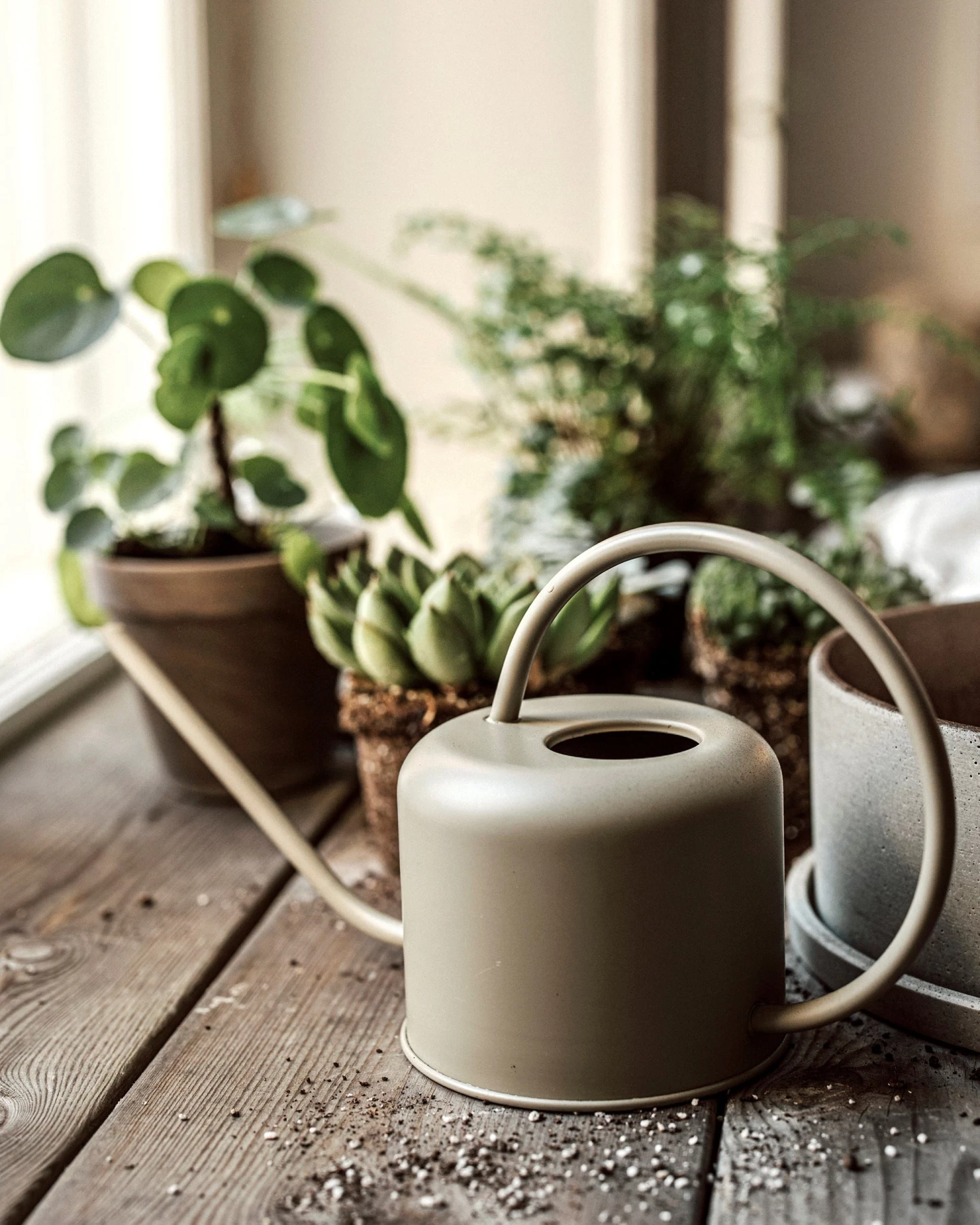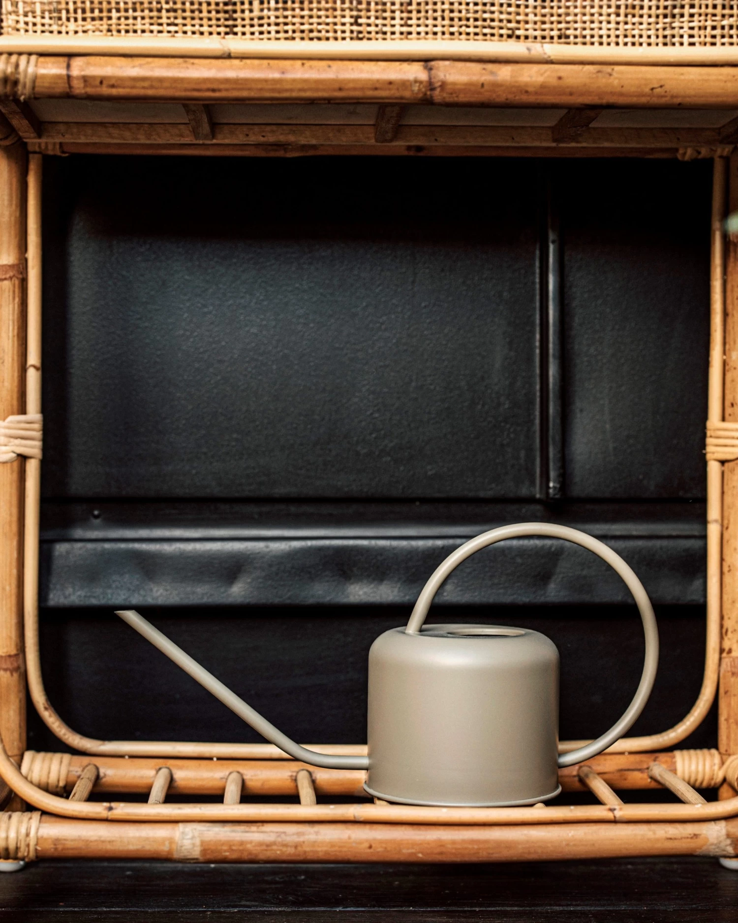 Helle khaki-grüne, pulverbeschichtete Metallgießkanne, die sowohl dekorativ als auch funktional ist. Der lange, schmale Ausguss erleichtert das Gießen, ohne dass etwas daneben geht. Die Kanne fasst 900 ml.