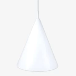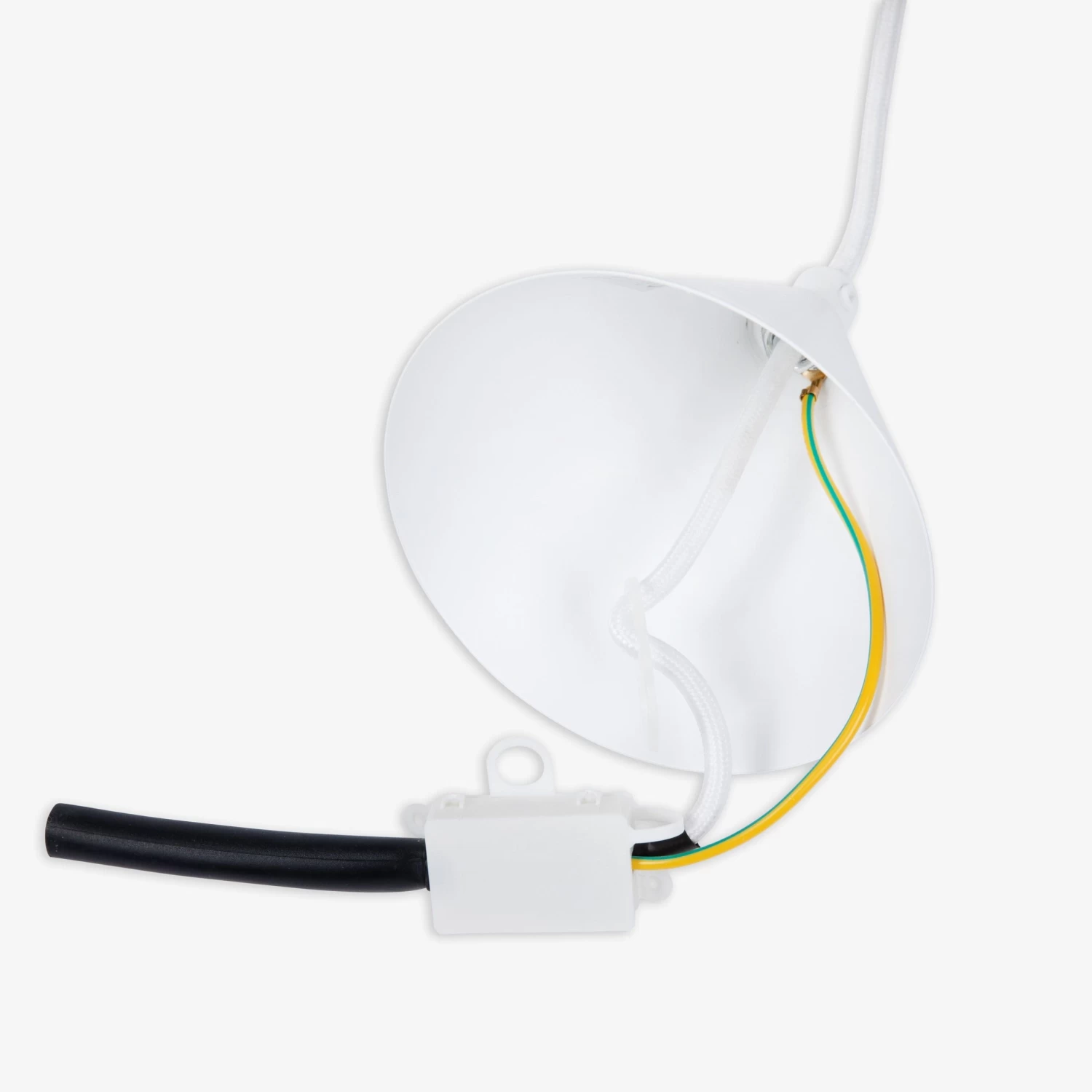 Stilvolle und ästhetische Deckenleuchte aus mattweiß lackiertem Metall. 120 cm weißes textilummanteltes Kabel, kegelförmige Deckenabdeckung und Verbindung im Lieferumfang enthalten. Lichtquelle und Deckenanschluss sind separat erhältlich.