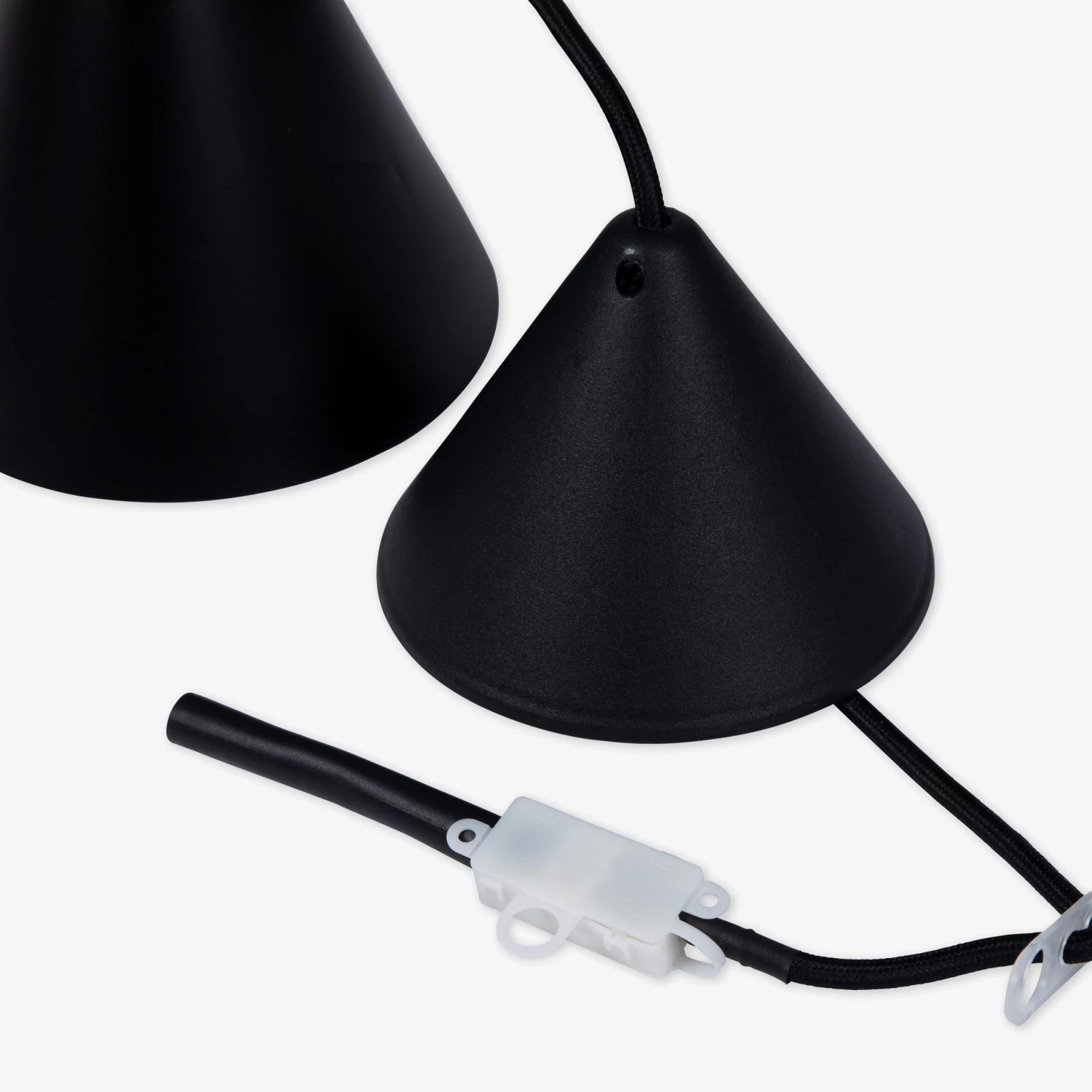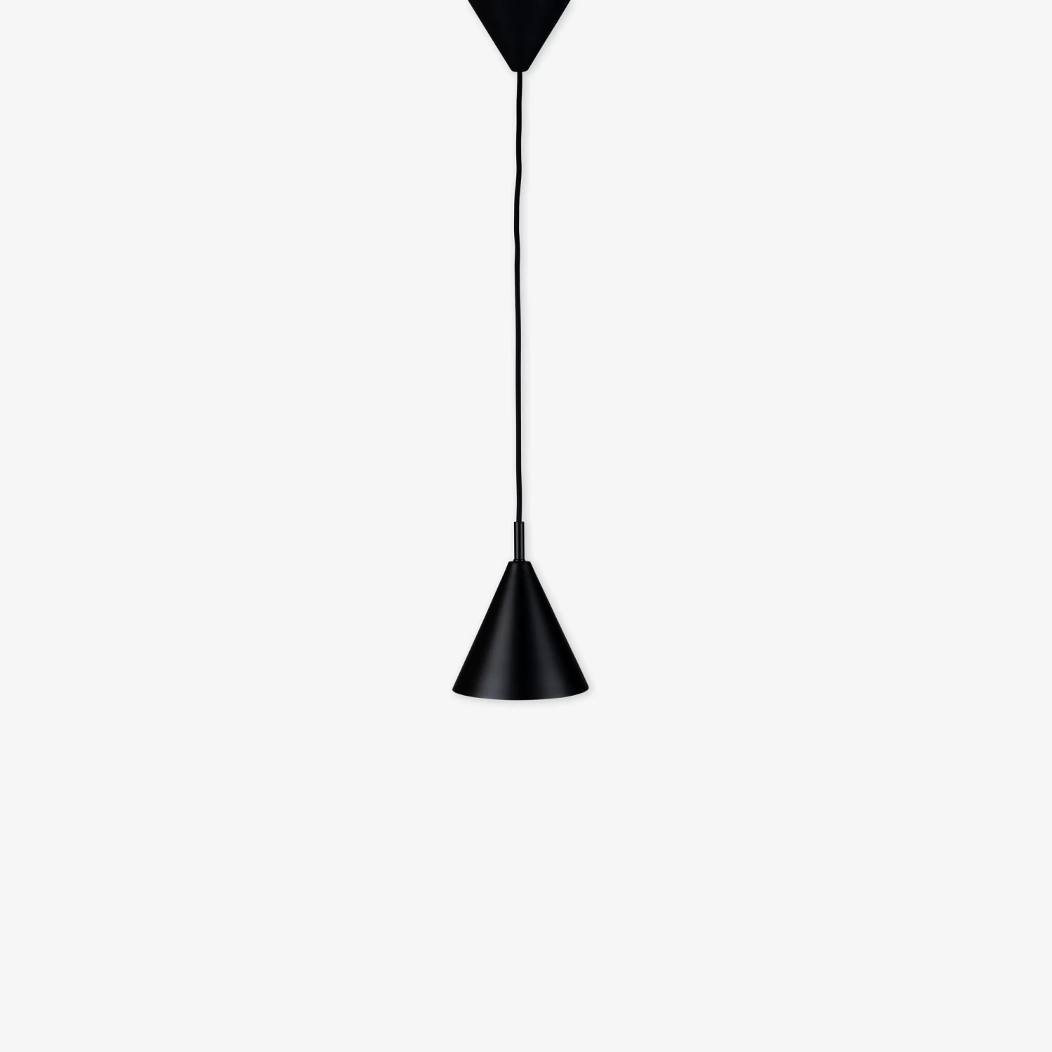 Stilvolle Deckenleuchte aus schwarz matt lackiertem Metall. 120 cm schwarzes textilummanteltes Kabel, kegelförmige Deckenabdeckung und Verbindung im Lieferumfang enthalten. Lichtquelle und Deckenanschluss sind separat erhältlich.