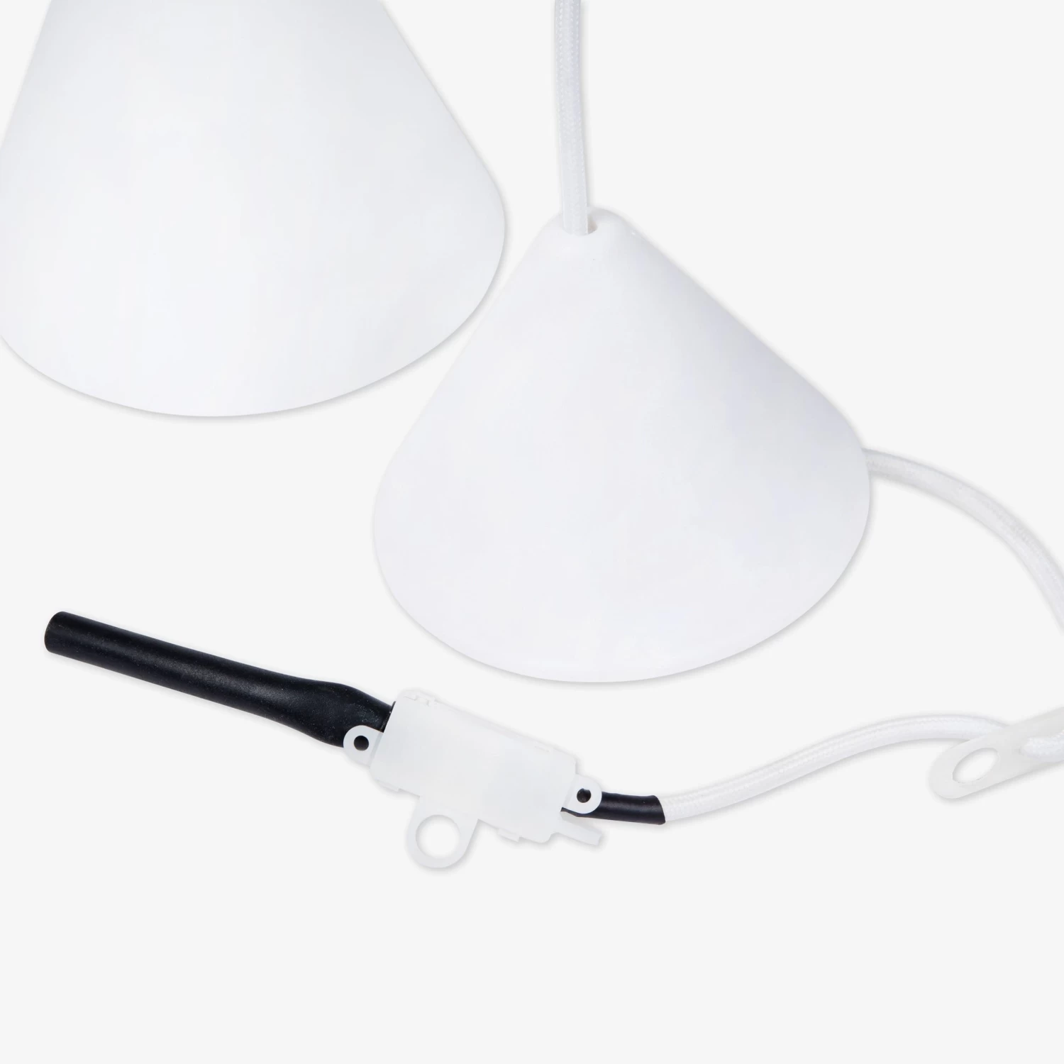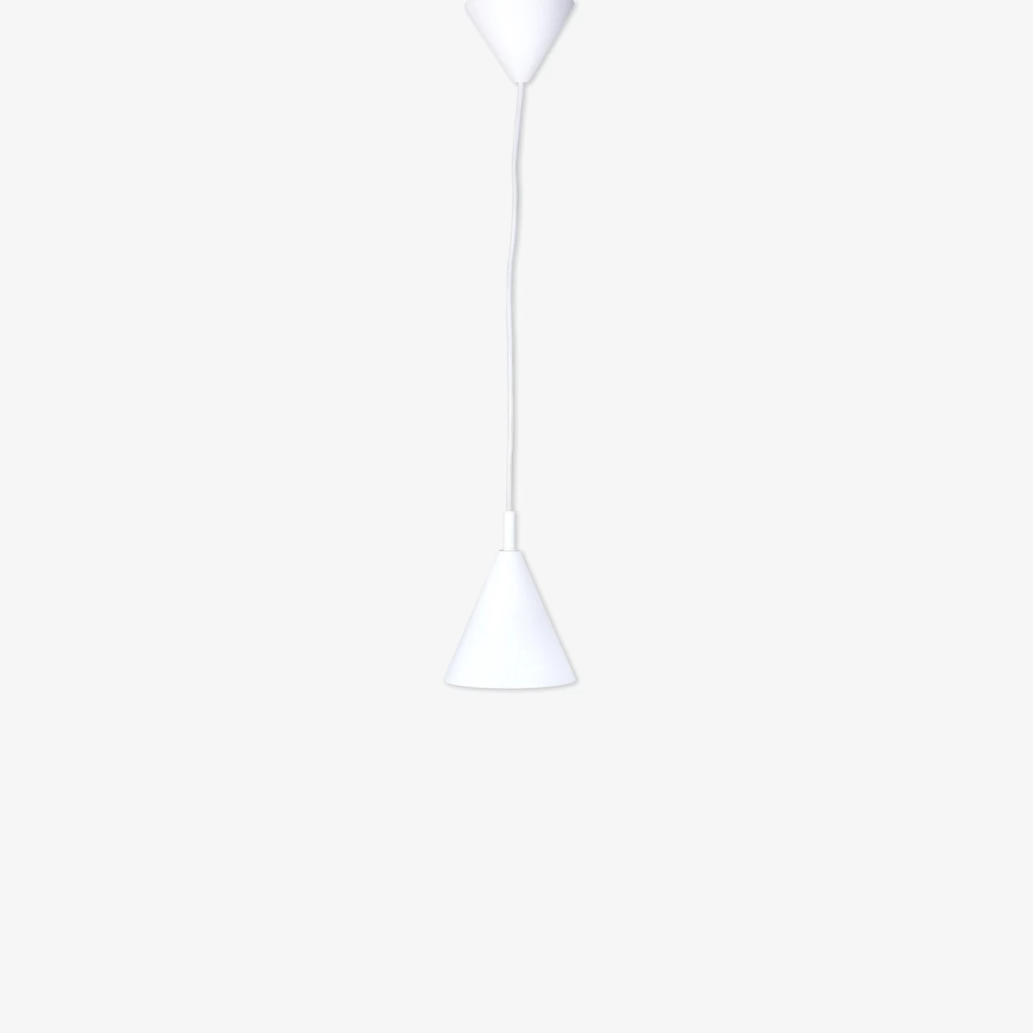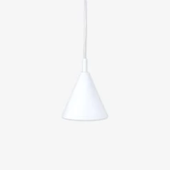 Stilvolle weiße Deckenleuchte matt lackiertem Metall. 120 cm weißes textilummanteltes Kabel, kegelförmige Deckenabdeckung und Verbindung im Lieferumfang enthalten. Lichtquelle und Deckenanschluss sind separat erhältlich. Auch in einer größeren Größe erhältlich.