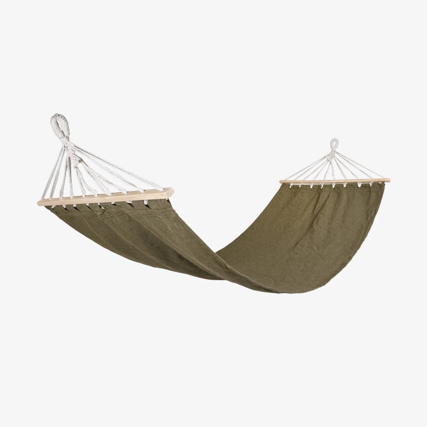Khakifarbene und stilvolle Hängematte. Das perfekte Geschenk für den Frühling oder für sich selbst! Leicht zu transportieren und mitzunehmen. Die Hängematte ist aus langlebigem und strapazierfähigem Polycotton gefertigt, einer Mischung aus 70 % Baumwolle und 30 % Polyester. Höchstgewicht: 120 kg.