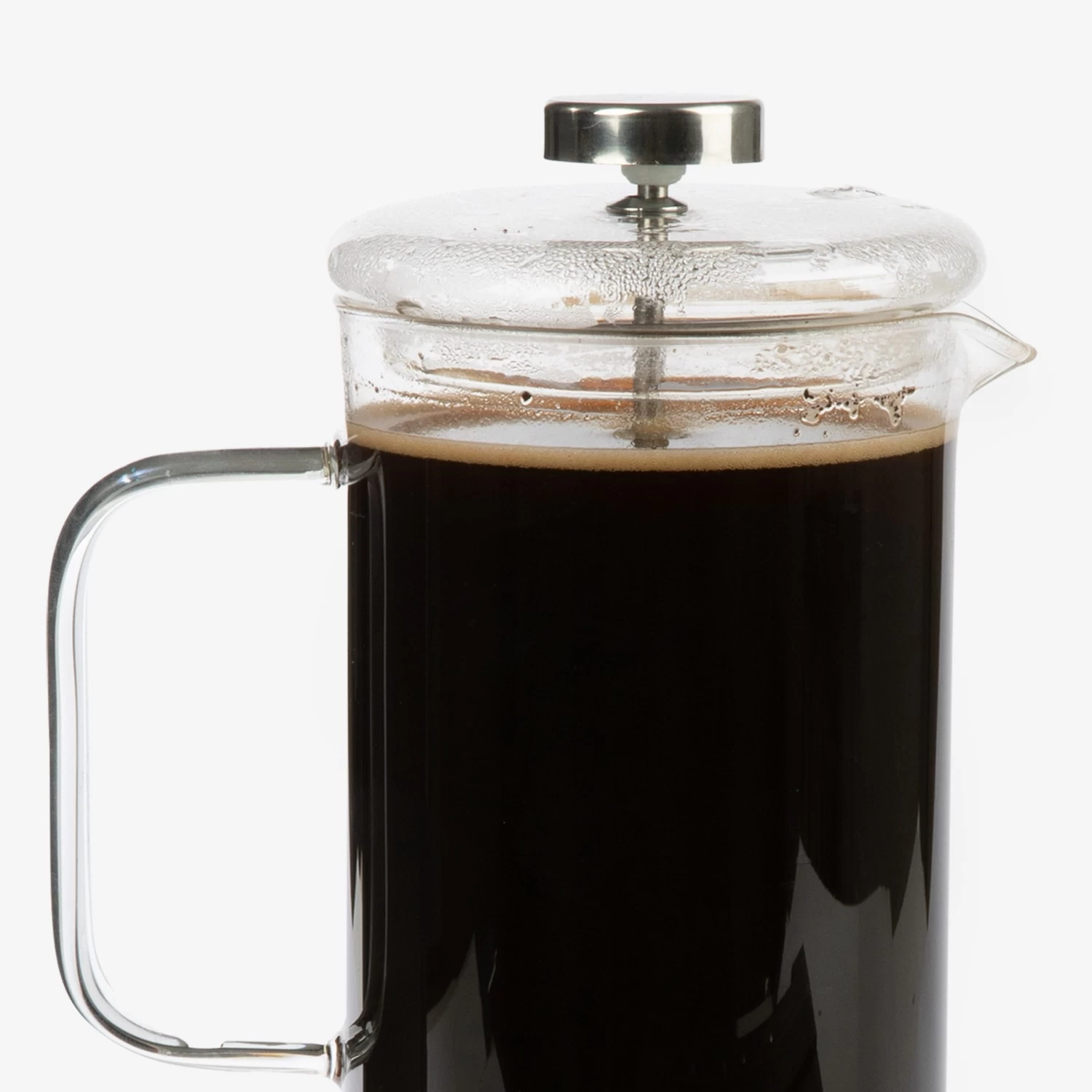 Kaffeepresse aus Glas und rostfreiem Stahl. In einer Kaffeepresse wird der Kaffee vollständig im Wasser gebrüht und dann durch einen Metallfilter gefiltert. Es entstehen mehr Kaffeeöle und andere Aromastoffe im Kaffee als bei der Zubereitung mit einer normalen Kaffeemaschine mit Papierfilter.