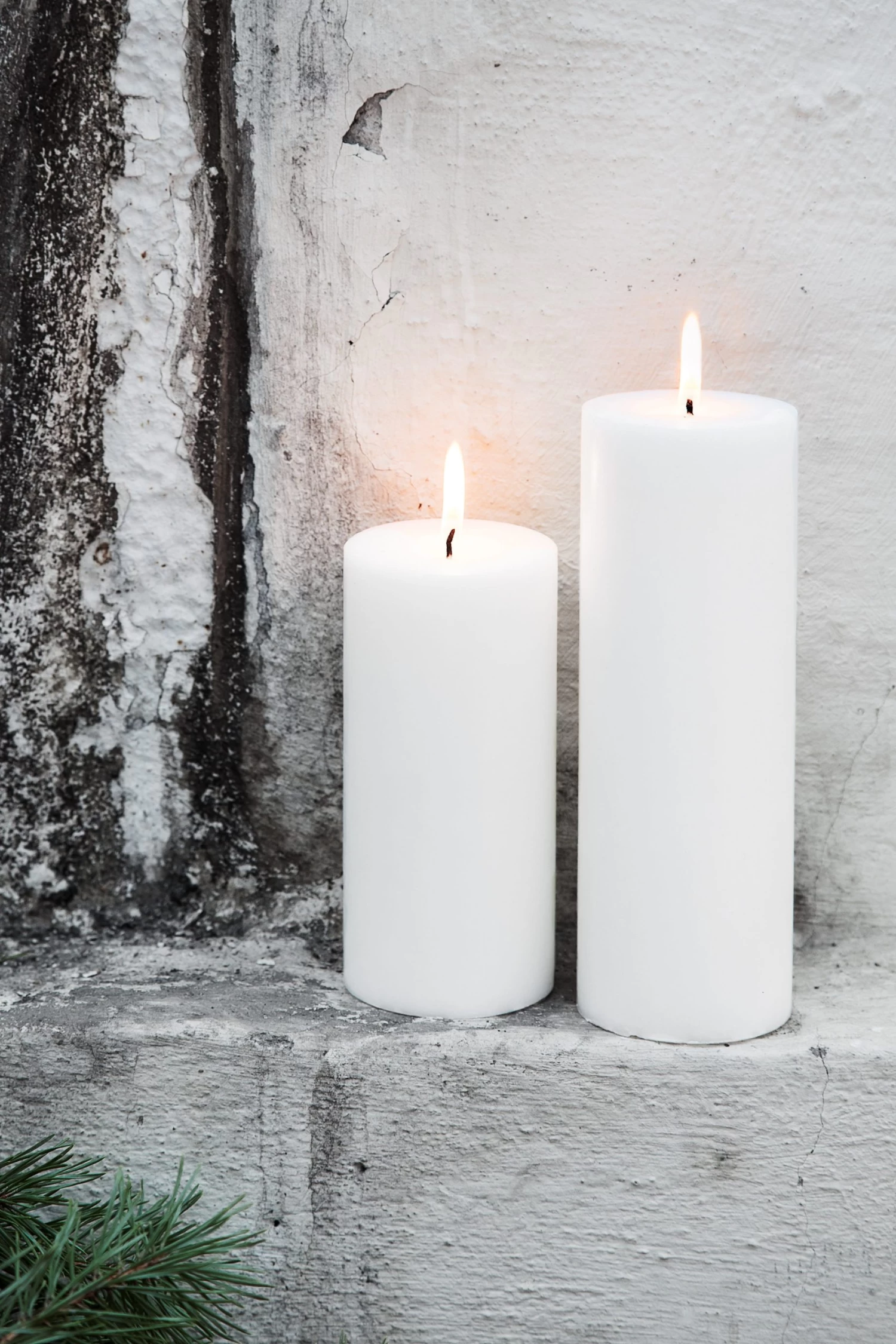 Unsere Stumpenkerze 7×15 cm Weiß besteht zu 100 % aus Stearin und ist mit dem Nordic Swan Ecolabel gekennzeichnet. Ob einzeln aufgestellt oder gruppiert, die Kerzen tauchen deine Wohnung in ein warmes Licht.