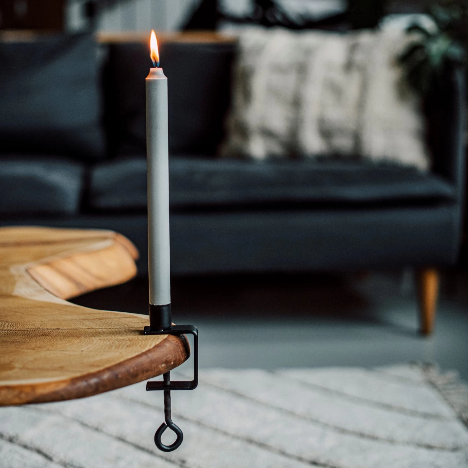 Kerzenhalter aus schwarzem Eisen, der sich festschrauben lässt. Der Kerzenhalter ist für Kronleuchter ausgelegt. Der Kerzenhalter kann auf bis zu 5 cm dicke Untergründe geschraubt werden. Um den Kerzenhalter anschrauben zu können, muss man den Halter mindestens 3,5 cm in die Oberfläche einführen können, damit die Schraube befestigt werden kann. Man kann ihn maximal 5 cm einführen. Die Kerzenhalter haben ein schönes rustikales Aussehen mit unterschiedlich starker Patina. Die oxidierte Oberfläche macht sie zu Unikaten, daher kann das Aussehen dieser Kerzenhalter variieren.