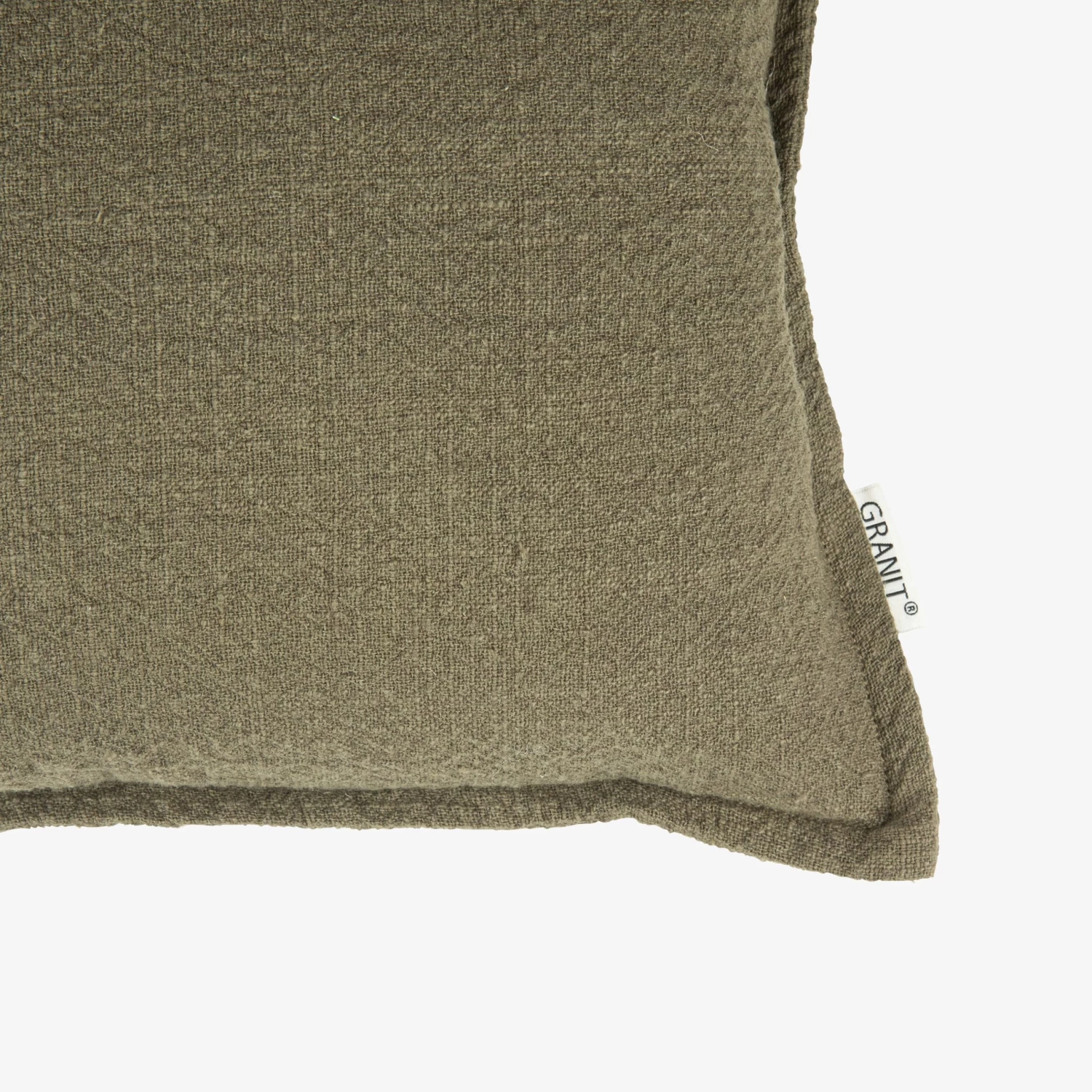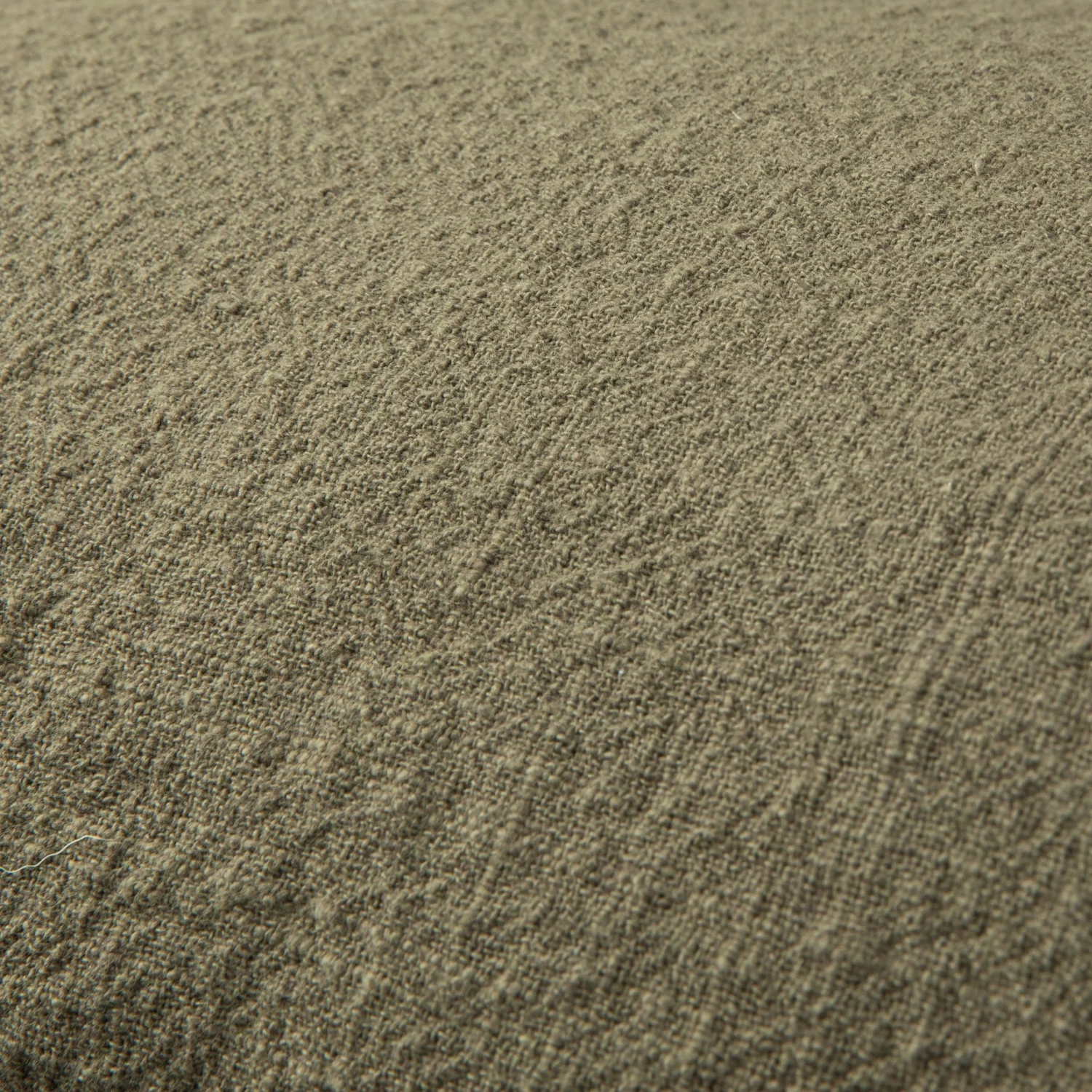 Schickes, längliches Kissen in einem dunklen Khaki-Grün aus Leinenmix mit abnehmbarem Bezug, der bei Verschmutzung einfach gewaschen werden kann. Der Kissenbezug ist nach OEKO-TEX® STANDARD 100 zertifiziert und passt gut zum Bett im Schlafzimmer oder auf das Sofa oder den Sessel im Wohnzimmer.