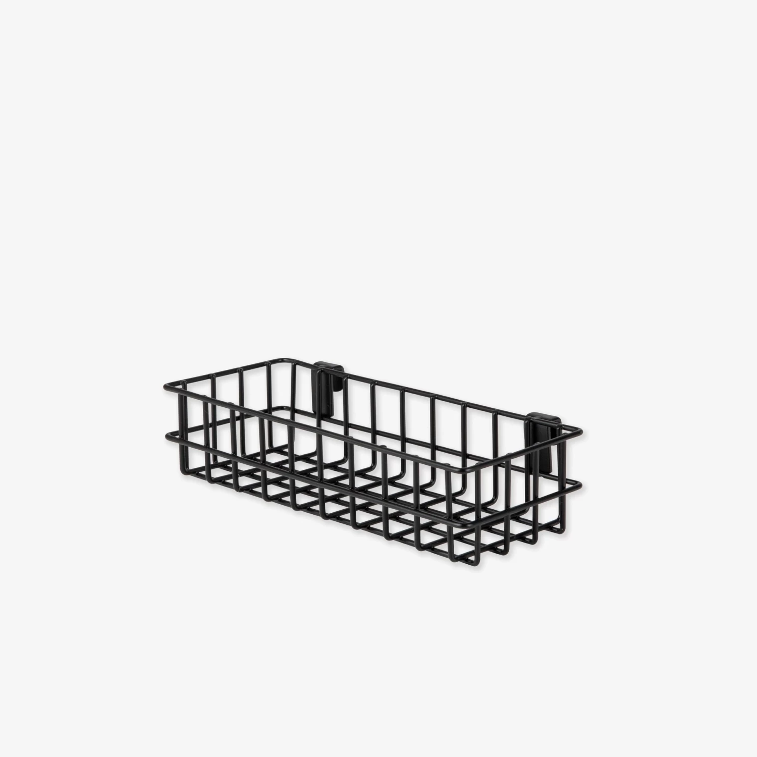 | Kleiner schwarzer Metallkorb, der zu unseren Aufbewahrungs-/Gitternetztafeln gehört.Maße: 20 x 7 x 5 cm. |