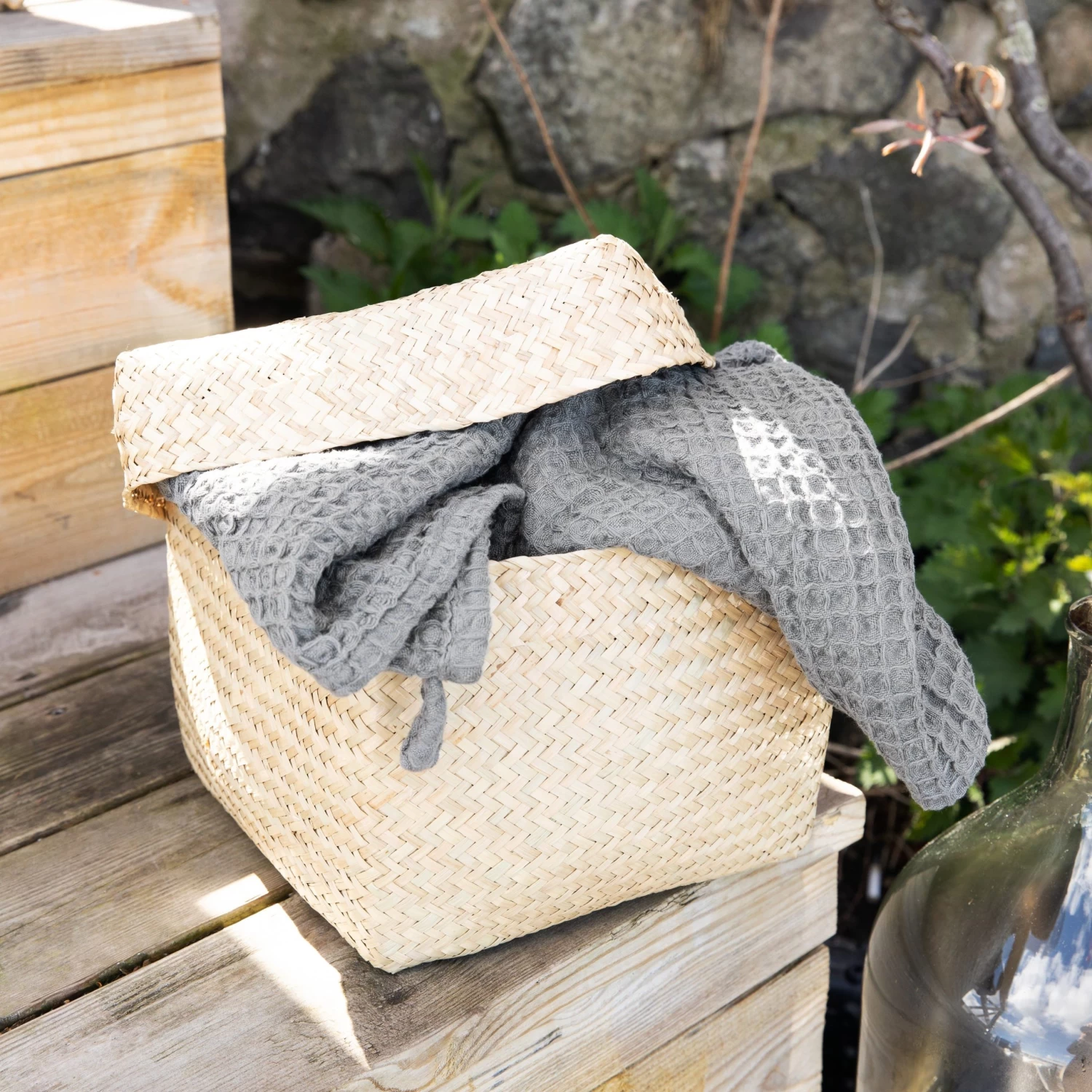 Rechteckiger Korb aus Seegras mit passendem Deckel. Der Deckel hat einen Griff an der Oberseite. Auch in einer kleineren und einer größeren Größe erhältlich!