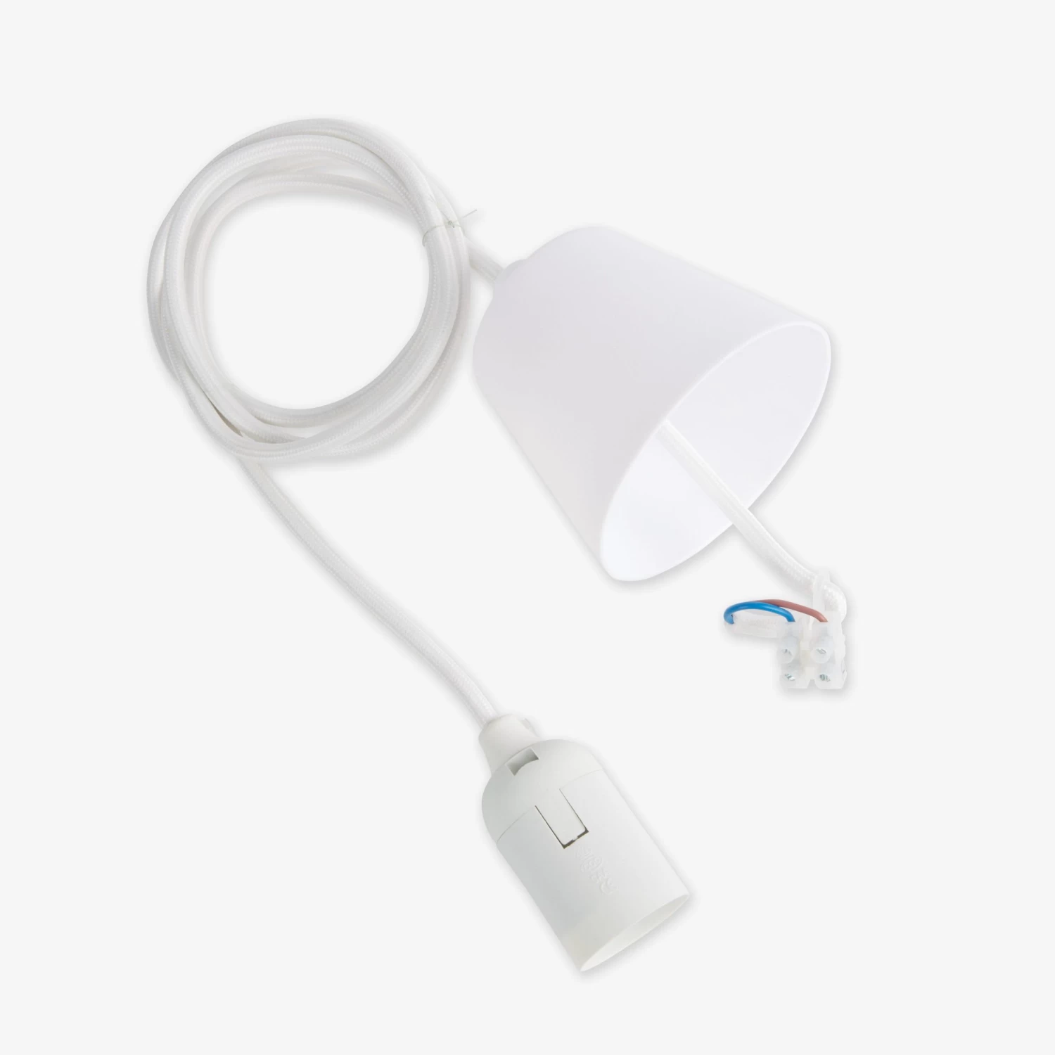 Lampenkabel aus weißem Textil, einschließlich Lampenfassung und Abdeckung zum Verstecken des Kabels. Länge 1,4 Meter.