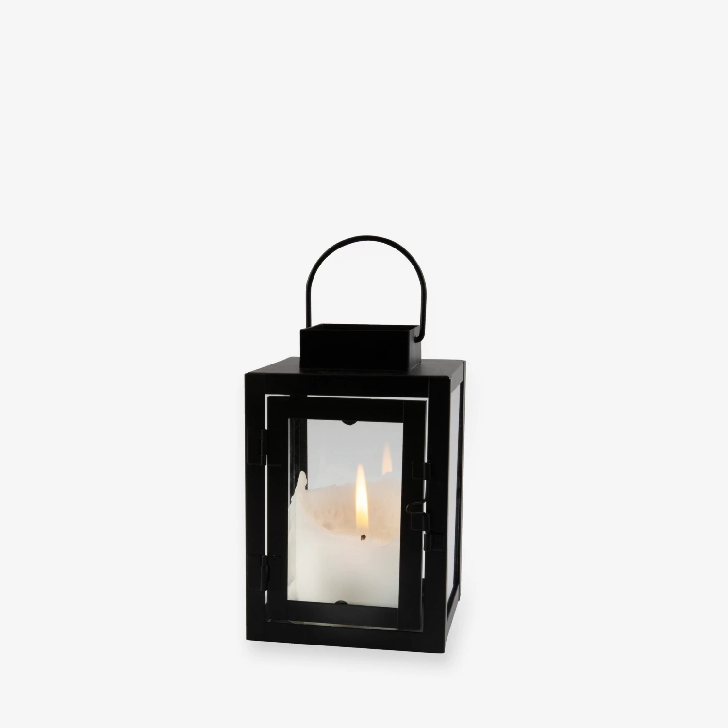 Schwarze Metalllaterne mit Glastür, die sich mit einem kleinen Haken öffnen und schließen lässt.