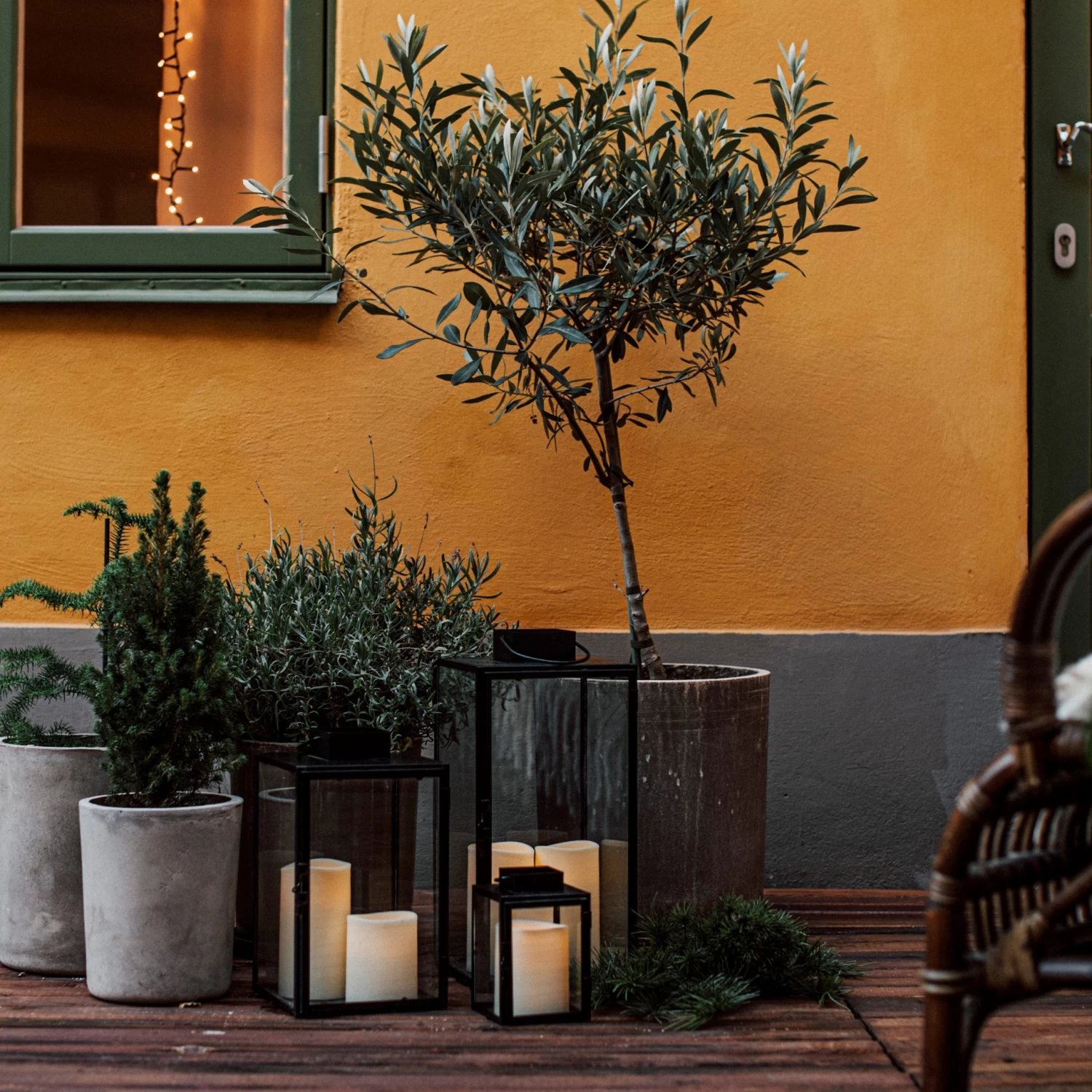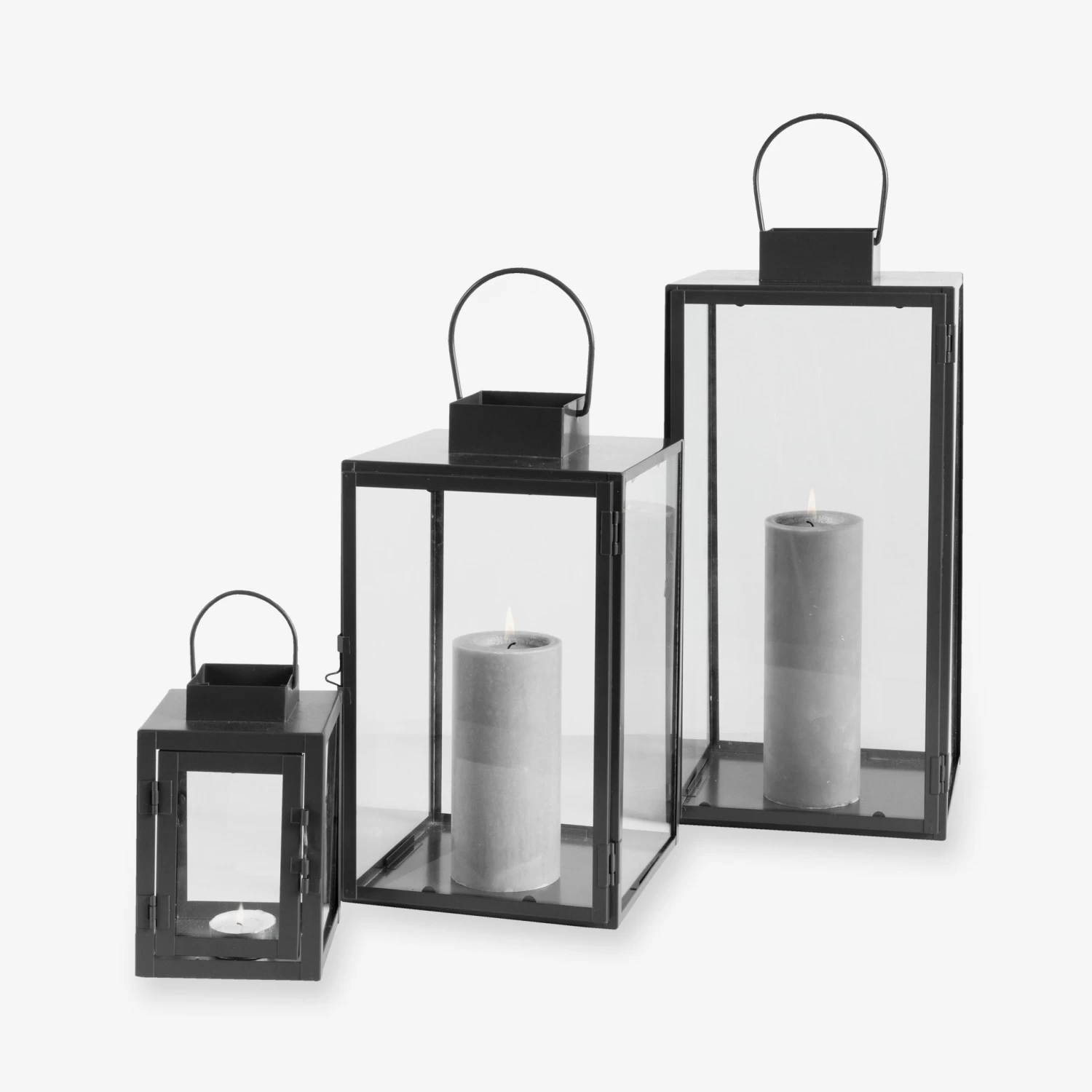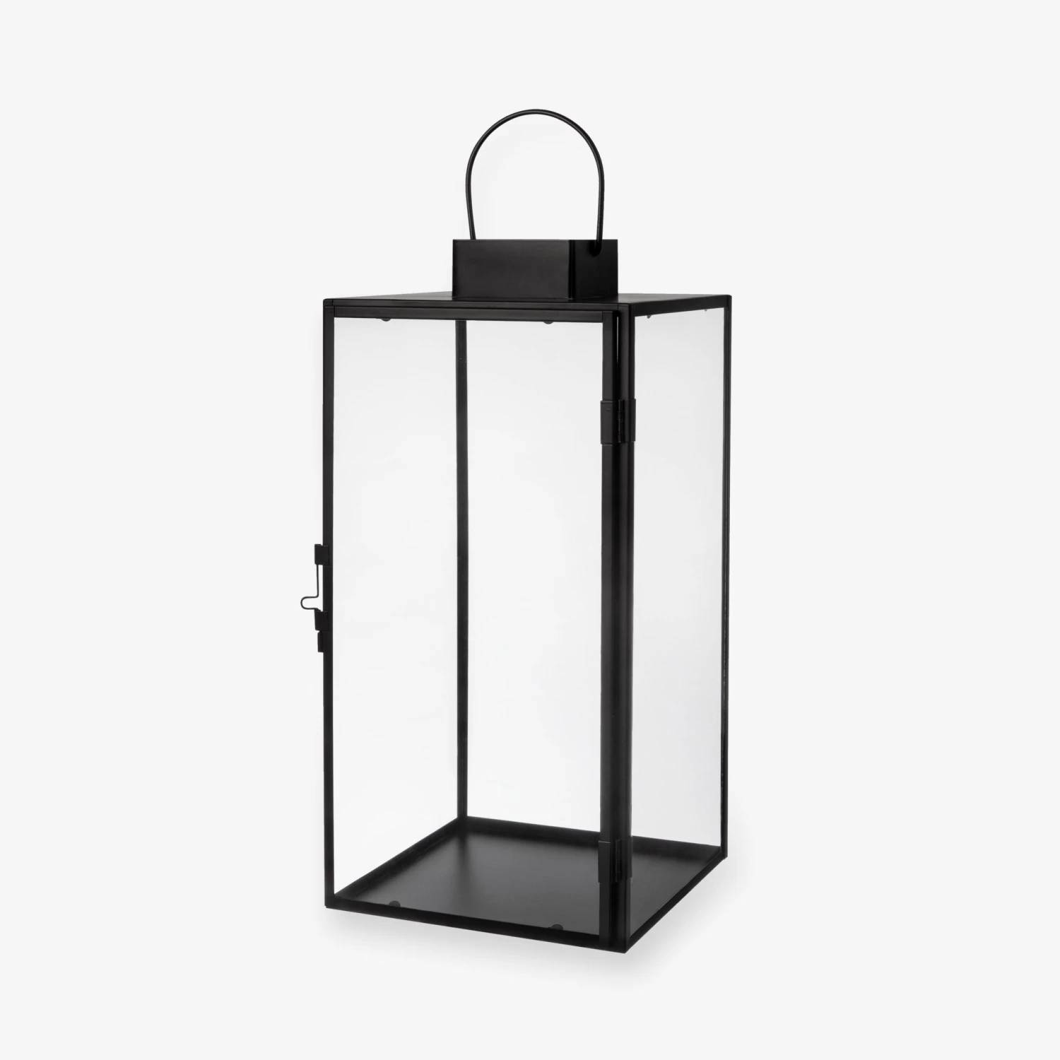 Schwarze Laterne aus Metall mit einer Glastür, die geöffnet und mit einem Häkchen geschlossen werden kann. Die Laterne ist wasserresistent und kann im Sommer/Herbst draußen stehen. Sollte nicht bei Minusgraden draußen stehen, da das Glas zerbrechen kann.