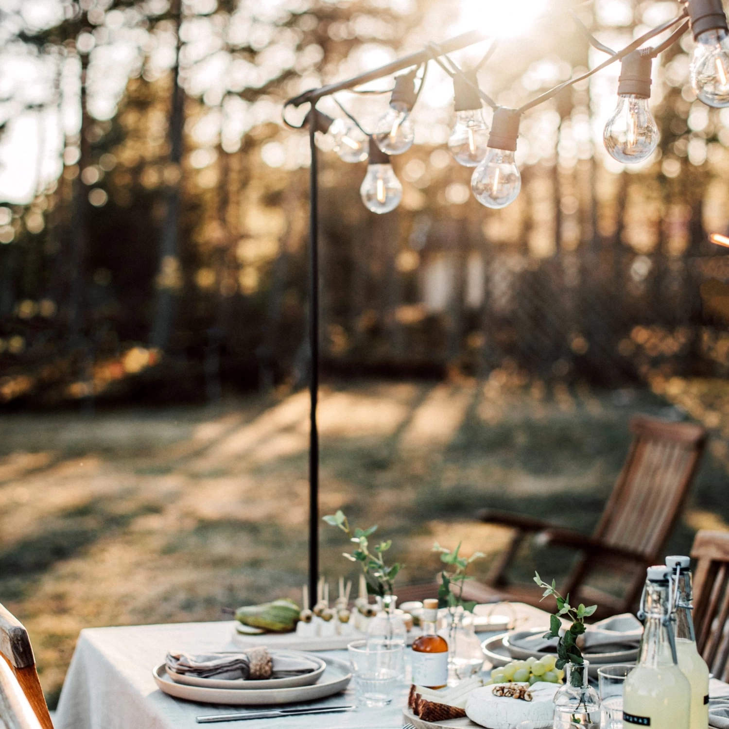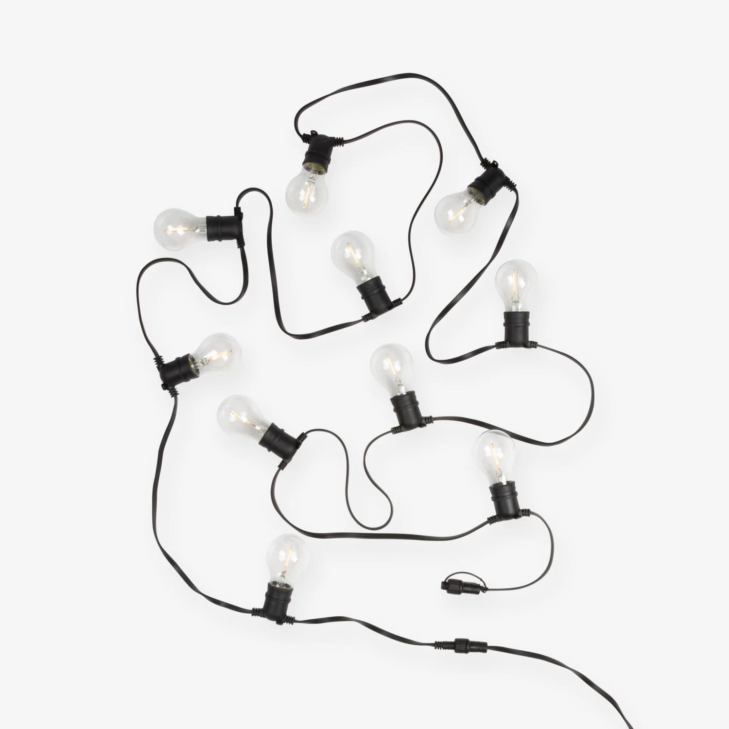 Mit austauschbaren Lichtquellen aus Glas und der Möglichkeit, bis zu 10 Lichterketten miteinander zu verbinden. So wird der Außenbereich einfach schön. Die Lampen der Lichterkette erstrahlen in einem warmweißen Licht und die Kette kann sowohl im Innen- als auch im Außenbereich verwendet werden. IP-Klasse 44. An jedem Lampenhalter befinden sich zwei Schlaufen, mit denen die Lampen in Haken an der gewünschten Oberfläche befestigt werden können. Geschätzte Lebensdauer 10.000 Stunden. Die Gesamtlänge der Kette beträgt 9,5 Meter.