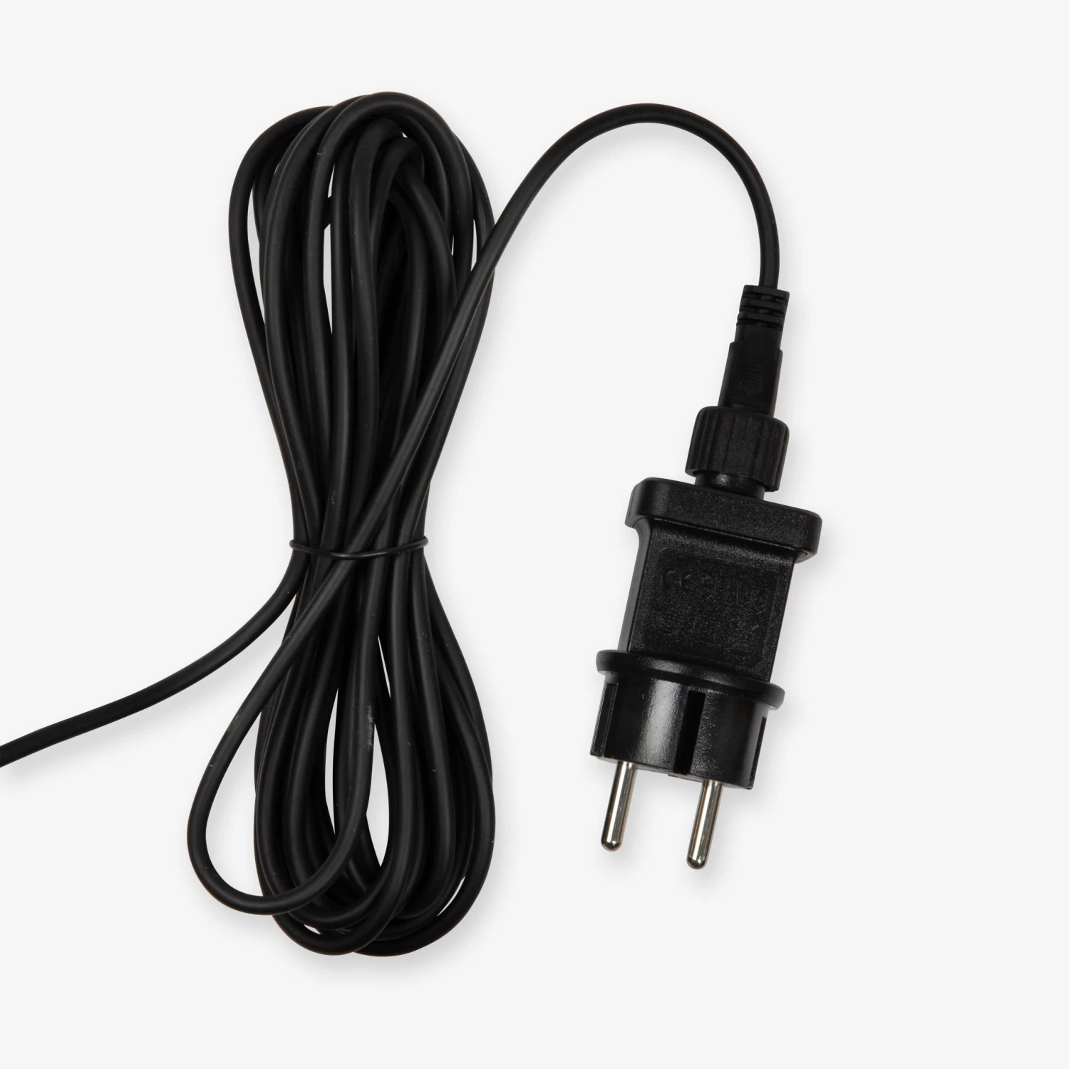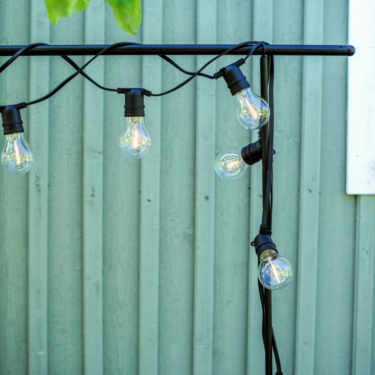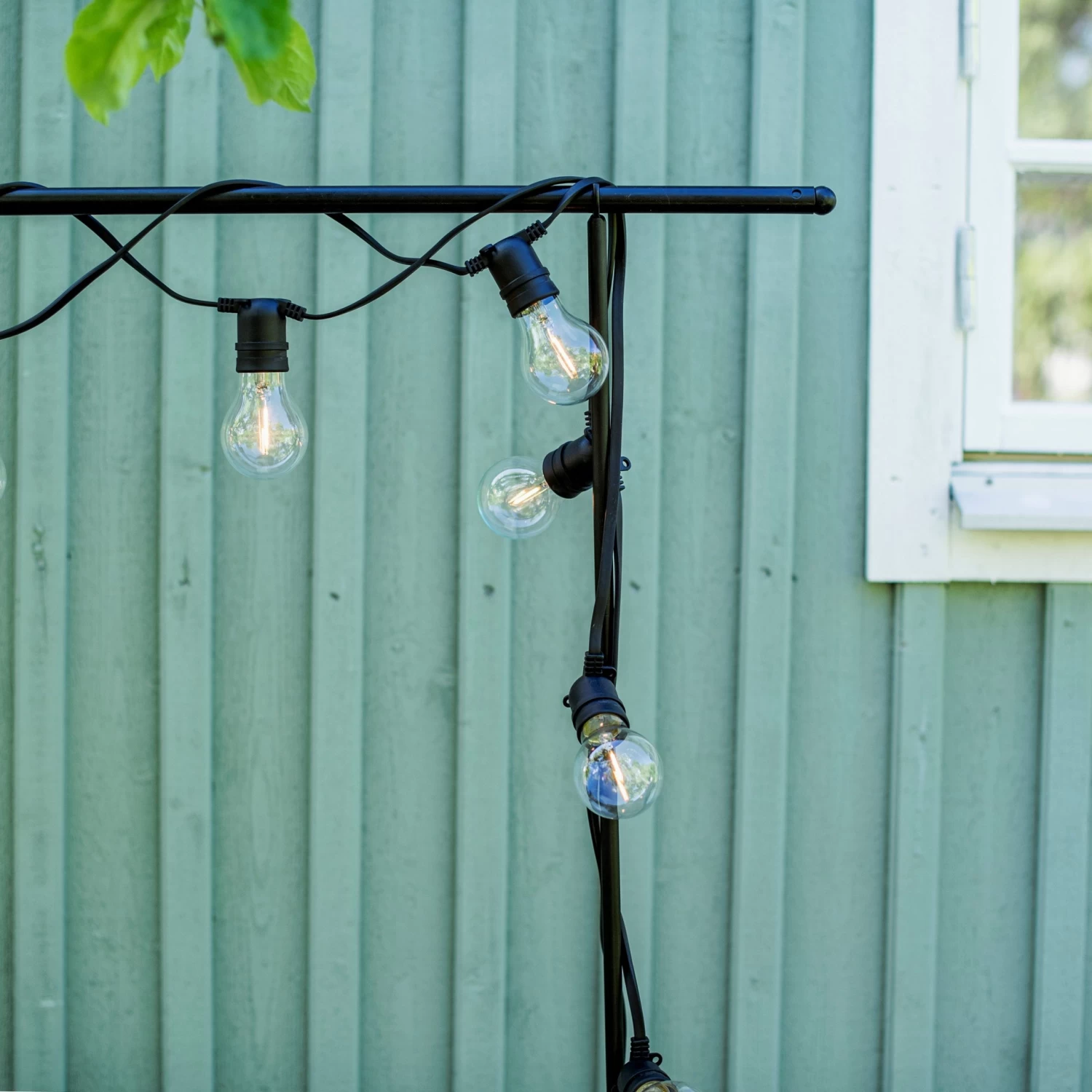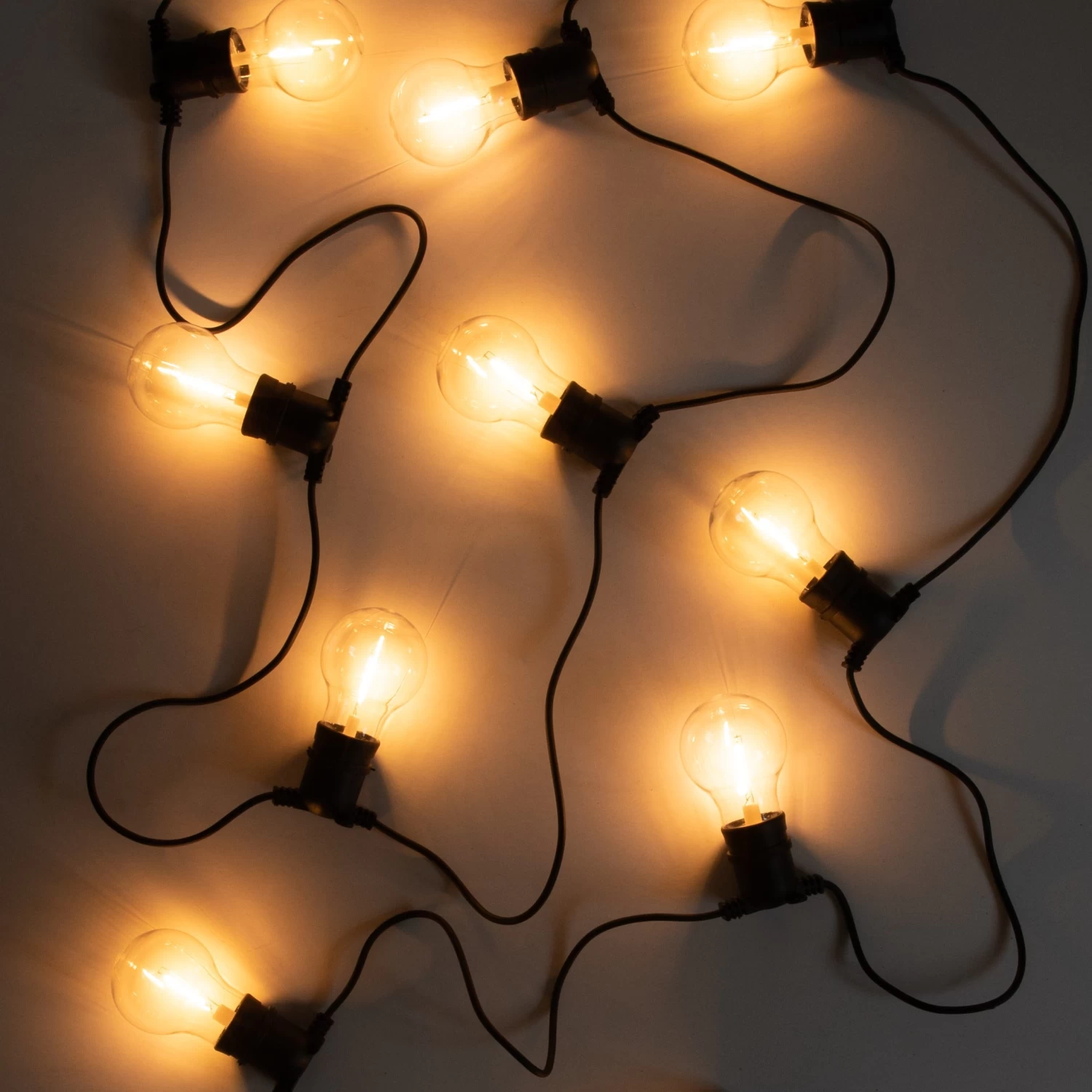 Schmale schwarze Lichterkette für den Innen- und Außenbereich mit austauschbaren Kunststofflichtquellen. Die Lichterkette hat 10 Lampen im Abstand von 45 Zentimetern. Die Gesamtlänge der Kette beträgt 10 m, wovon 5 m auf das Verbindungskabel entfallen. IP-Klasse 44.