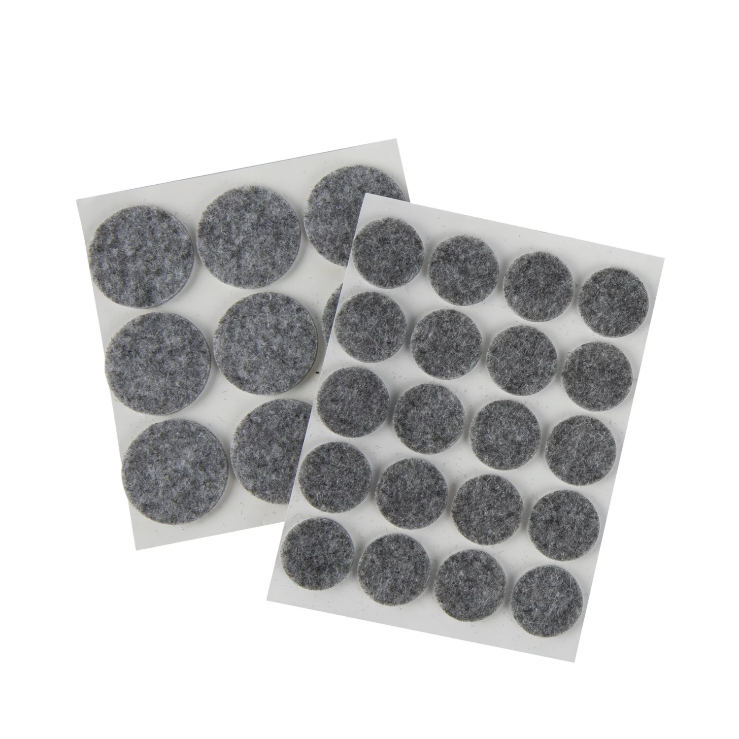 Graue Möbelfilze in 2 verschiedenen Größen, insgesamt 29 Stück. 9 Stück sind 3 cm und 20 Stück sind 2 cm groß.