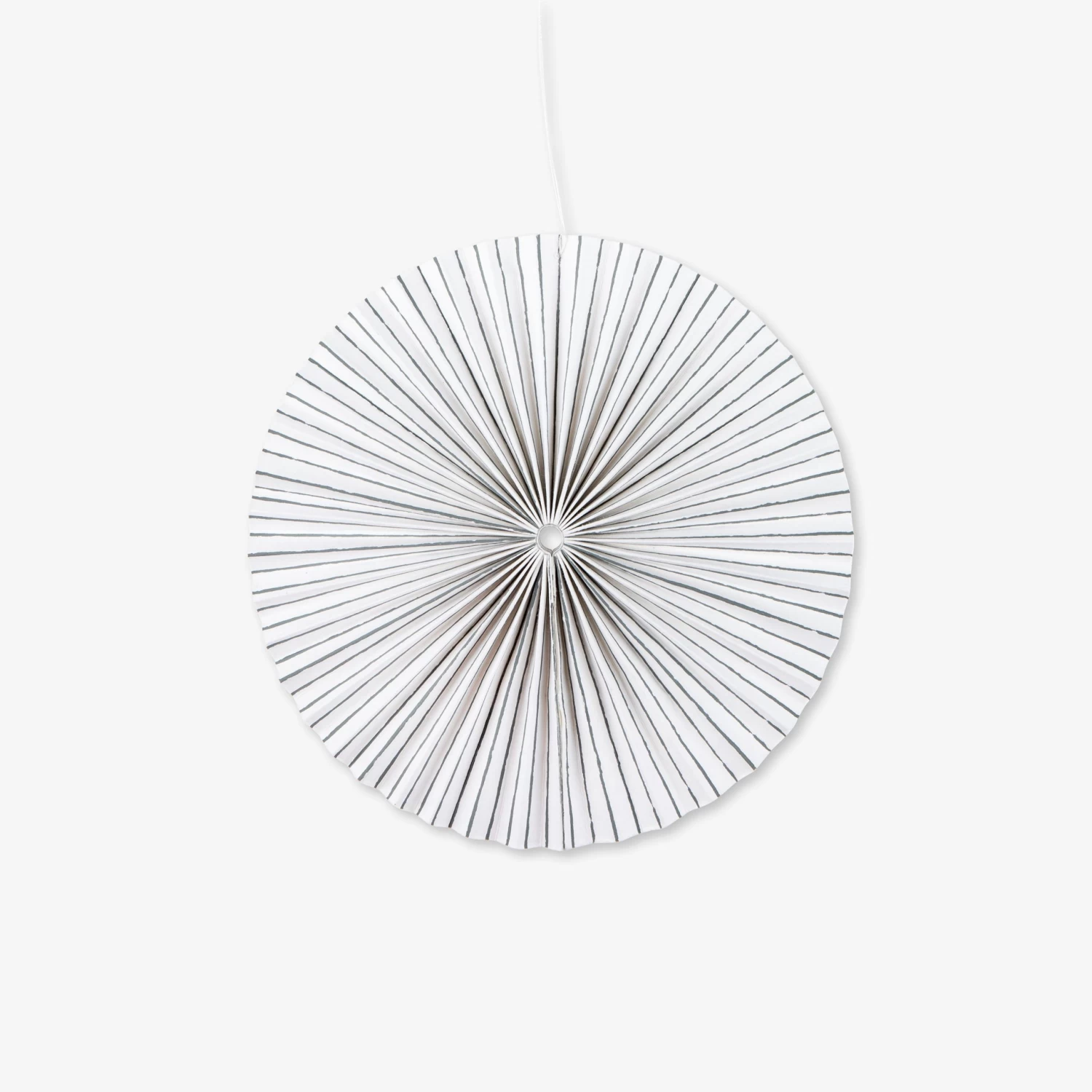 Papierdekorationen in Form von gefalteten Kreisen. Verwende die Dekorationen wie du möchtest! Kombiniere verschiedene Größen und Farben. Du kannst sie zum Beispiel als Tischdekoration an unsere Aufhänger hängen.Naturweiß mit grauen Streifen. Die Dekoration lässt sich aufklappen und mit seitlich angebrachten Klebestreifen leicht befestigen. Inklusive Kordel. Hergestellt aus recyceltem Baumwollpapier.Maße: Ø 20 cm