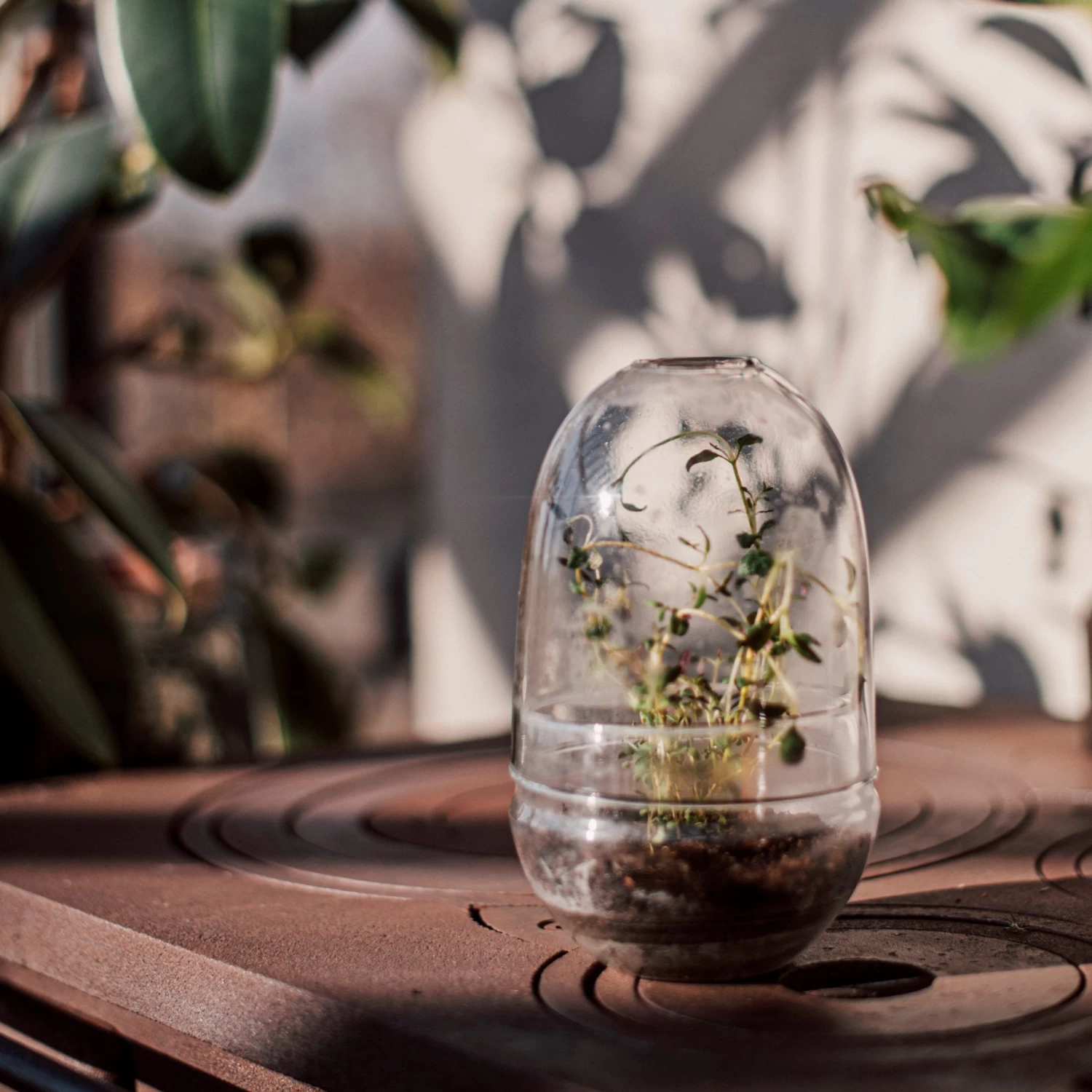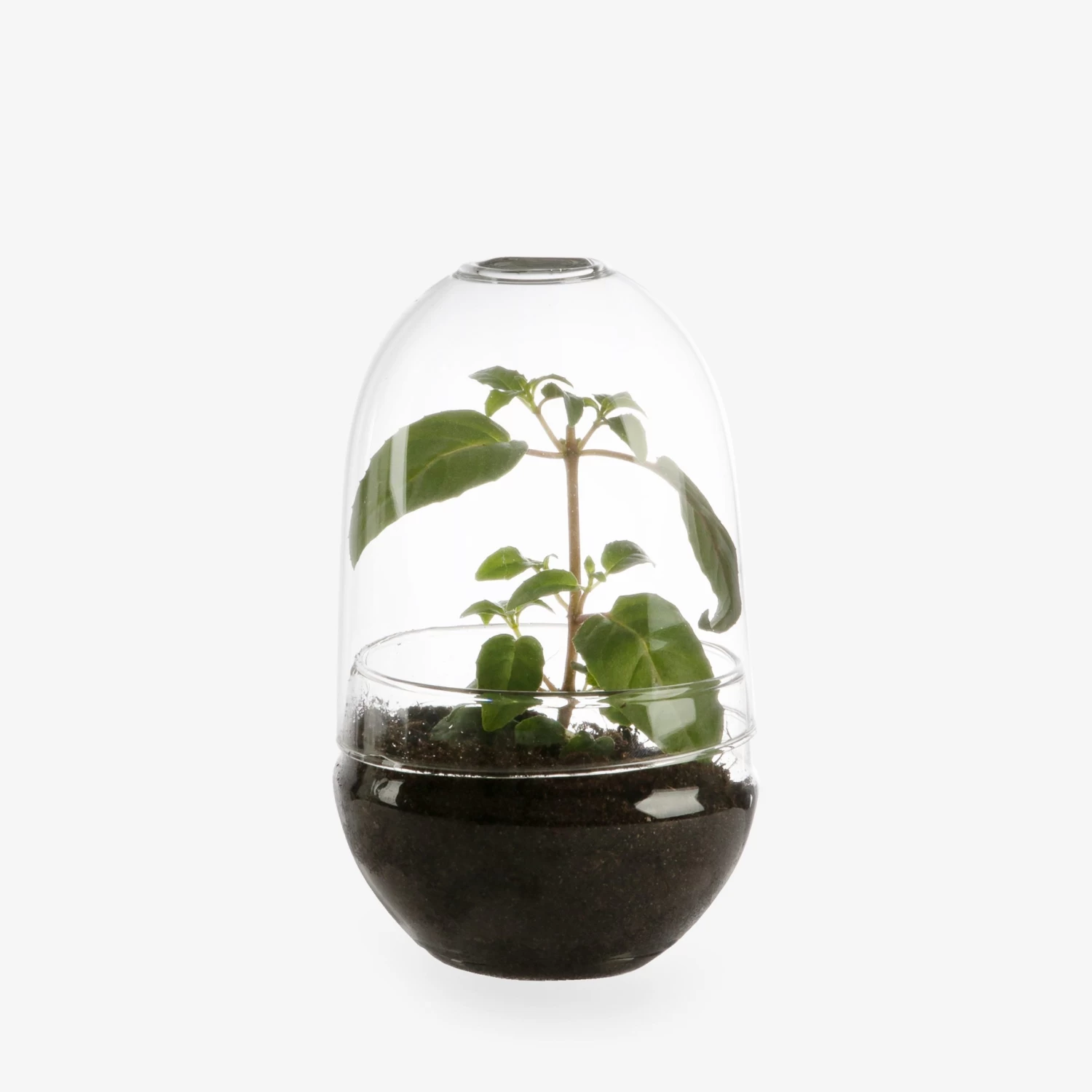 Pflanzengehäuse mit einer dazugehörigen Glaskuppel. Die Glaskuppel hat oben ein Loch, durch das der Sauerstoff eindringen kann. In einen Topf mit einer Pflanze stellen oder direkt in der Kuppel züchten.Auch in einer größeren Größe erhältlich.
