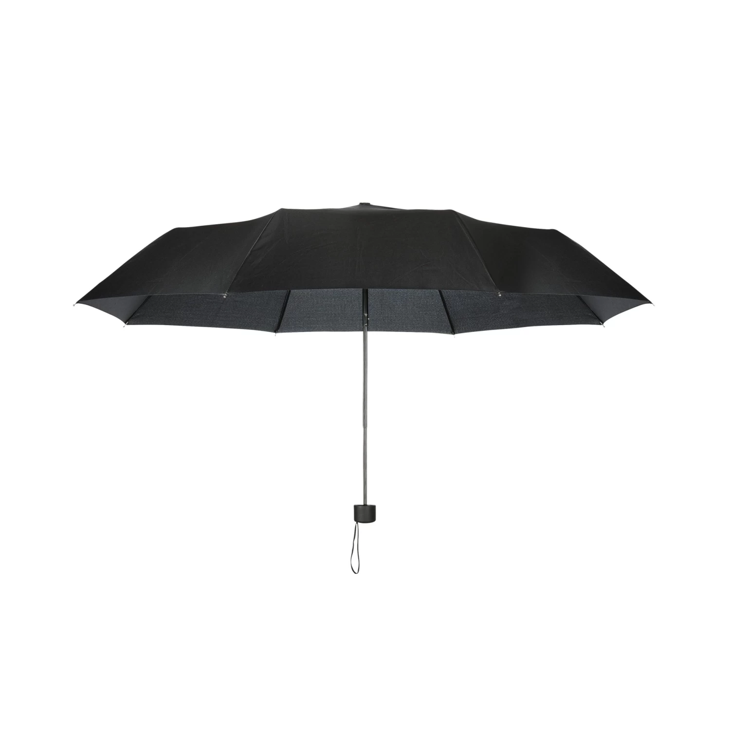 Zusammenklappbarer schwarzer Regenschirm, der bei Nichtgebrauch nur wenig Platz in der Tasche einnimmt. Wird mit einem Klettverschluss geschlossen und kann an einer Schlaufe am Griff aufgehängt werden.Maße geöffnet: H 55 Ø 99 cm. Maße zusammengeklappt: 6 x 6 x 24 cm.