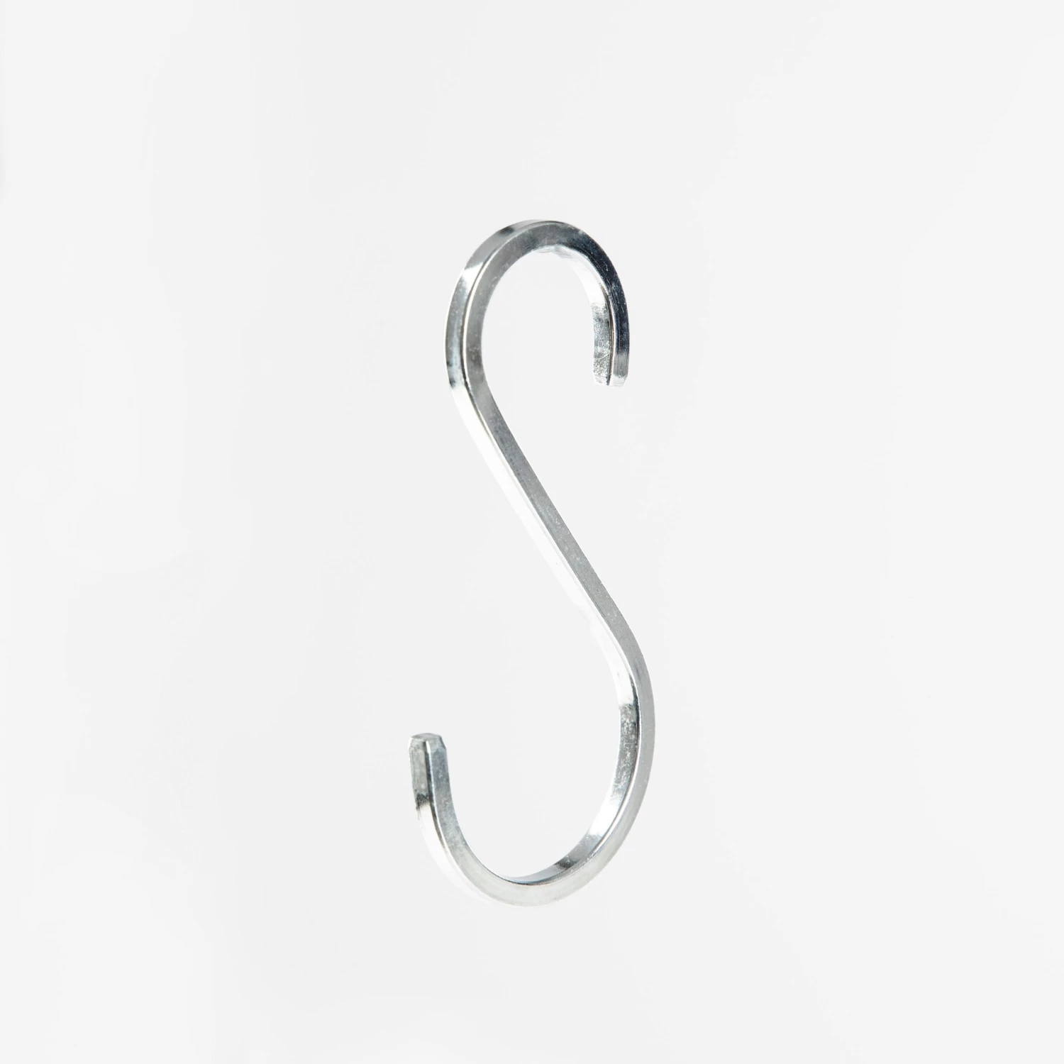 Stabiler und flexibler S-Haken aus verchromtem Eisen mit flachen, abgeschrägten Seiten. Die Haken haben unterschiedliche Innendurchmesser von 3 cm bzw. 5 cm. Praktische Alternative oder Ergänzung zu Kleiderbügeln, Wandhaken usw. Auch in einer kleineren Ausführung erhältlich.