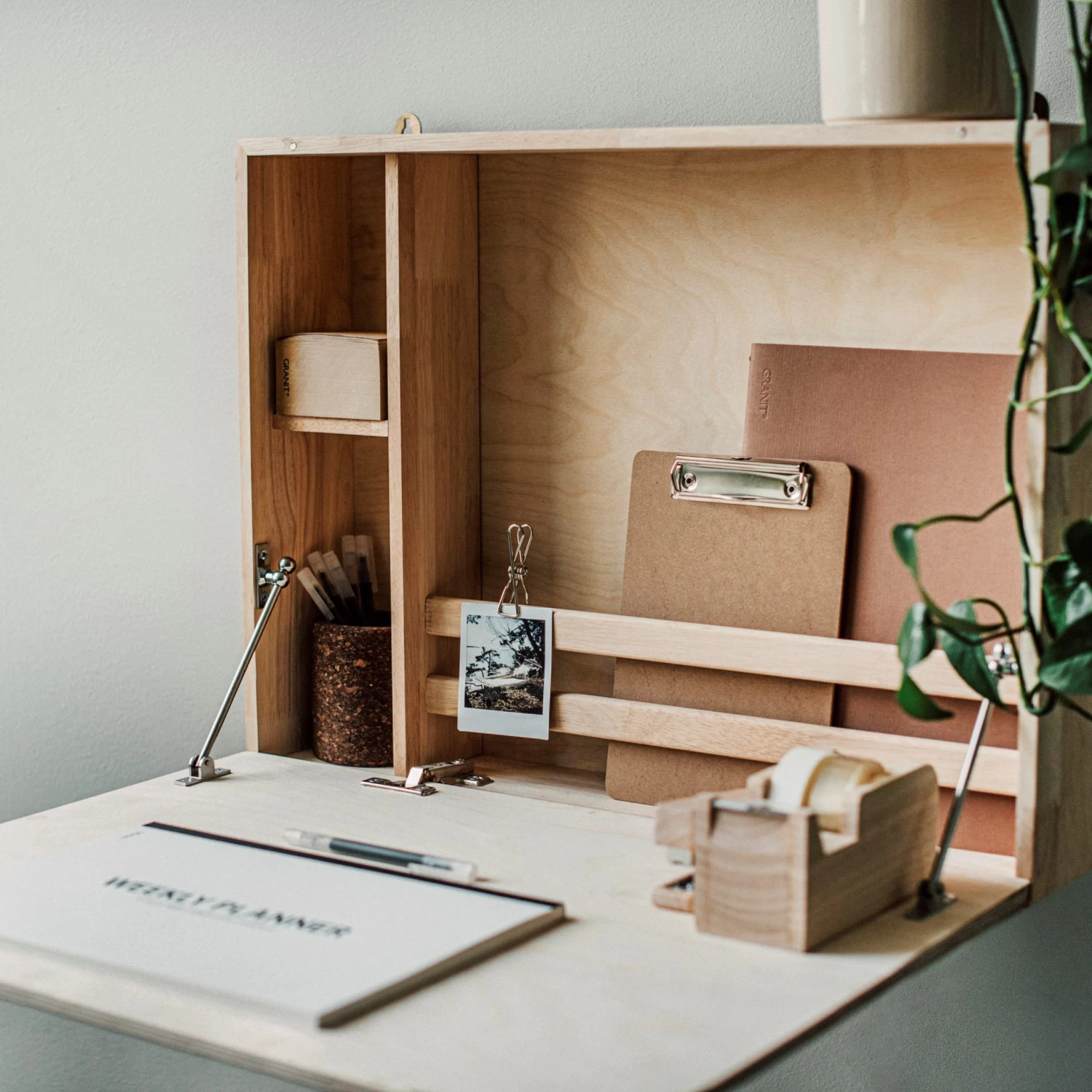| Mit einem an der Wand montierten Schreibtisch sparst du viel Platz. Ein kleinerer, an der Wand montierter Schreibtisch ist perfekt für alle, die einen kleinen Wohnraum haben, aber dennoch einen praktischen Arbeitsbereich gestalten möchten. Nach getaner Arbeit schließt du einfach den Deckel, um den Inhalt zu verbergen. Unser Wandschreibtisch ist aus Kautschukholz und Birkensperrholz gefertigt. Dank der stabilen Haken auf der Rückseite lässt er sich leicht aufhängen. Im Inneren gibt es vier verschiedenen Fächer mit Stauraum für die Kleinigkeiten, die du immer griffbereit haben möchtest. Maße: H 43 B 58,2 T 12,8 cm. Maximale Belastung: 15 kg. |