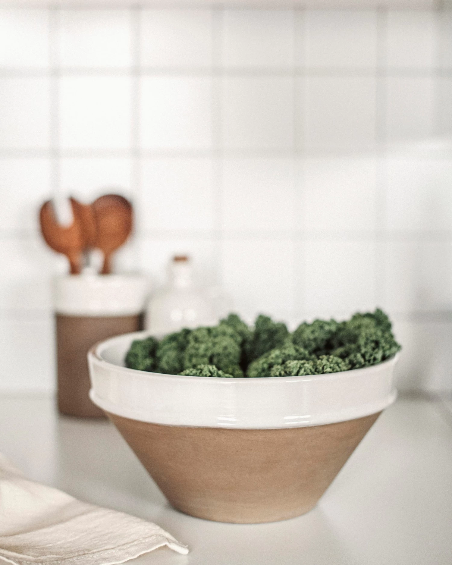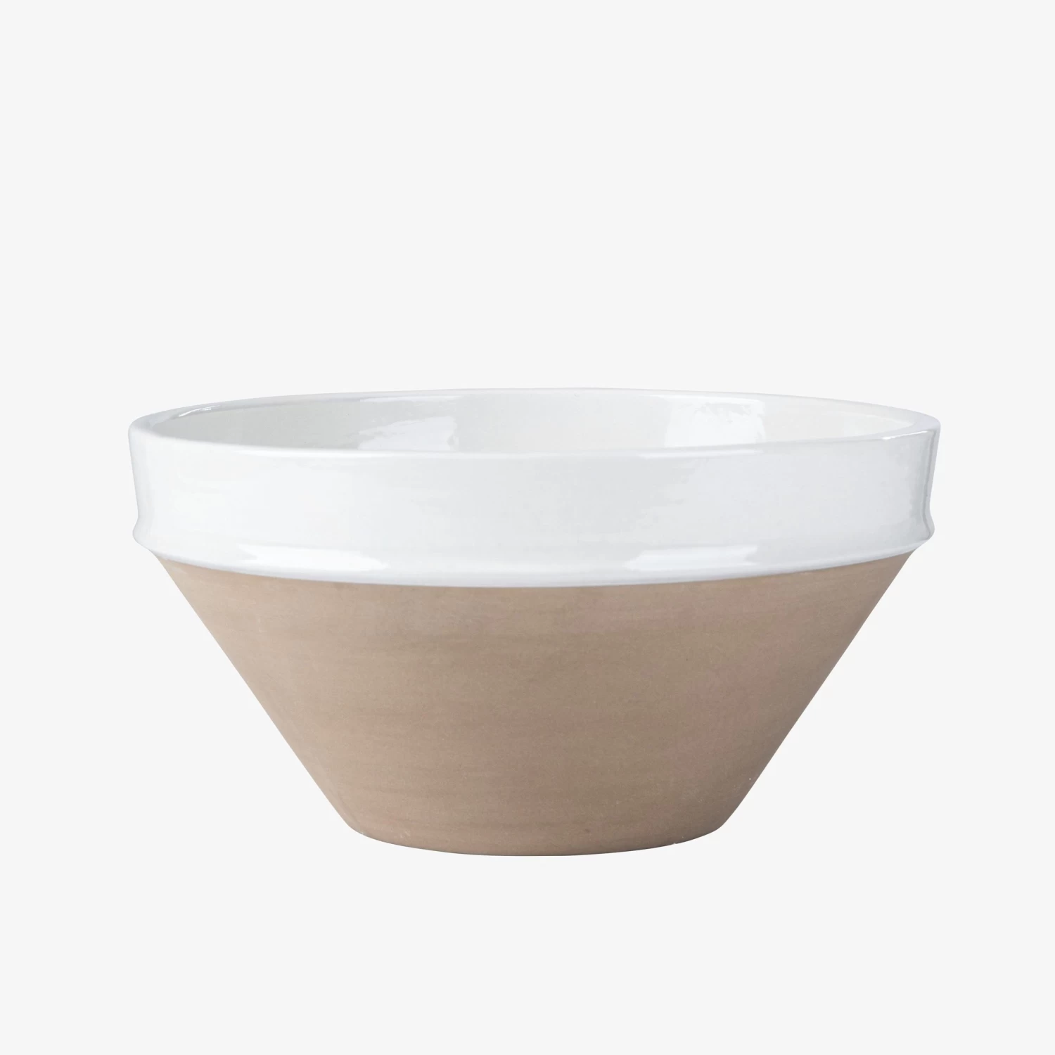 Stilvolle Servierschale aus teilweise glasiertem Natursteinzeug. In der gleichen Serie gibt es eine stilvolle Flasche für Öl/Essig und einen praktischen Halter für Utensilien.