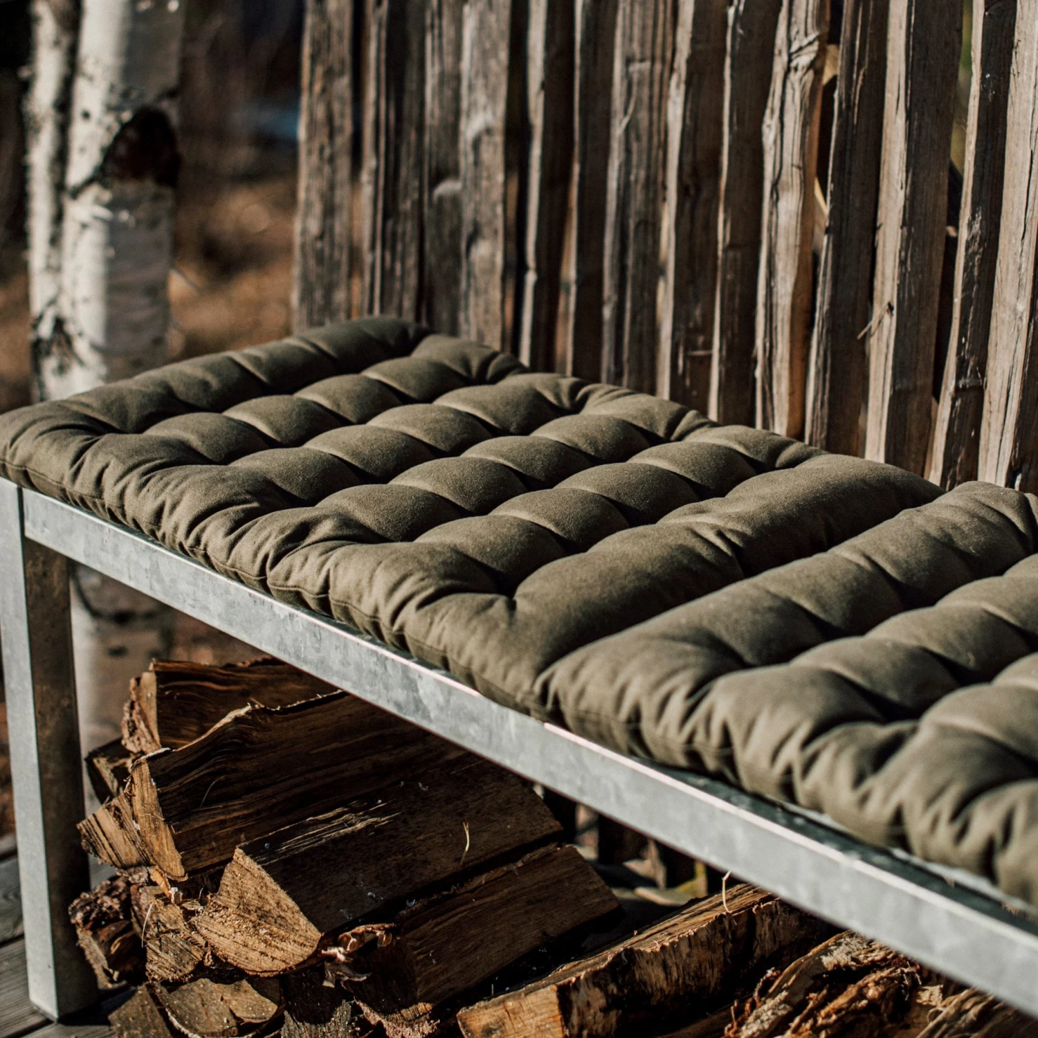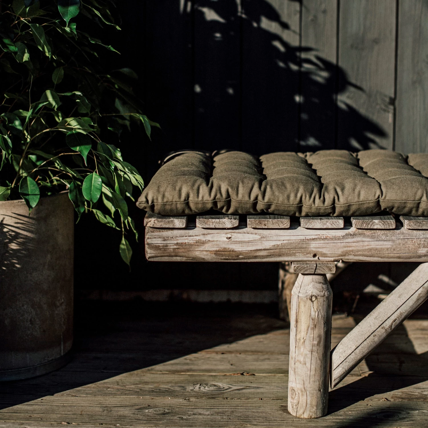 Weiches und bequemes Baumwollkissen zur Einrichtung deiner Terrasse. Perfekt für Bänke oder als zusätzliche Sitzgelegenheit auf einer Holzterrasse. Denke daran, dass Baumwolle in direktem Sonnenlicht leicht ausbleicht.