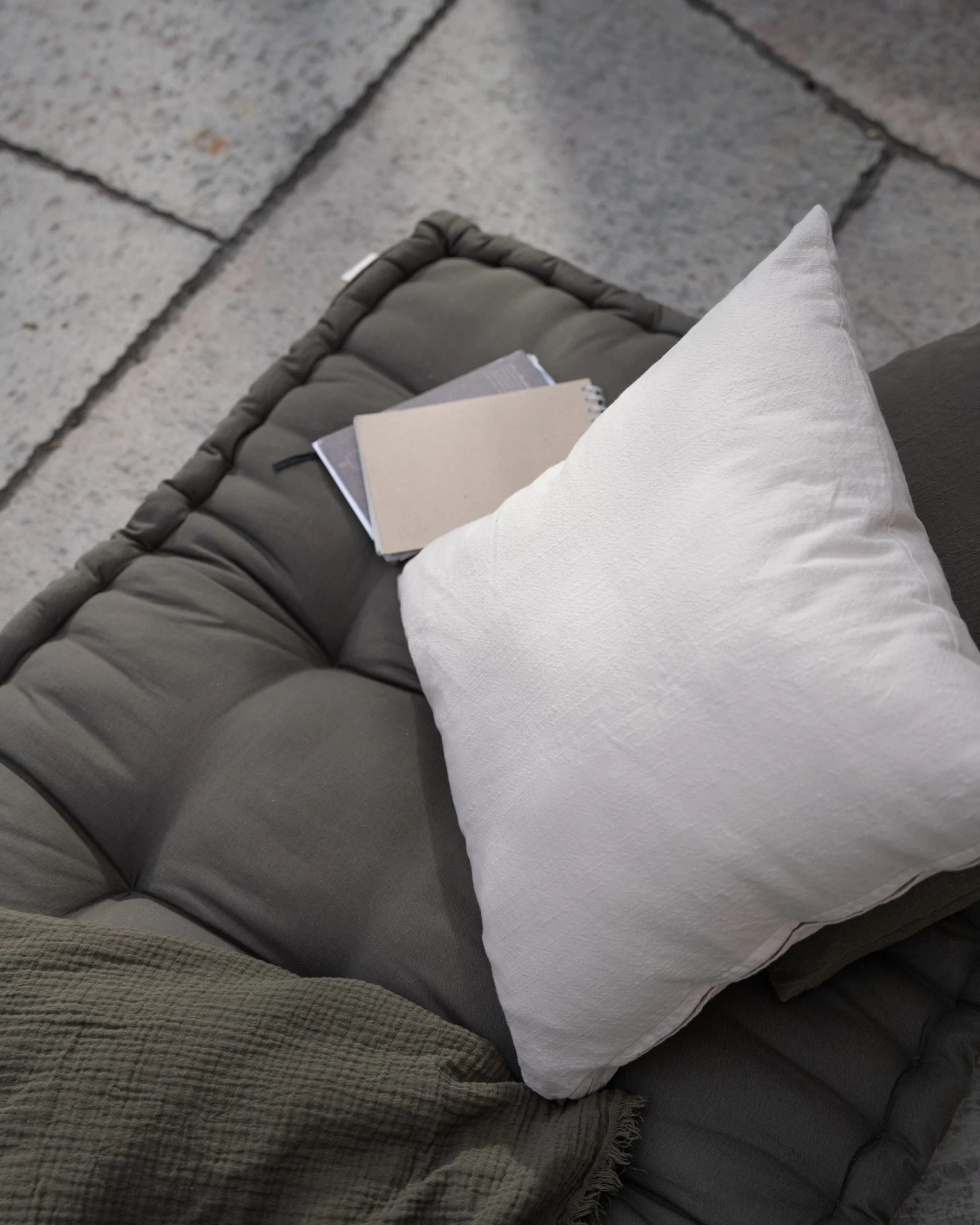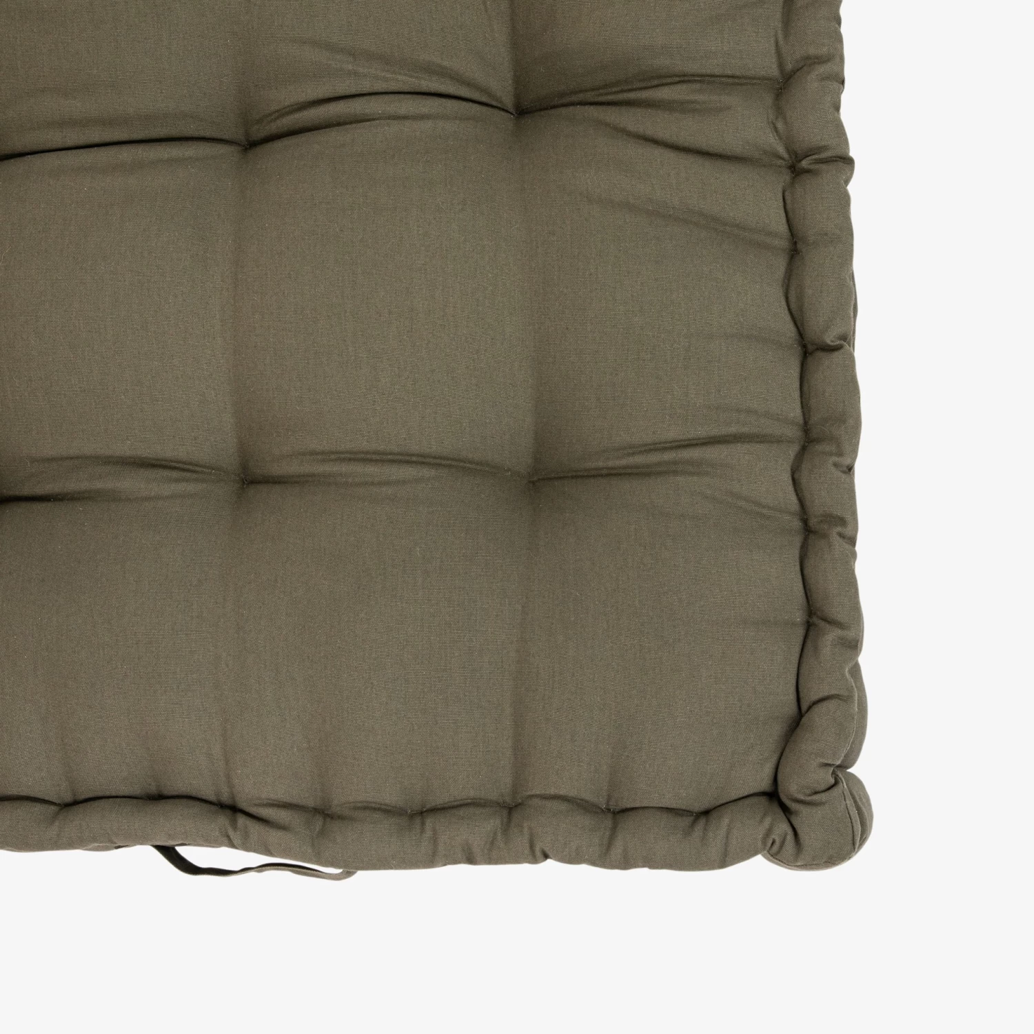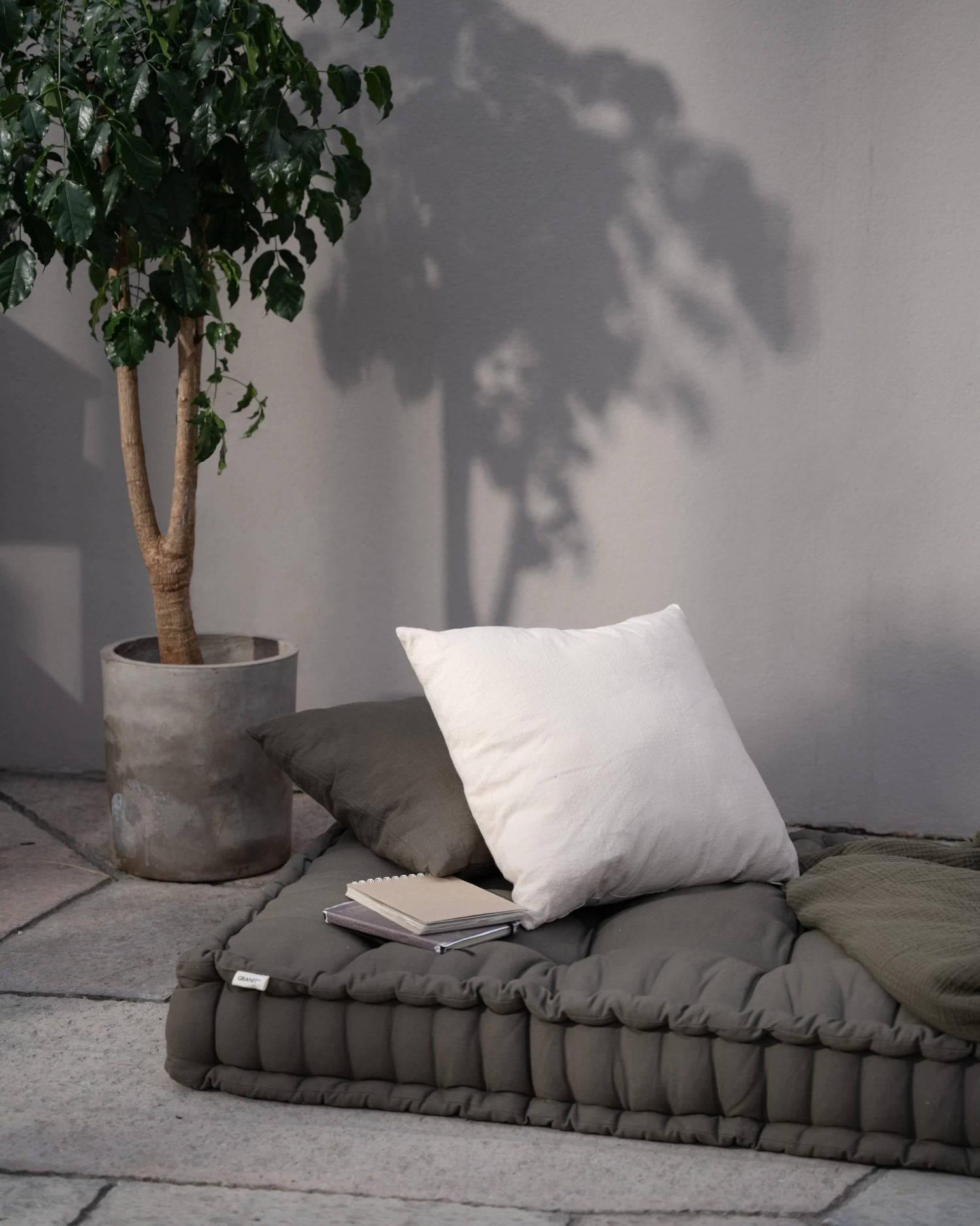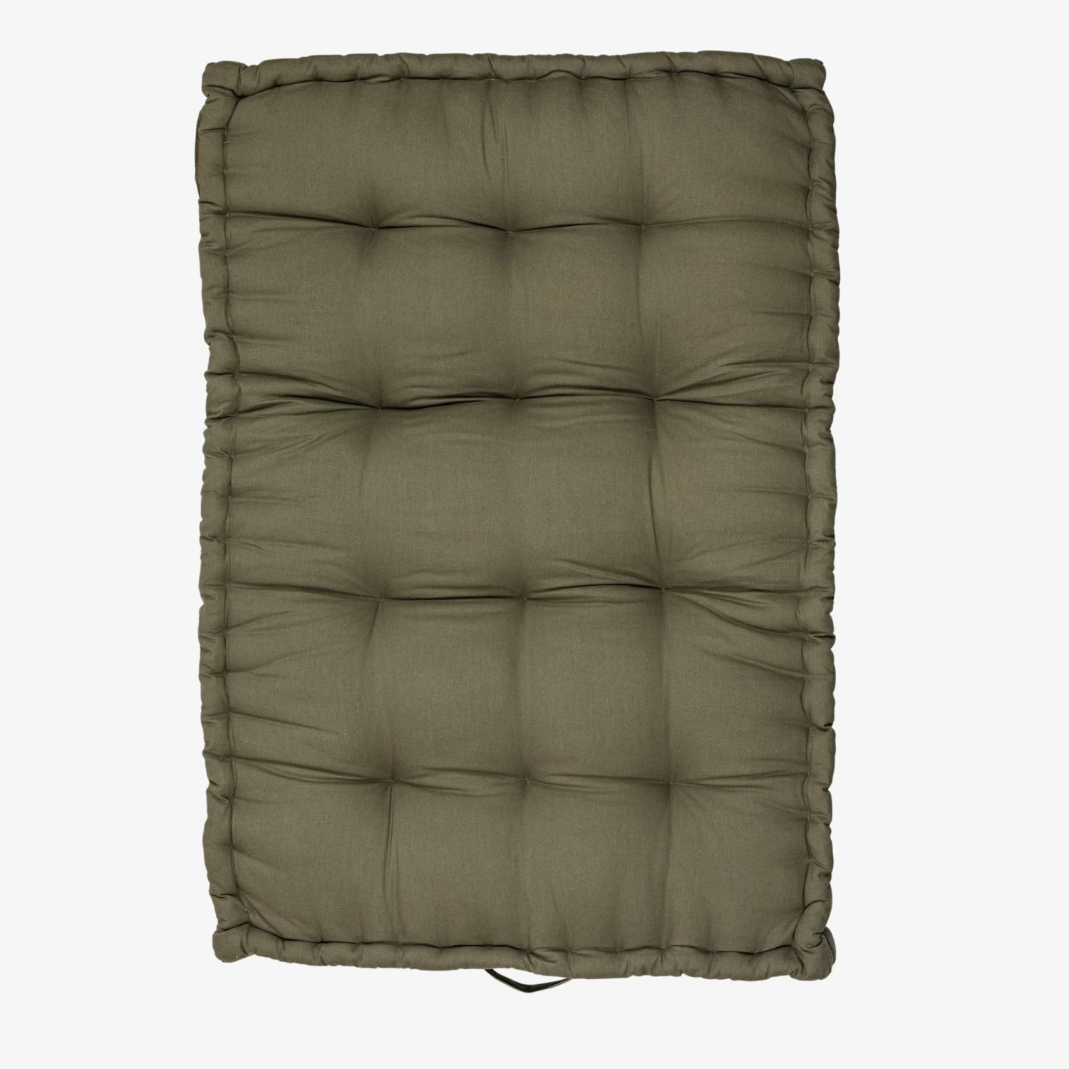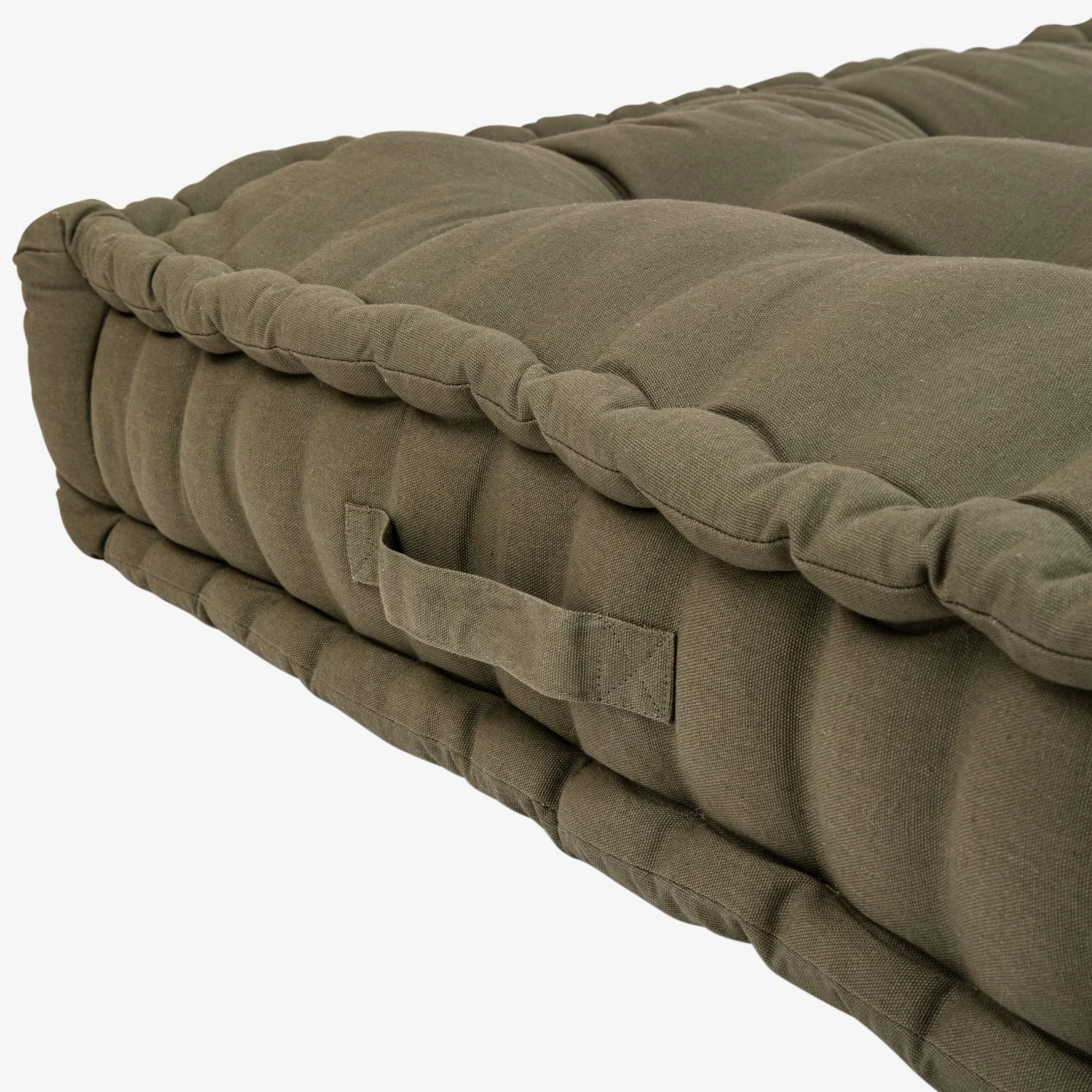 Großes XL-Kissen in dunklem Khaki-Grün, ideal für die Terrasse oder den Balkon, wenn du viele Freunde oder Verwandte zu Besuch hast. An einer kurzen Seite des Kissens befindet sich ein Griff, mit dem es sich leicht greifen lässt. Die Oberfläche besteht aus 100 % Baumwolle, die Innenseite aus 100 % Polyester. Erhältlich in verschiedenen Farben! Geeignet für unser Rattan-Tagesbett (402670).