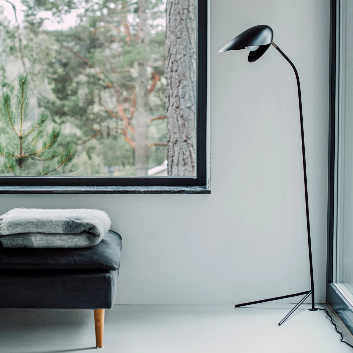 Schöne Stehlampe im Retro-Stil. Die Lampe ist aus pulverbeschichtetem Metall und eignet sich perfekt als Leselampe oder als ergänzende Lampe für eine zusätzliche Lichtquelle im Raum. H 145 cm.