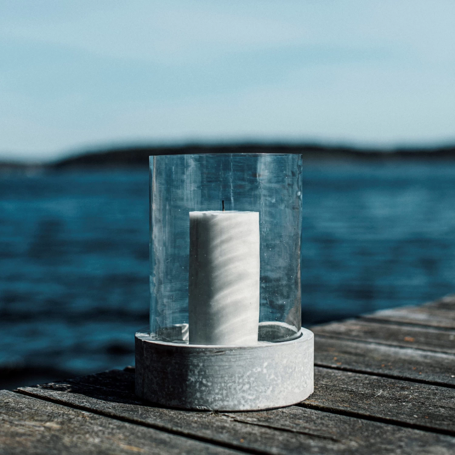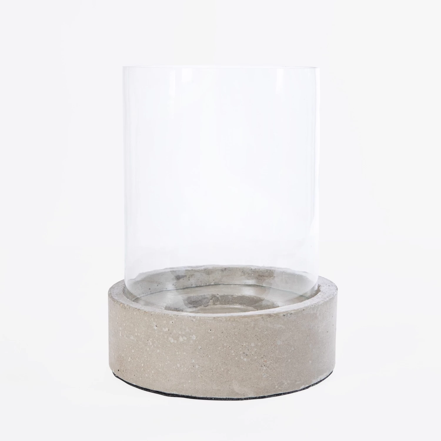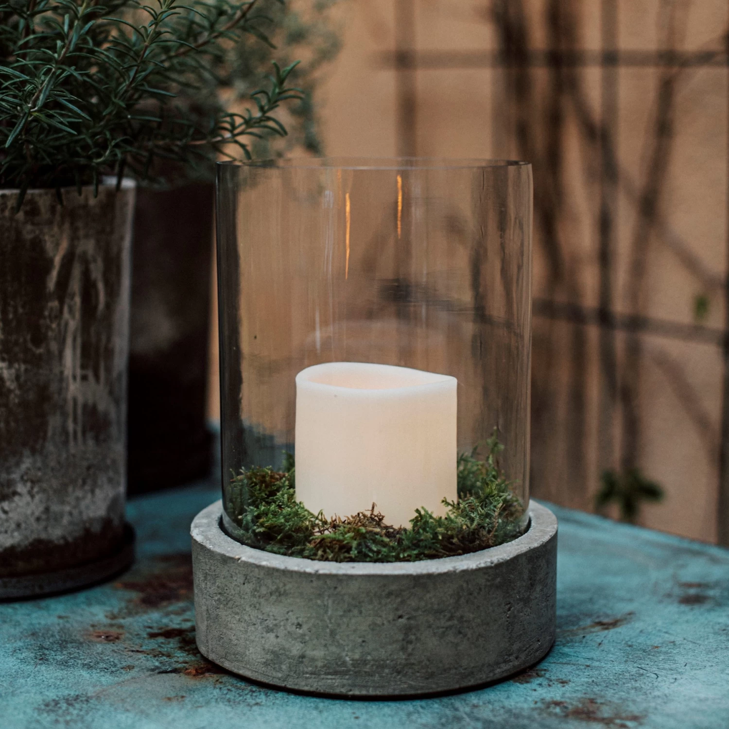 Unsere schlichte Sturmlaterne aus Zement und Glas ist stilvoll und leicht in das Dekor zu integrieren. Sie eignet sich für Blockkerzen und schafft einen harmonischen Lichtpunkt im Raum oder auf der Terrasse. Maße H 24 cm, das Glas hat einen Durchmesser von 15 cm.