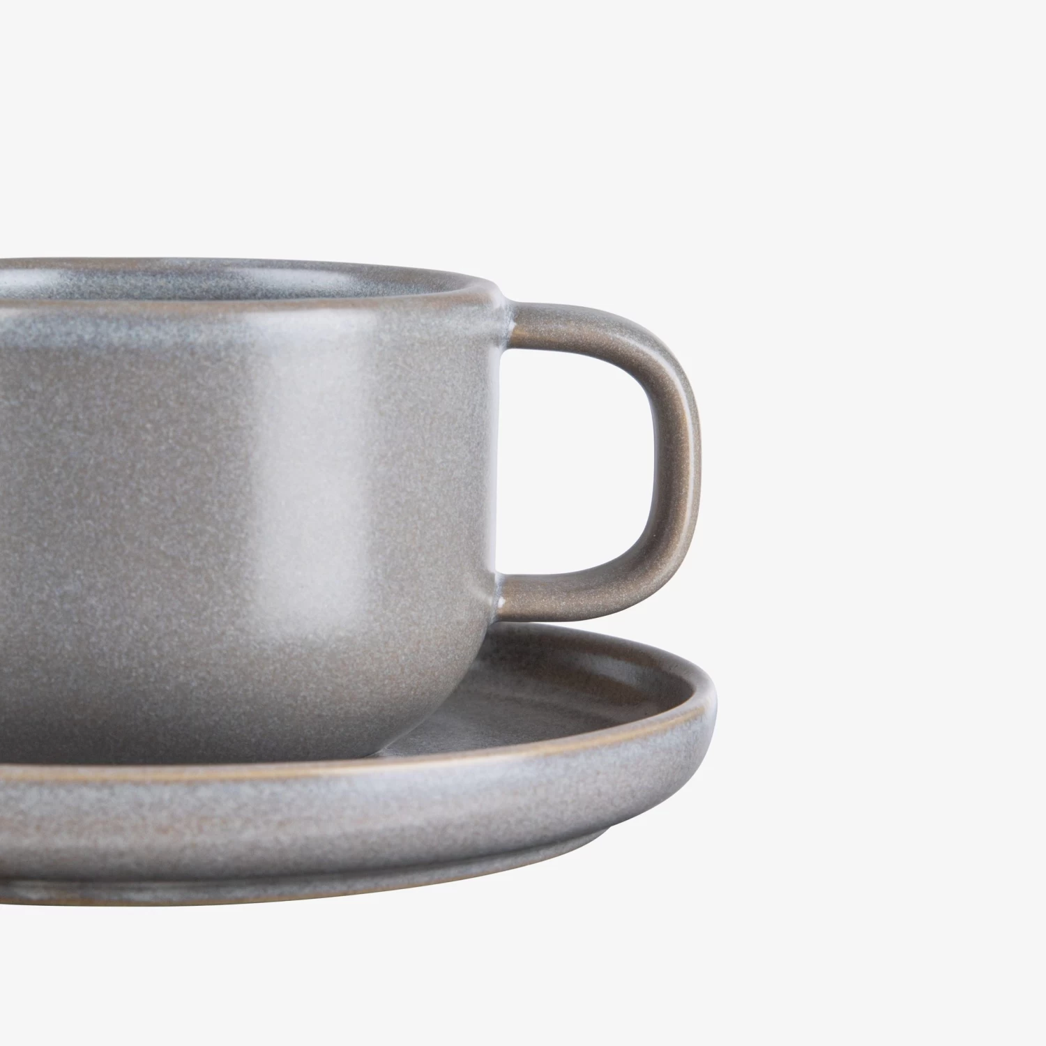 Stilvolle und haltbare Tasse und Untertasse aus grauem Steingut, die sich gut auf dem Esstisch zu Hause machen. Jede Tasse und jeder Unterteller kann in Farbe und Form variieren, da ein Teil des Produktionsprozesses von Hand ausgeführt wird. Anschließend wird das Steinzeug mit reaktiven Glasuren behandelt, die auch das Aussehen des Steinzeugs beeinflussen können. Vergiss nicht, das Steingut vor dem ersten Gebrauch mit warmem Wasser und Spülmittel zu waschen.