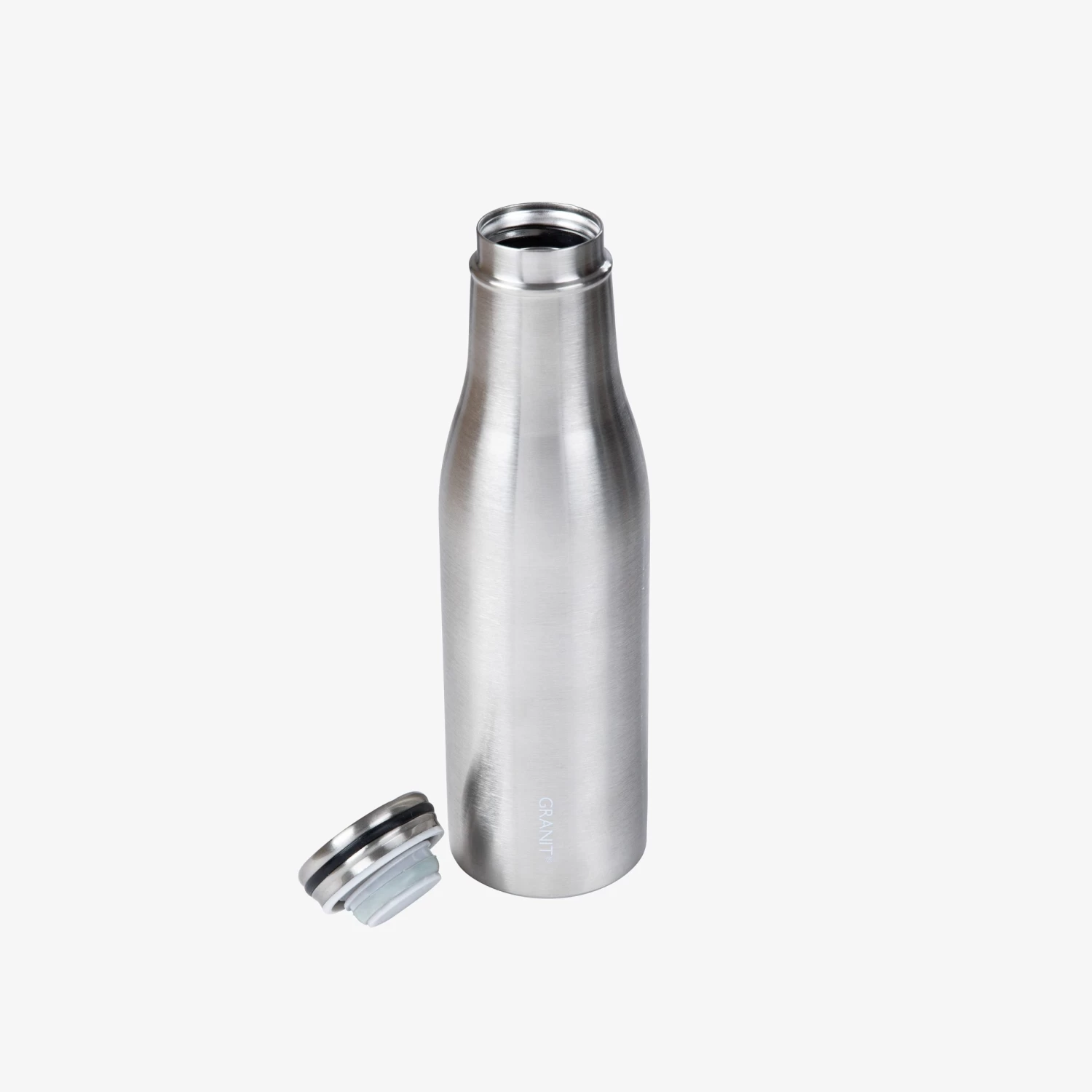 Thermosflasche aus Edelstahl mit Doppelwänden und Vakuumeffekt. Die Flasche hält dein Getränk lange Zeit kühl oder warm.