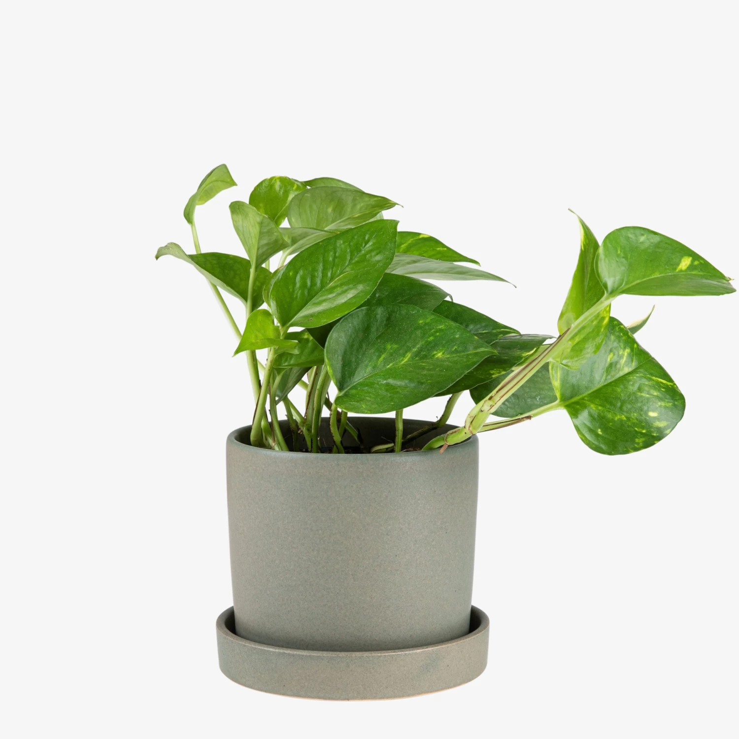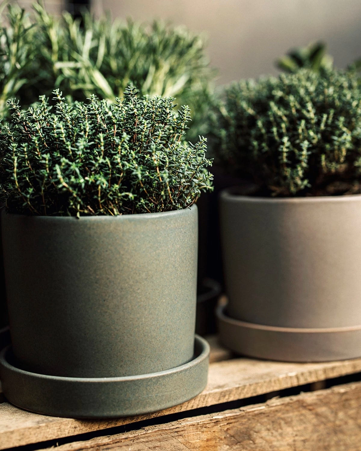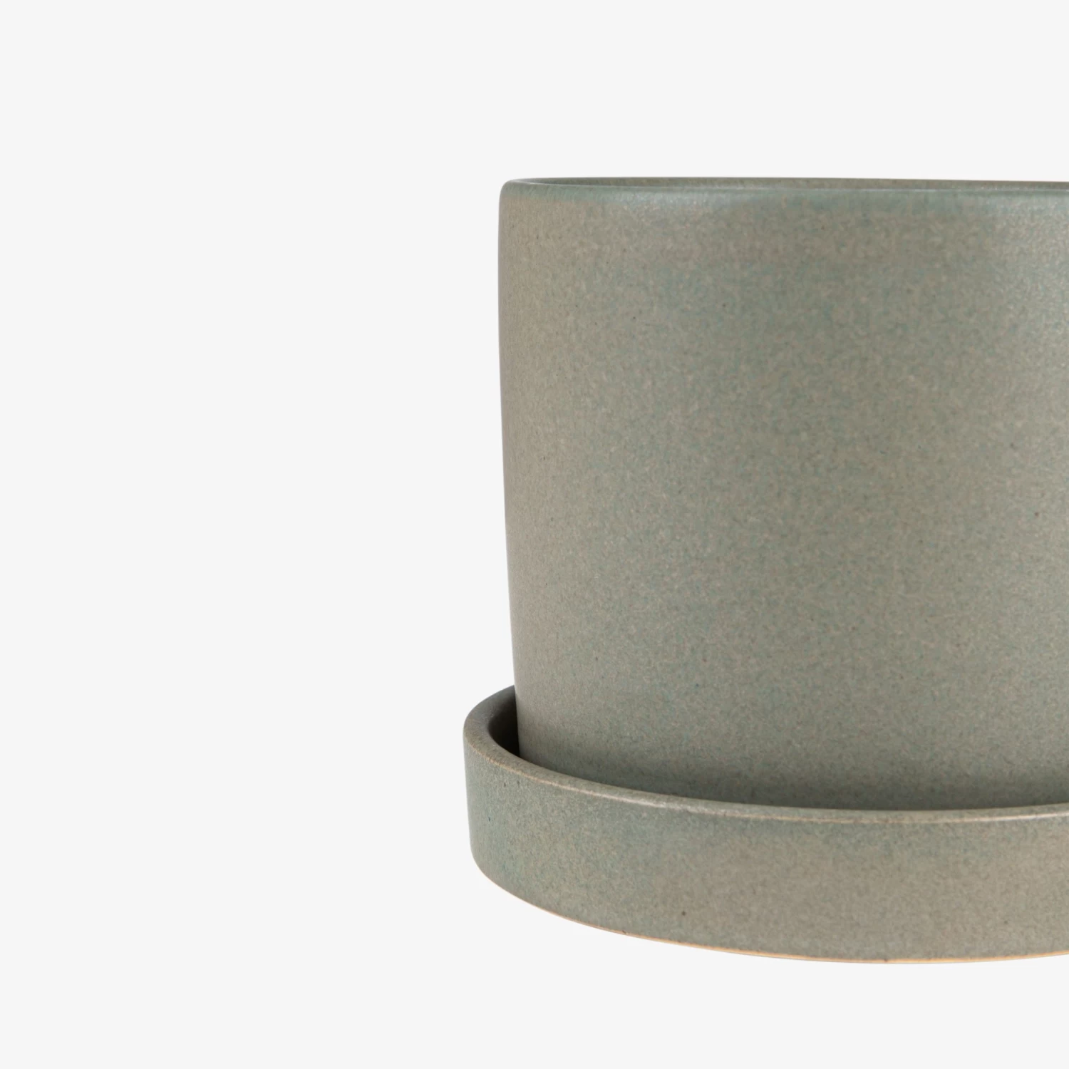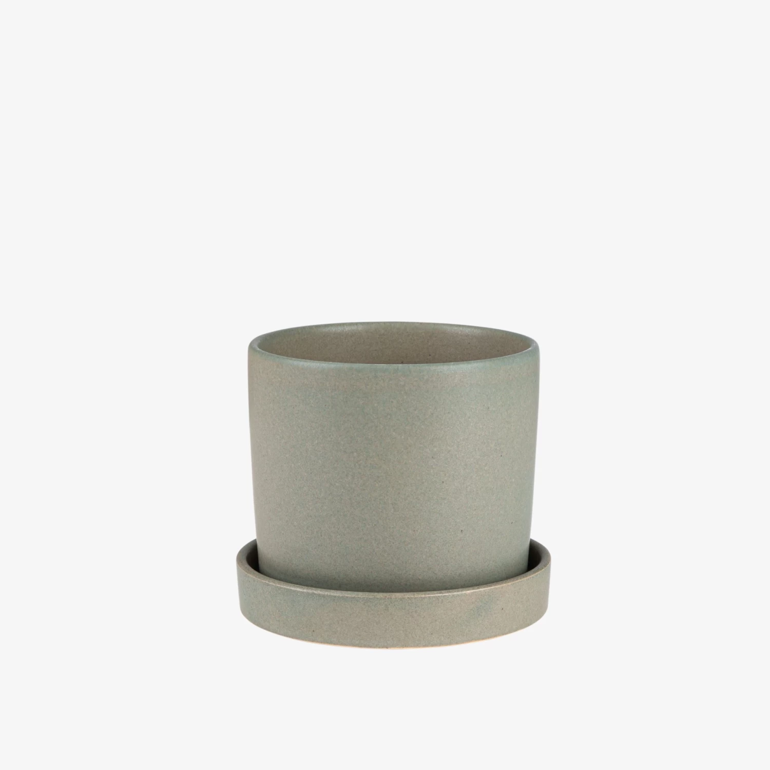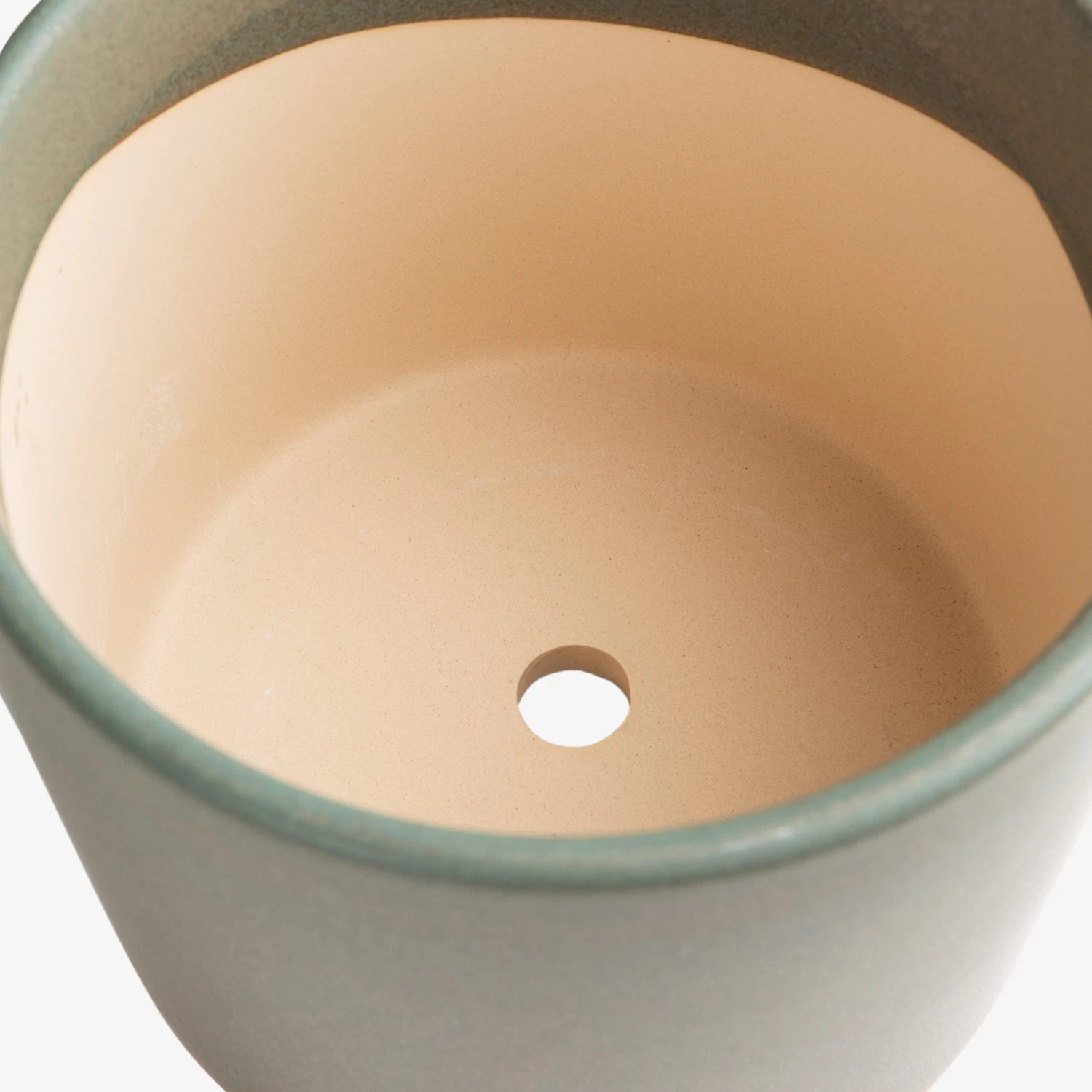 Stilvoller grüner Blumentopf in kleinerem Format aus Steingut mit dazugehöriger Schale. Der Topf hat ein Entwässerungsloch mit einem Plastikstopfen im Boden, ist sowohl frost- als auch wasserfest und kann sowohl im Haus als auch im Freien verwendet werden. Er ist einzeln oder in Kombination mit anderen Töpfen hübsch.