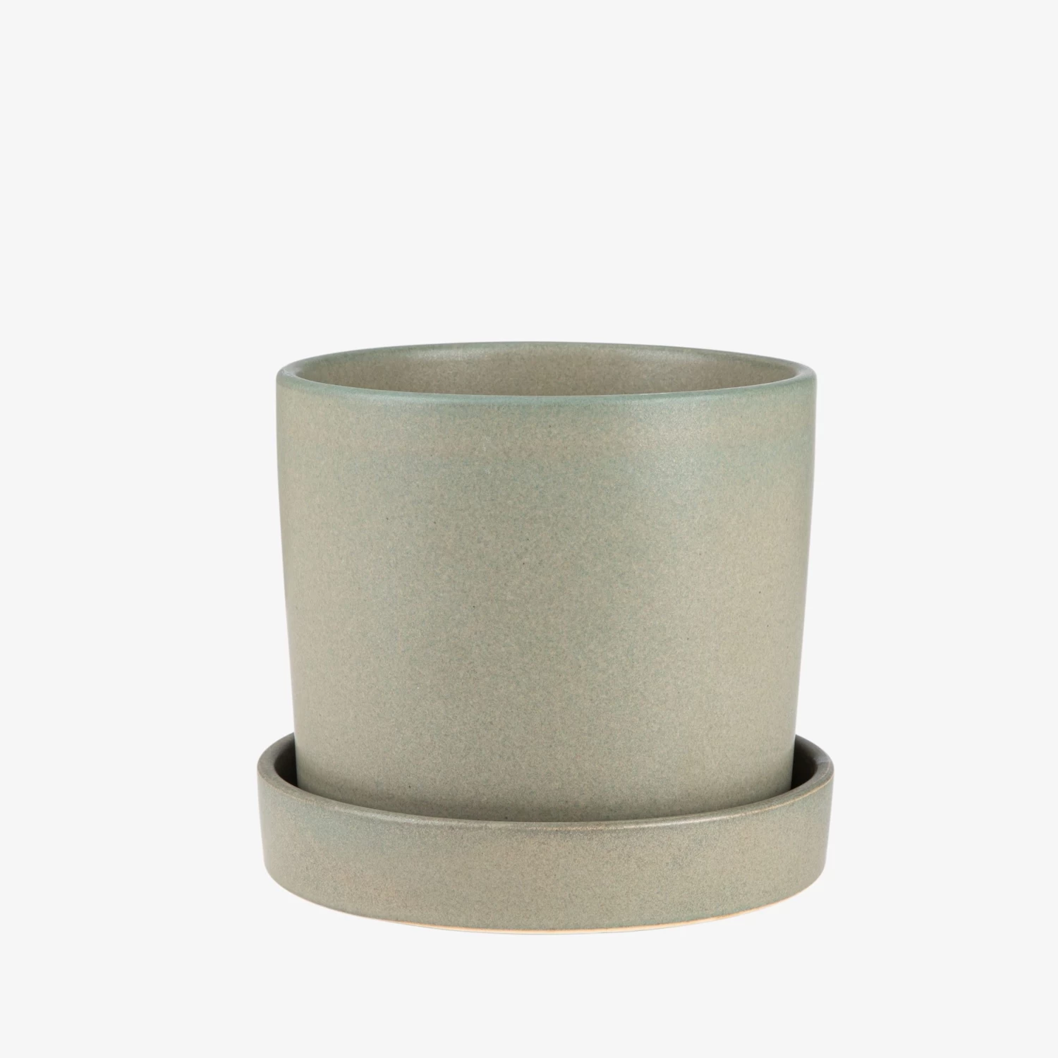 Hübscher, grüner Blumentopf in kleinerem Format aus Steingut mit dazugehöriger Schale. Der Topf hat ein Entwässerungsloch mit einem Plastikstopfen im Boden, ist sowohl frost- als auch wasserfest und kann sowohl im Haus als auch im Freien verwendet werden. Er ist einzeln oder in Kombination mit anderen Töpfen hübsch.