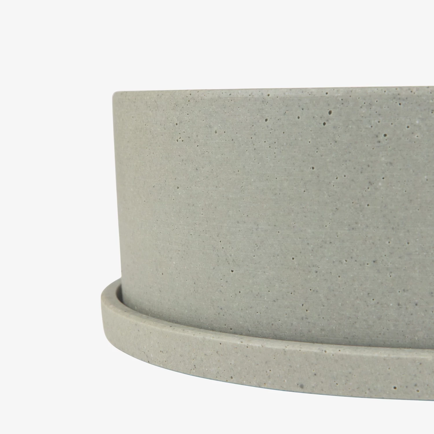 Niedriger, breiter Übertopf in Grün mit dazugehörigem Untersetzer aus Polystone, der sowohl für den Innen- als auch für den Außenbereich geeignet ist, da er wasser- und frostbeständig ist. Der Topf hat ein Abflussloch.