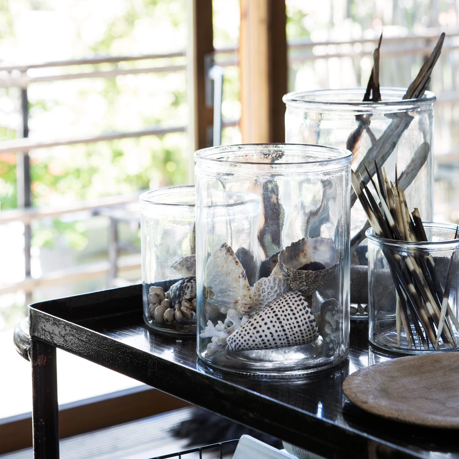 Zylindrische Vase aus Pressglas, das der Vase einen rustikalen und variierenden Finish verleiht. Erhältlich in vier Größen.