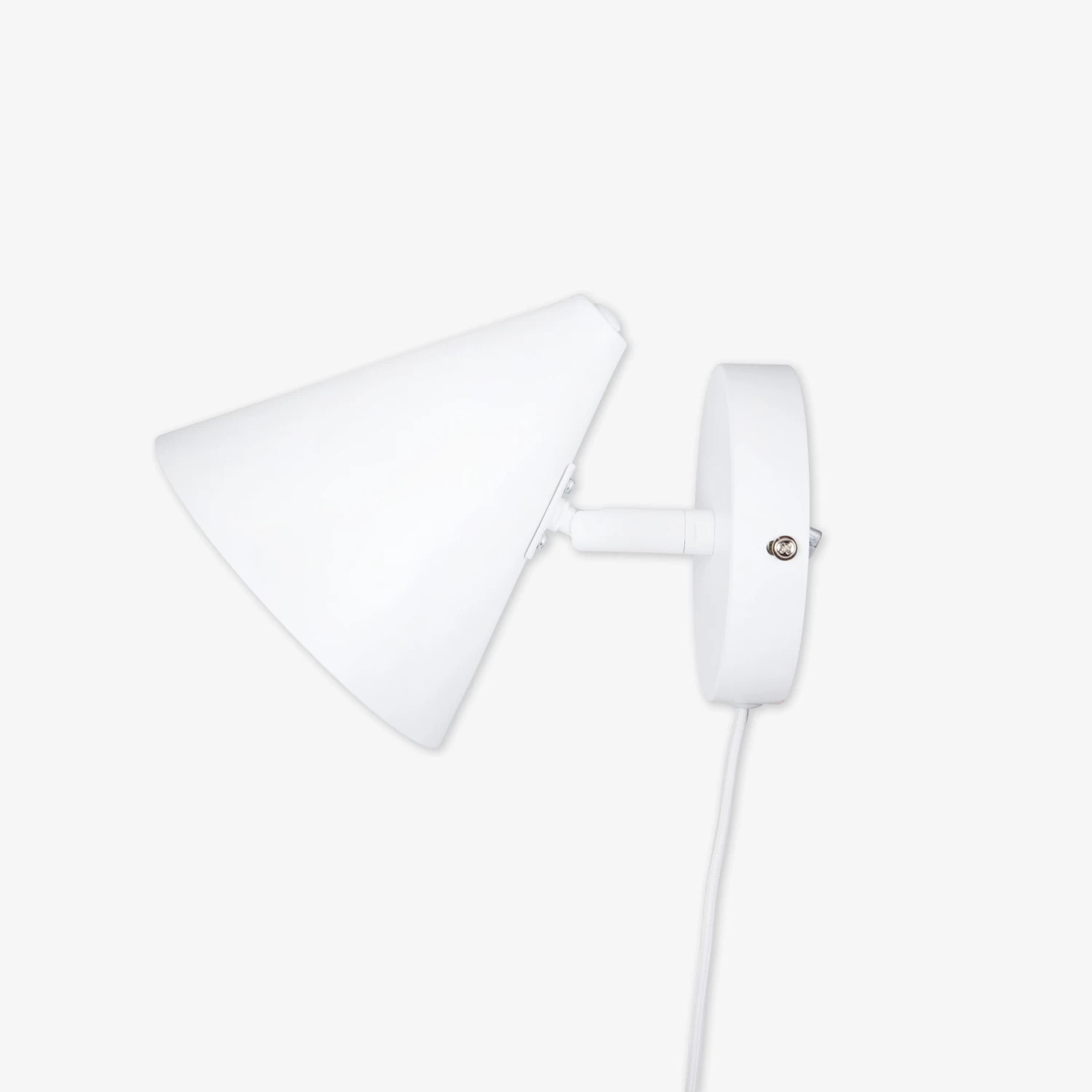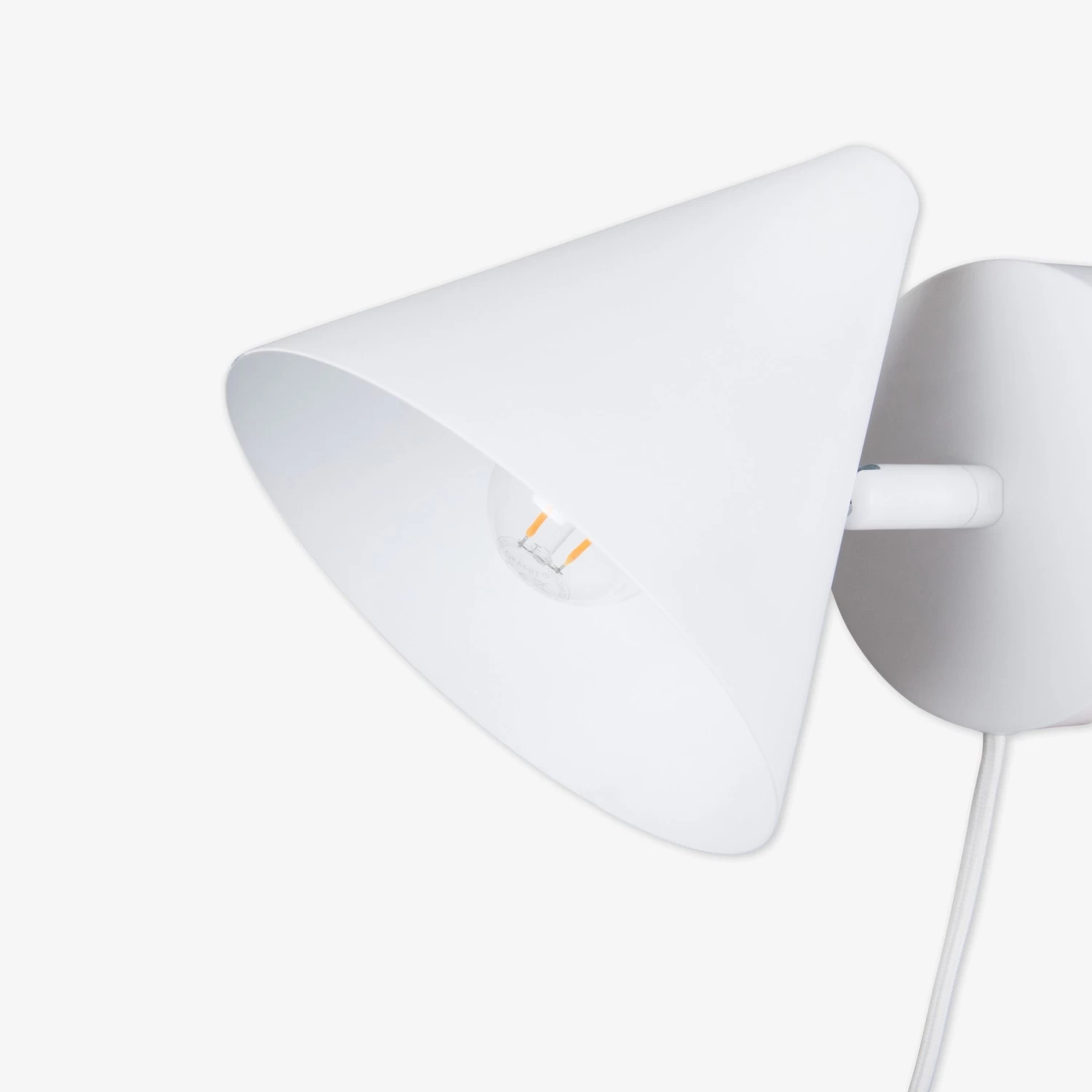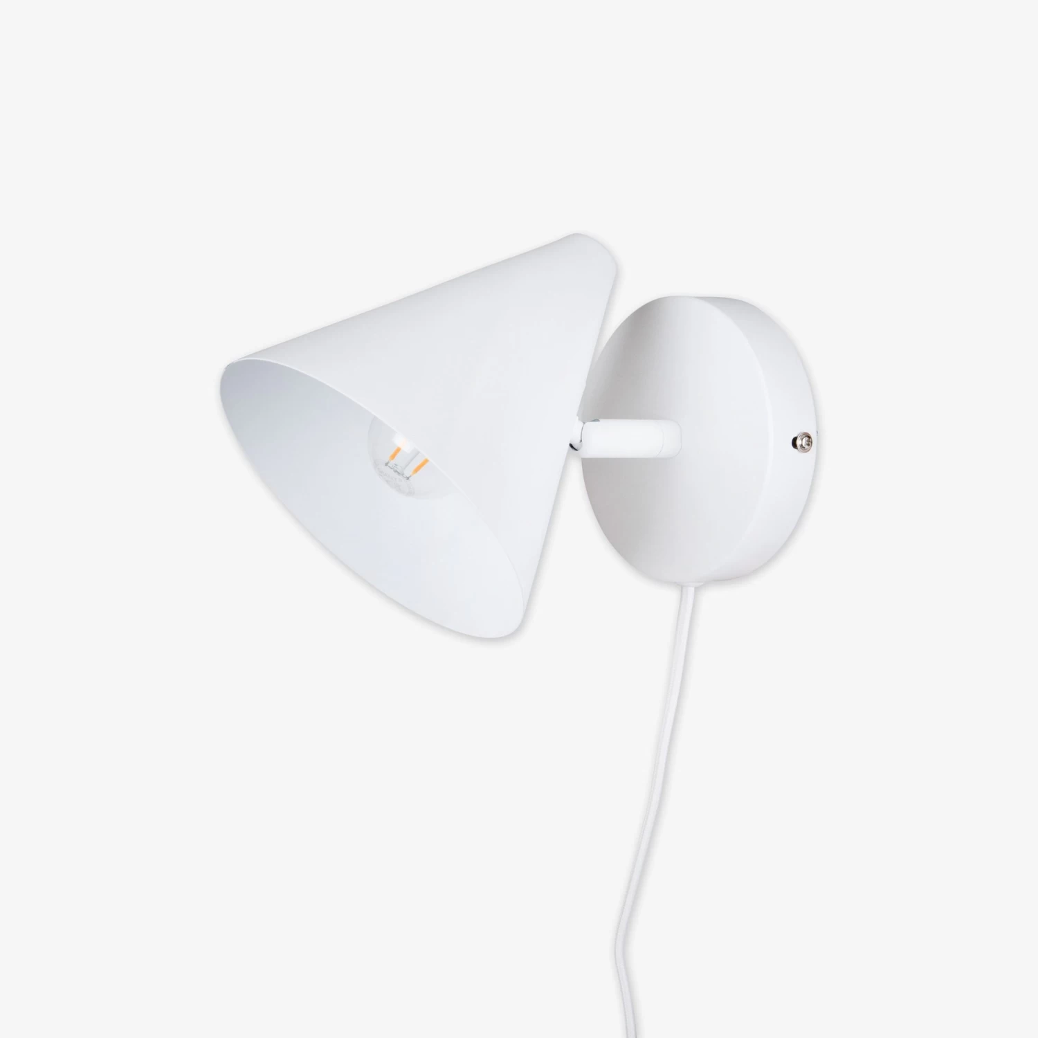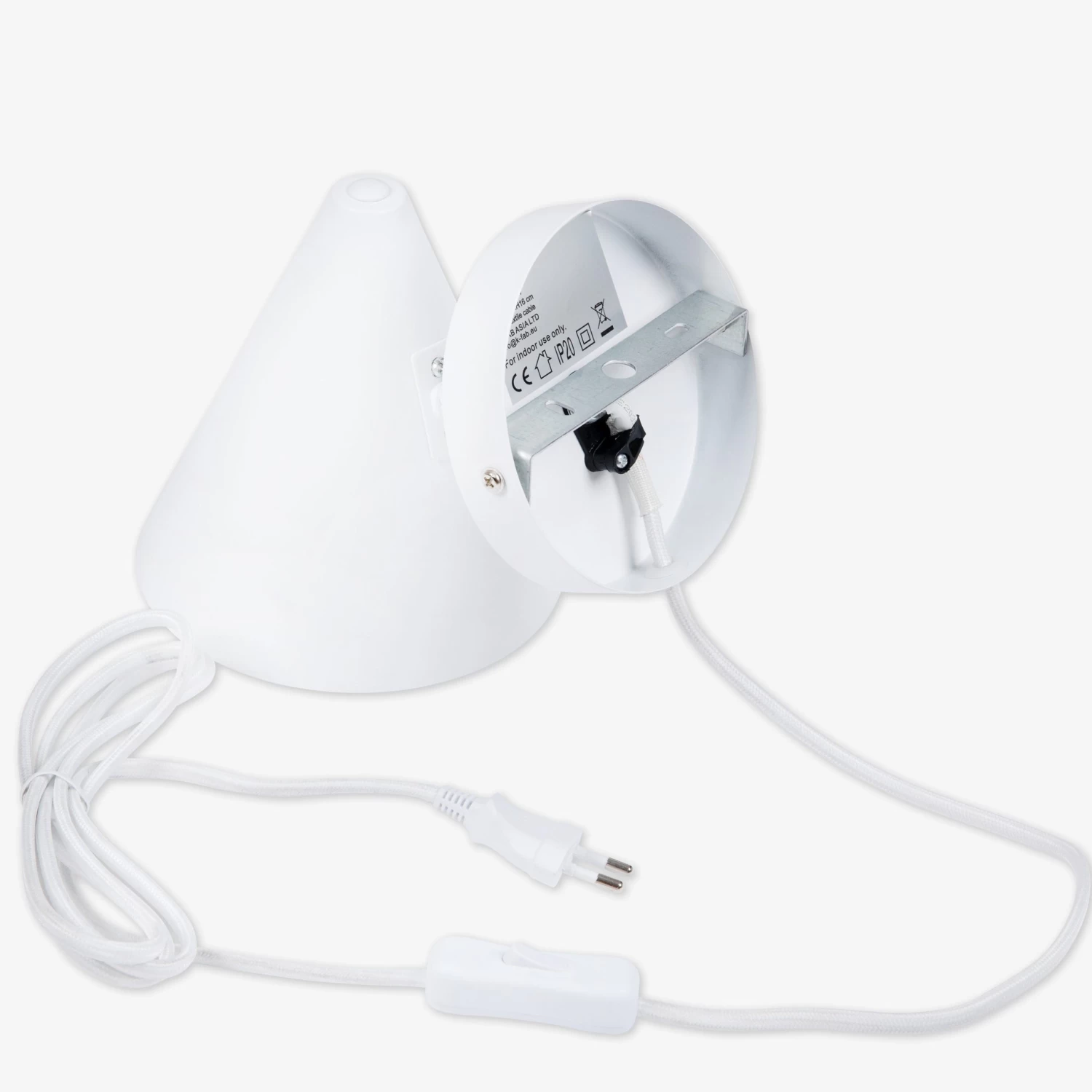 Konusförmige Wandleuchte aus matt lackiertem Metall. Die Leuchte hat ein weißes, textilummanteltes Kabel mit An-/Aus-Schalter und Netzstecker. Inklusive Halterung, max. 25 W. Leuchtmittel separat erhältlich, Sockel E14.Maße: L 23 B 15 H 16 cm, Schirmgröße: 15 x 14,5 cm.