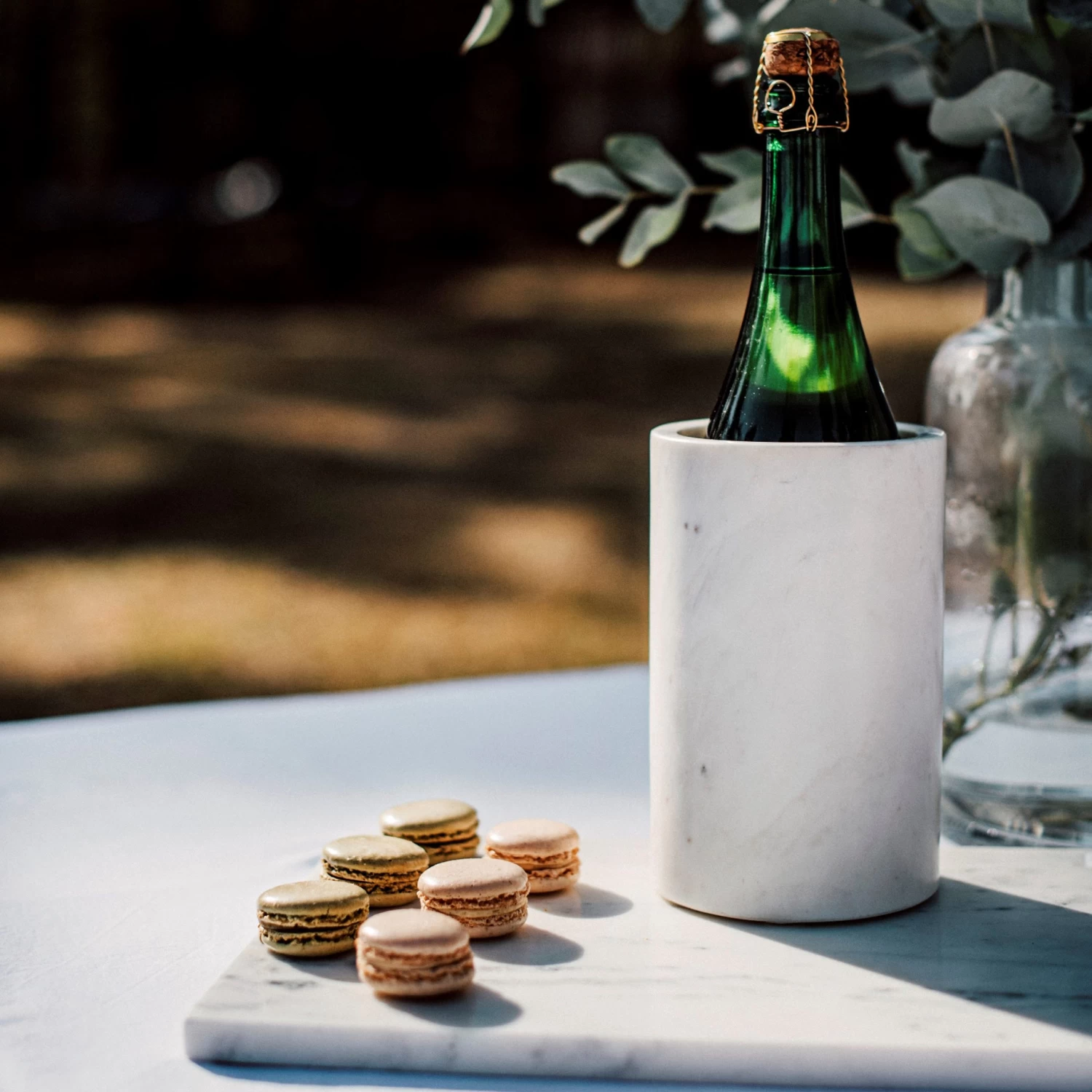 Vi gillar multifunktionella ting! Här har vi en vinkylare som också kan användas som en behållare för köksredskap. I samma kollektion av vit marmor hittar du flera snygga detaljer till köket.